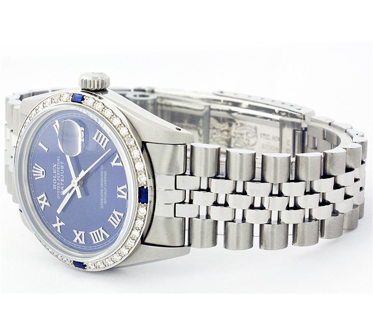 One Gents Rolex Datejust Polished, Serviced & Electronically Tested, Stainless Steel Case:36mm, Stainless Steel Crown, Custom Bezel: 18K White Gold Sapphire Beadset Diamond Bezel, Diamond + Gem Count: 36 Diamonds + 4 Sapphires Total Weight 1.00 Carat, Clarity: SI-VS, Color: G to H. Custom Crystal: Synthetic Sapphire Cyclops Lens. Movement: Automatic Winding Movement Caliber 3035. Custom Dial: Blue With Roman Hour Markers. Date Window: 3 O'Clock Position Date Display, Quickset, Model: 16014 Condition: G-6 Extra Fine. Bracelet: Stainless Steel Jubilee. Bright Polish & Satin Finish. 6.5 Inch Length, Adjustable. Standard Clasp, With Rolex Logo.