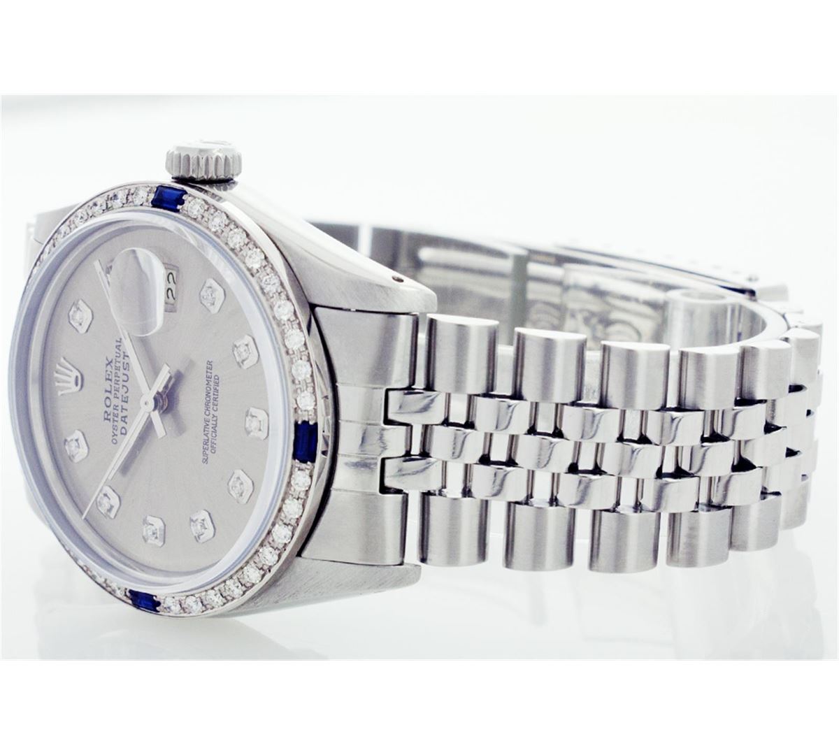 One Gents Rolex Datejust Polished Bright with Satin Finish, Serviced & Electronically Tested, Stainless Steel Case: 36mm, Stainless Steel Crown, Custom Bezel: 18K White Gold Sapphire Beadset Diamond Bezel, Diamond + Gem Count: 36 Diamonds + 4 Sapphires Total Weight 1.00 Carat, Clarity: SI-VS, Color: G to H. Custom Crystal: Synthetic Sapphire Cyclops Lens. Movement: Automatic Winding Movement Caliber 3035. Custom Dial: Slate Grey With Diamond Hour Markers, 10 Diamond Dial G To H In Color, Clarity: SI-VS. Date Window: 3 O'Clock Position Date Display, Quickset, Model: 16014 Condition: G-6 Extra Fine. Bracelet: Stainless Steel Jubilee. Bright Polish & Satin Finish. 6.5 Inch Length, Adjustable. Standard Clasp, With Rolex Logo.