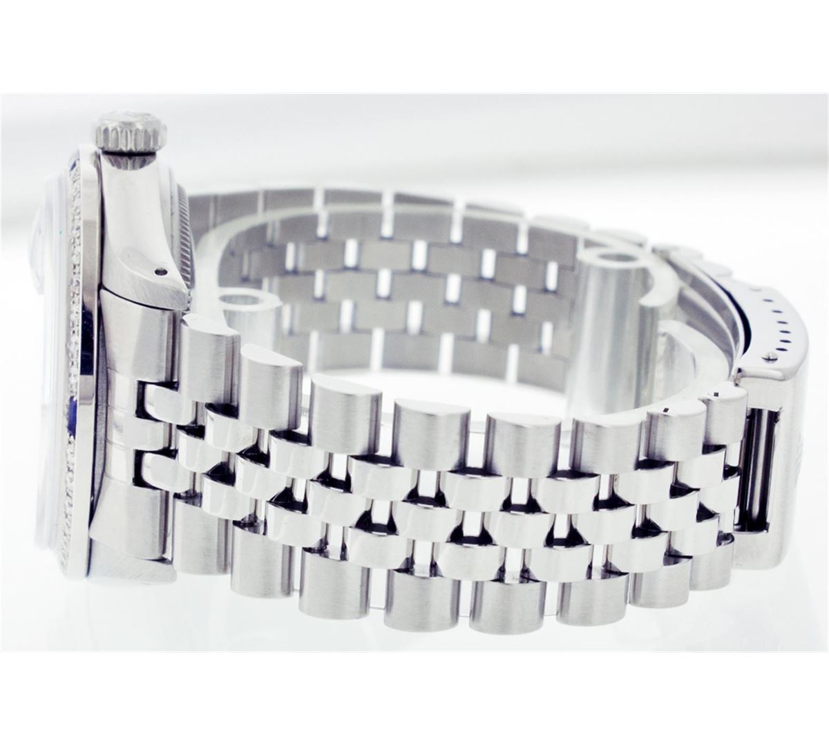 One Mens Rolex Datejust Polished Bright with Satin Finish, Serviced & Electronically Tested, Stainless Steel Case:36mm, Stainless Steel Crown, Custom Bezel: 18K White Gold Sapphire Beadset Diamond Bezel, Diamond + Gem Count: 36 Diamonds + 4 Sapphires Total Weight 1.00 Carat, Clarity: Si-VS, Color: G to H. Custom Crystal: Synthetic Sapphire Cyclops Lens. Movement: Automatic Winding Movement Caliber 3035. Custom Dial: Blue Vignette With Diamond Hour Markers, 10 Diamond in Dial G To H In Color, Si-VS Clarity. Date Window: 3 O'Clock Position Date Display, Quickset, Model: 16014 Condition: G-6 Extra Fine. Bracelet: Stainless Steel Jubilee. Bright Polish & Satin Finish. 6.5 Inch Length, Adjustable. Standard Clasp, With Rolex Logo.