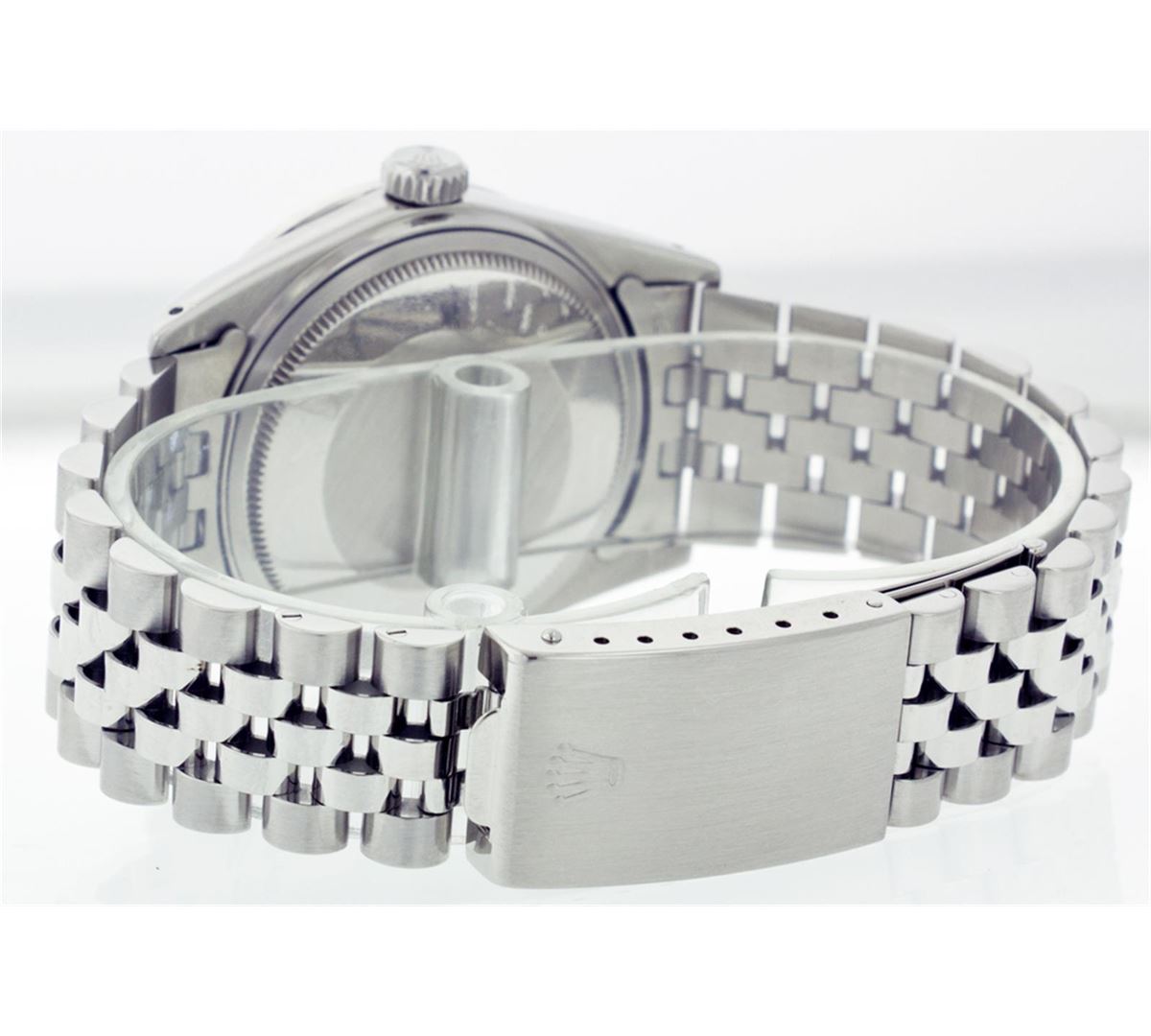 One Gents Rolex Datejust Polished Bright with Satin Finish, Serviced & Electronically Tested, Stainless Steel Case: 36mm, Stainless Steel Crown, Custom Bezel: 18K White Gold Sapphire Beadset Diamond Bezel, Diamond + Gem Count: 36 Diamonds + 4 Sapphires Total Weight 1.00 Carat, Clarity: SI-VS, Color: G to H. Custom Crystal: Synthetic Sapphire Cyclops Lens. Movement: Automatic Winding Movement Caliber 3035. Custom Dial: Purple With Diamond Hour Markers, 10 Diamond Dial G To H In Color. Date Window: 3 O'Clock Position Date Display, Quickset, Model: 16014 Condition: G-6 Extra Fine. Bracelet: Stainless Steel Jubilee. Bright Polish & Satin Finish. 6.5 Inch Length, Adjustable. Standard Clasp, With Rolex Logo.
