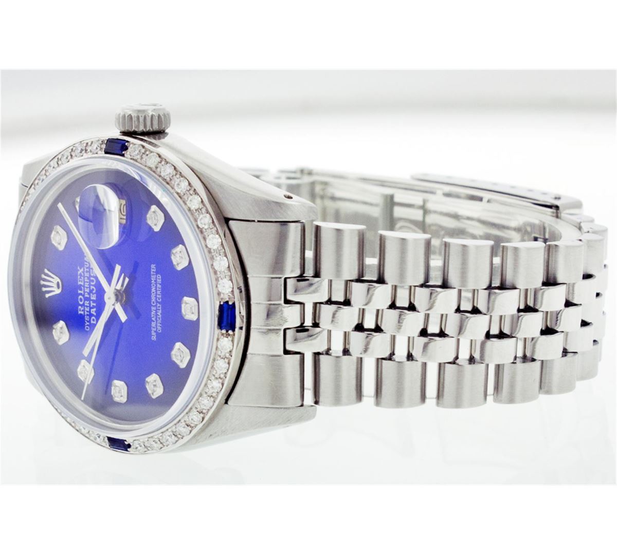 One Mens Rolex Datejust Polished Bright with Satin Finish, Serviced & Electronically Tested, Stainless Steel Case:36mm, Stainless Steel Crown, Custom Bezel: 18K White Gold Sapphire Beadset Diamond Bezel, Diamond + Gem Count: 36 Diamonds + 4 Sapphires Total Weight 1.00 Carat, Clarity: Si-VS, Color: G to H. Custom Crystal: Synthetic Sapphire Cyclops Lens. Movement: Automatic Winding Movement Caliber 3035. Custom Dial: Blue Vignette With Diamond Hour Markers, 10 Diamond in Dial G To H In Color, Si-VS Clarity. Date Window: 3 O'Clock Position Date Display, Quickset, Model: 16014 Condition: G-6 Extra Fine. Bracelet: Stainless Steel Jubilee. Bright Polish & Satin Finish. 6.5 Inch Length, Adjustable. Standard Clasp, With Rolex Logo.
