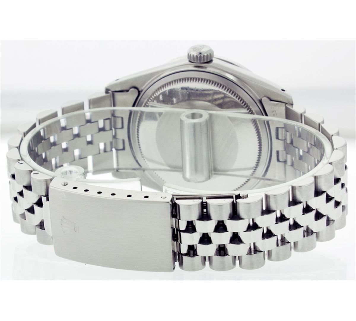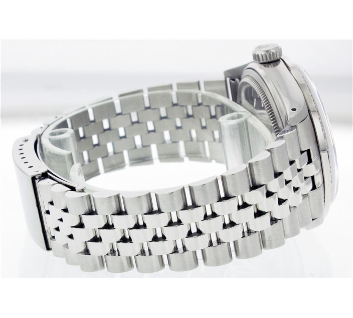 One Gents Rolex Datejust Polished Bright with Satin Finish, Serviced & Electronically Tested, Stainless Steel Case: 36mm, Stainless Steel Crown, Custom Bezel: 18K White Gold Sapphire Beadset Diamond Bezel, Diamond + Gem Count: 36 Diamonds + 4 Sapphires Total Weight 1.00 Carat, Clarity: SI-VS, Color: G to H. Custom Crystal: Synthetic Sapphire Cyclops Lens. Movement: Automatic Winding Movement Caliber 3035. Custom Dial: Purple With Diamond Hour Markers, 10 Diamond Dial G To H In Color. Date Window: 3 O'Clock Position Date Display, Quickset, Model: 16014 Condition: G-6 Extra Fine. Bracelet: Stainless Steel Jubilee. Bright Polish & Satin Finish. 6.5 Inch Length, Adjustable. Standard Clasp, With Rolex Logo.