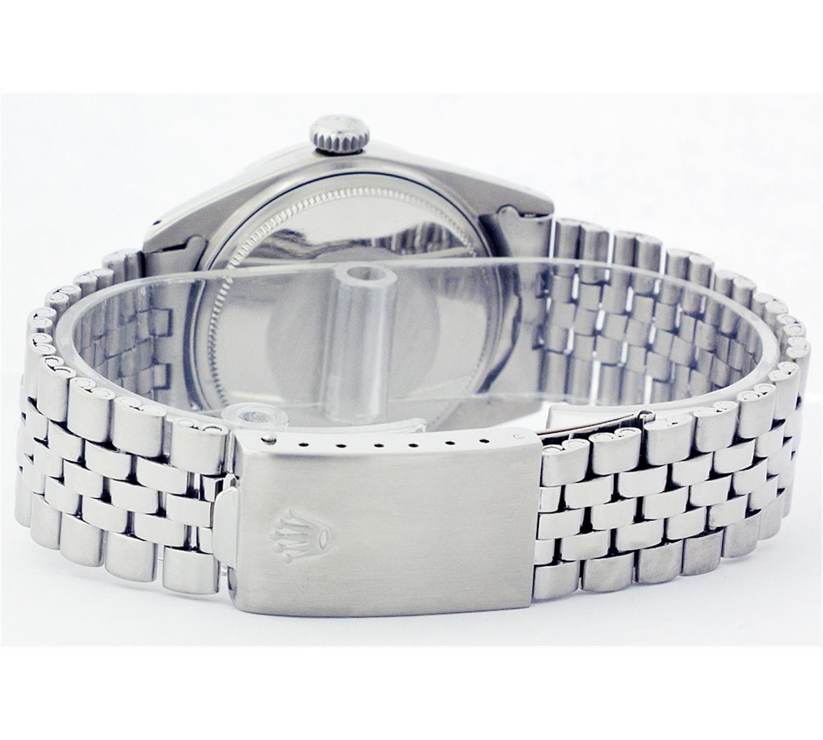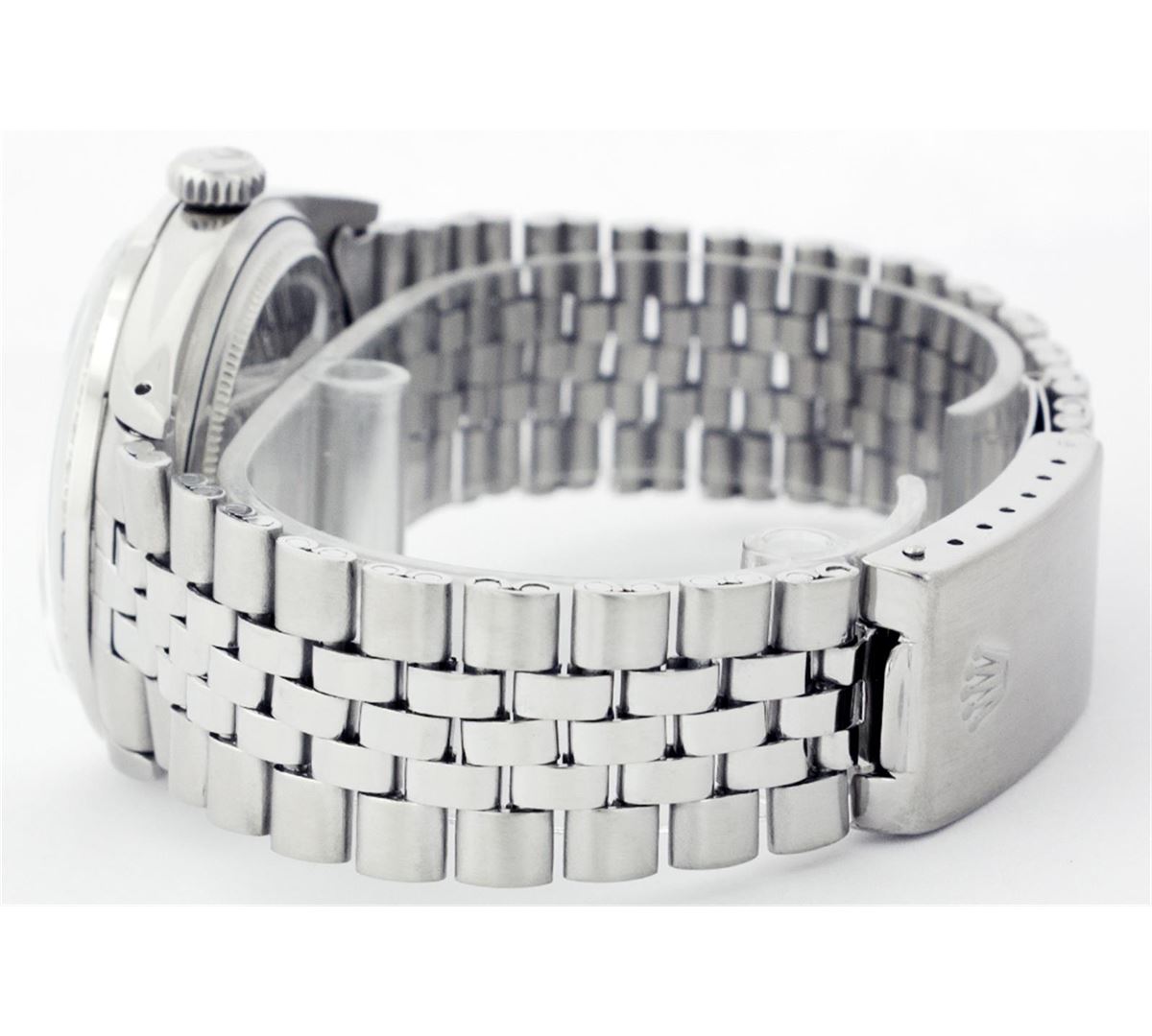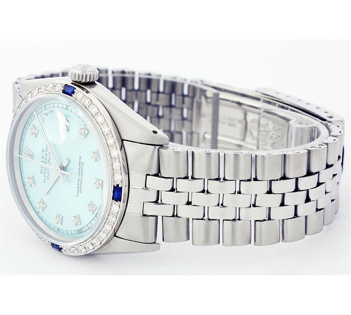 One Gents Rolex Datejust Polished, Serviced & Electronically Tested, Stainless Steel Case:36mm, Stainless Steel Crown, Custom Bezel: 18K White Gold Sapphire Beadset Diamond Bezel, Diamond + Gem Count: 36 Diamonds + 4 Sapphires Total Weight 1.00 Carat, Clarity: SI-VS, Color: G to H. Custom Crystal: Synthetic Sapphire Cyclops Lens. Movement: Automatic Winding Movement Caliber 3035. Custom Dial: Ice Blue With Diamond Hour Markers, 10 Diamond Dial G To H In Color, Clarity: SI-VS. Date Window: 3 O'Clock Position Date Display, Quickset, Model: 16014 Condition: G-6 Extra Fine. Bracelet: Stainless Steel Jubilee. Bright Polish & Satin Finish. 6.5 Inch Length, Adjustable. Standard Clasp, With Rolex Logo.