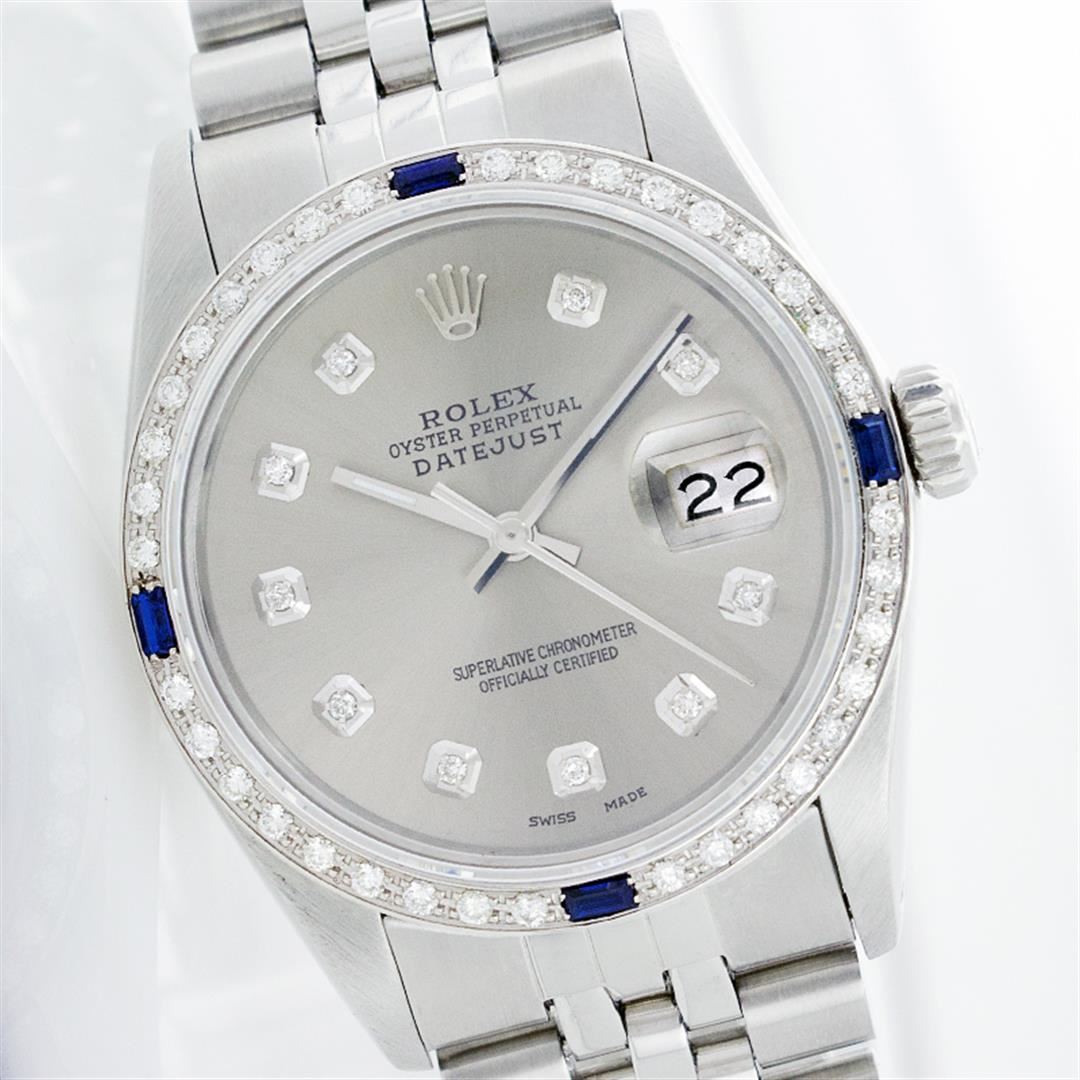 One Gents Rolex Datejust Polished Bright with Satin Finish, Serviced & Electronically Tested, Stainless Steel Case: 36mm, Stainless Steel Crown, Custom Bezel: 18K White Gold Sapphire Beadset Diamond Bezel, Diamond + Gem Count: 36 Diamonds + 4 Sapphires Total Weight 1.00 Carat, Clarity: SI-VS, Color: G to H. Custom Crystal: Synthetic Sapphire Cyclops Lens. Movement: Automatic Winding Movement Caliber 3035. Custom Dial: Slate Grey With Diamond Hour Markers, 10 Diamond Dial G To H In Color, Clarity: SI-VS. Date Window: 3 O'Clock Position Date Display, Quickset, Model: 16014 Condition: G-6 Extra Fine. Bracelet: Stainless Steel Jubilee. Bright Polish & Satin Finish. 6.5 Inch Length, Adjustable. Standard Clasp, With Rolex Logo.