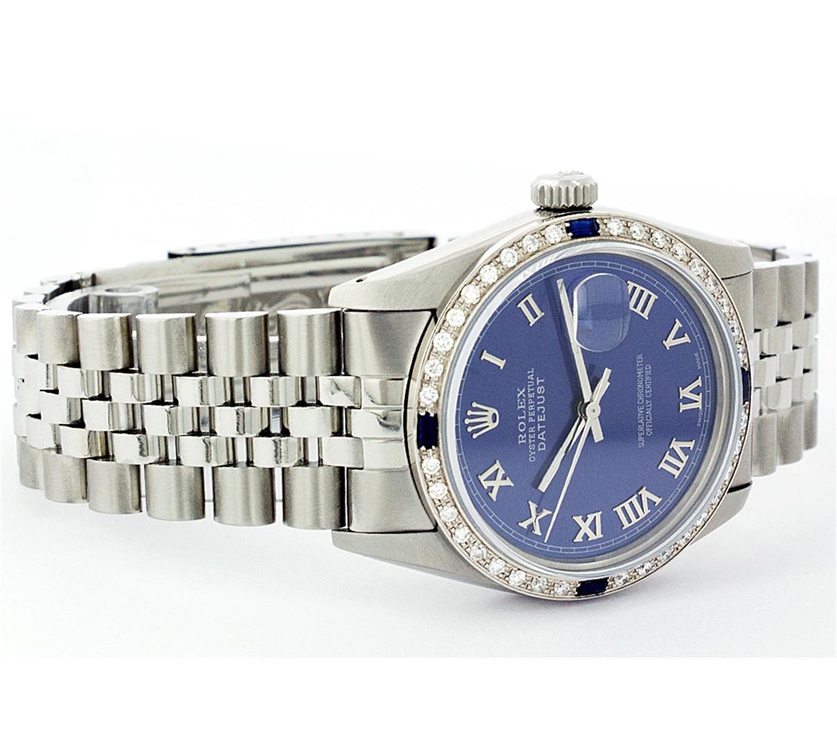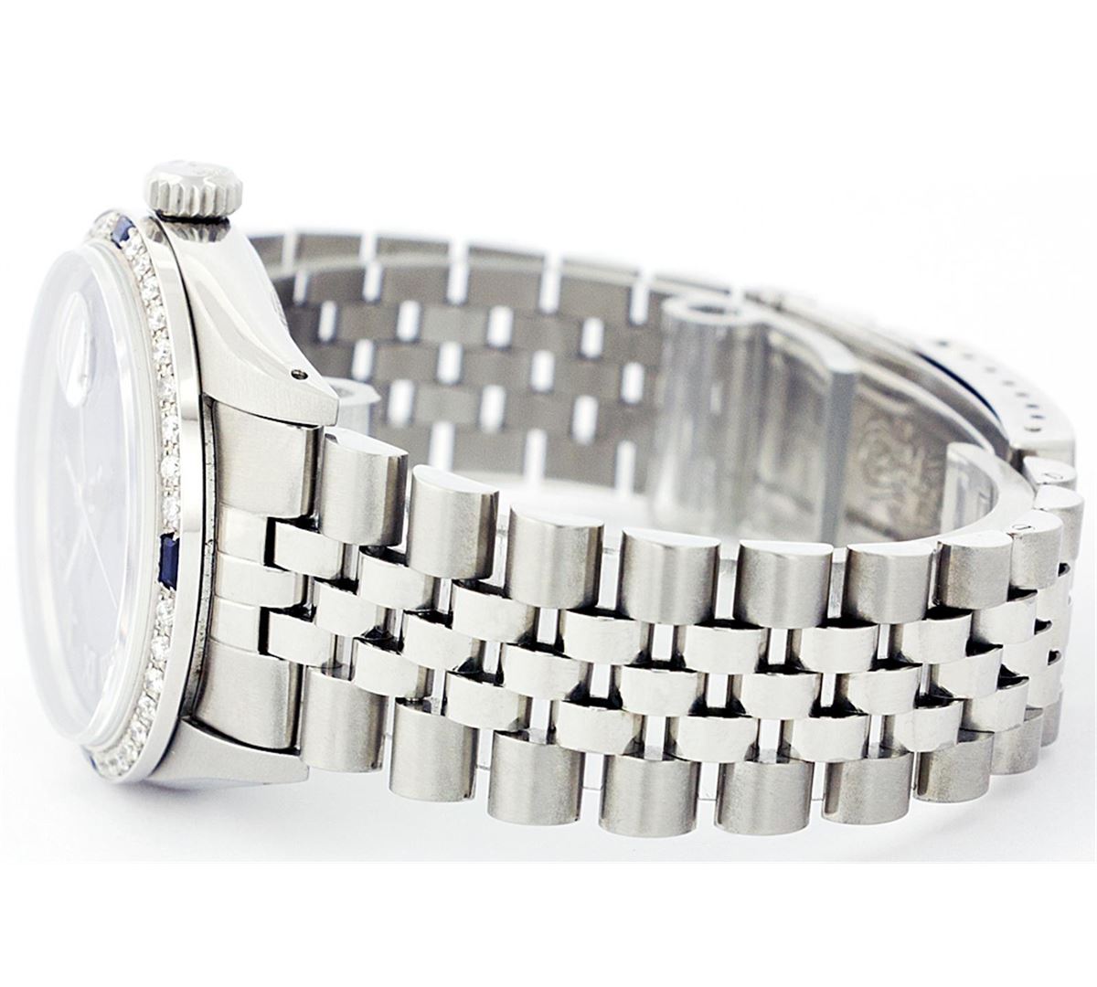 One Gents Rolex Datejust Polished, Serviced & Electronically Tested, Stainless Steel Case:36mm, Stainless Steel Crown, Custom Bezel: 18K White Gold Sapphire Beadset Diamond Bezel, Diamond + Gem Count: 36 Diamonds + 4 Sapphires Total Weight 1.00 Carat, Clarity: SI-VS, Color: G to H. Custom Crystal: Synthetic Sapphire Cyclops Lens. Movement: Automatic Winding Movement Caliber 3035. Custom Dial: Blue With Roman Hour Markers. Date Window: 3 O'Clock Position Date Display, Quickset, Model: 16014 Condition: G-6 Extra Fine. Bracelet: Stainless Steel Jubilee. Bright Polish & Satin Finish. 6.5 Inch Length, Adjustable. Standard Clasp, With Rolex Logo.