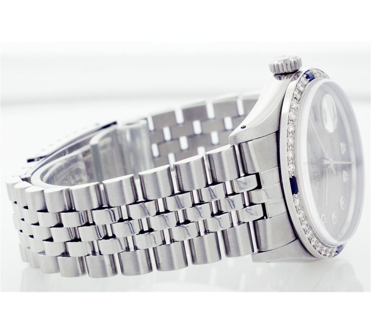 One Gents Rolex Datejust Polished Bright with Satin Finish, Serviced & Electronically Tested, Stainless Steel Case: 36mm, Stainless Steel Crown, Custom Bezel: 18K White Gold Sapphire Beadset Diamond Bezel, Diamond + Gem Count: 36 Diamonds + 4 Sapphires Total Weight 1.00 Carat, Clarity: SI-VS, Color: G to H. Custom Crystal: Synthetic Sapphire Cyclops Lens. Movement: Automatic Winding Movement Caliber 3035. Custom Dial: Slate Grey With Diamond Hour Markers, 10 Diamond Dial G To H In Color, Clarity: SI-VS. Date Window: 3 O'Clock Position Date Display, Quickset, Model: 16014 Condition: G-6 Extra Fine. Bracelet: Stainless Steel Jubilee. Bright Polish & Satin Finish. 6.5 Inch Length, Adjustable. Standard Clasp, With Rolex Logo.