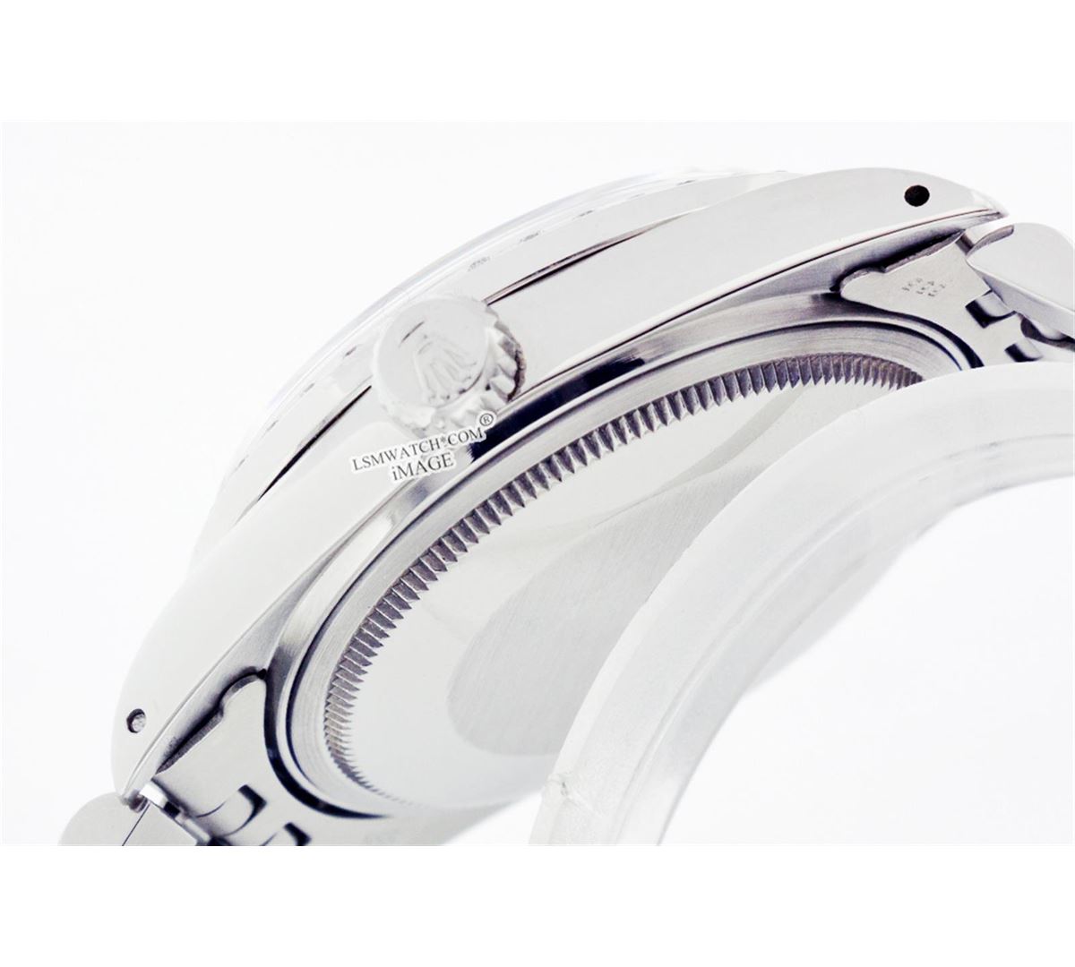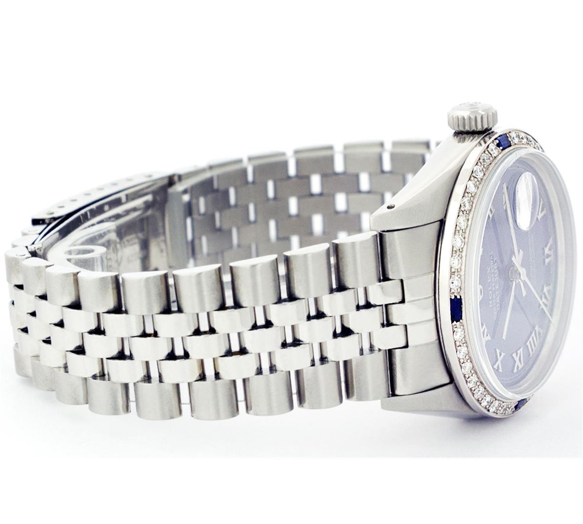 One Gents Rolex Datejust Polished, Serviced & Electronically Tested, Stainless Steel Case:36mm, Stainless Steel Crown, Custom Bezel: 18K White Gold Sapphire Beadset Diamond Bezel, Diamond + Gem Count: 36 Diamonds + 4 Sapphires Total Weight 1.00 Carat, Clarity: SI-VS, Color: G to H. Custom Crystal: Synthetic Sapphire Cyclops Lens. Movement: Automatic Winding Movement Caliber 3035. Custom Dial: Blue With Roman Hour Markers. Date Window: 3 O'Clock Position Date Display, Quickset, Model: 16014 Condition: G-6 Extra Fine. Bracelet: Stainless Steel Jubilee. Bright Polish & Satin Finish. 6.5 Inch Length, Adjustable. Standard Clasp, With Rolex Logo.
