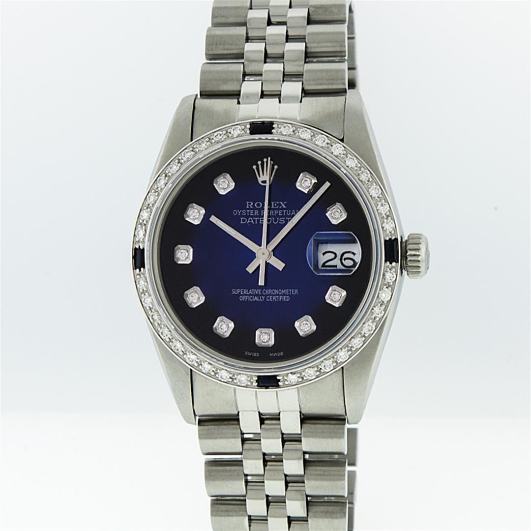 One Mens Rolex Datejust Polished Bright with Satin Finish, Serviced & Electronically Tested, Stainless Steel Case:36mm, Stainless Steel Crown, Custom Bezel: 18K White Gold Sapphire Beadset Diamond Bezel, Diamond + Gem Count: 36 Diamonds + 4 Sapphires Total Weight 1.00 Carat, Clarity: Si-VS, Color: G to H. Crystal: Synthetic Sapphire Cyclops Lens. Movement: Automatic Winding Movement Caliber 3135. Custom Dial: Blue Vignette With Diamond Hour Markers, 10 Diamond in Dial G To H In Color, Si-VS Clarity. Date Window: 3 O'Clock Position Date Display, Quickset, Model: 16234 Condition: G-6 Extra Fine. Bracelet: Stainless Steel Jubilee. Bright Polish & Satin Finish. 6.5 Inch Length, Adjustable. Standard Clasp, With Rolex Logo.