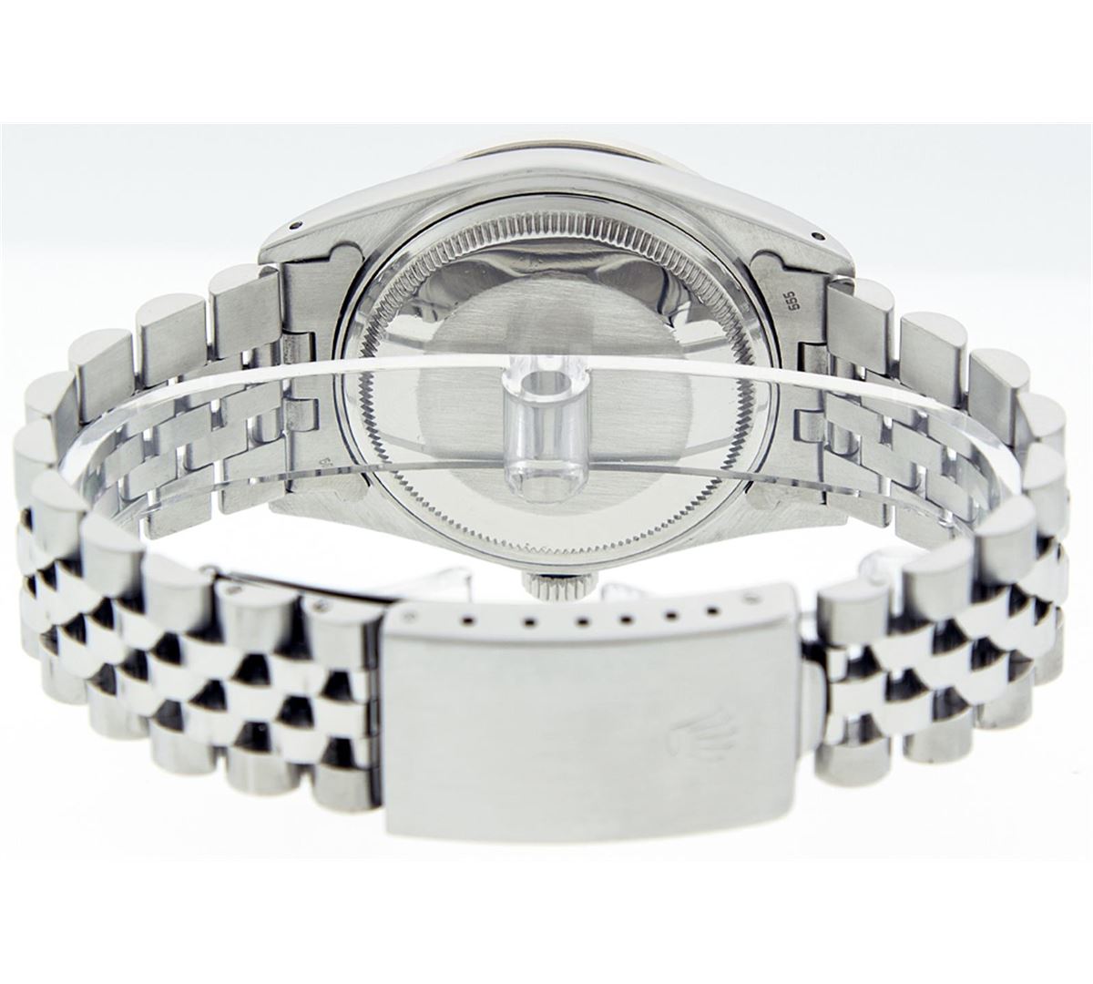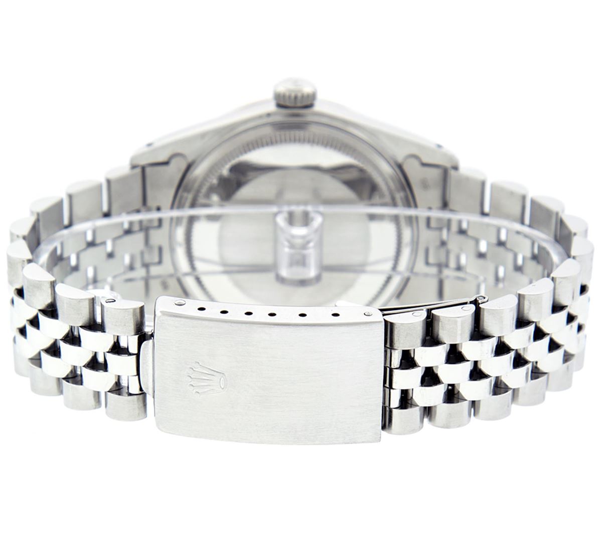 One Mens Rolex Datejust Polished Bright with Satin Finish, Serviced & Electronically Tested, Stainless Steel Case: 36mm, Stainless Steel Crown, Custom Bezel: 18K White Gold Sapphire Beadset Diamond Bezel, Diamond + Gem Count: 36 Diamonds + 4 Sapphires Total Weight 1.00 Carat, Clarity: SI-VS, Color: G to H. Custom Crystal: Synthetic Sapphire Cyclops Lens. Movement: Automatic Winding Movement Caliber 3135. Custom Dial: Slate Grey With Diamond Hour Markers, 10 Diamond Dial G To H In Color, Clarity: SI-VS. Date Window: 3 O'Clock Position Date Display, Quickset, Model: 16234 Condition: G-6 Extra Fine. Bracelet: Stainless Steel Jubilee. Bright Polish & Satin Finish. 6.5 Inch Length, Adjustable. Standard Clasp, With Rolex Logo.