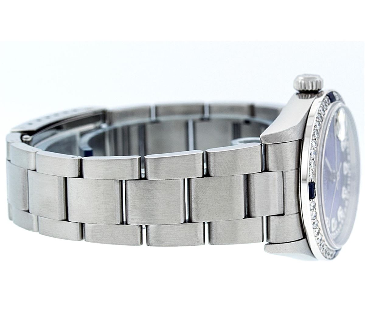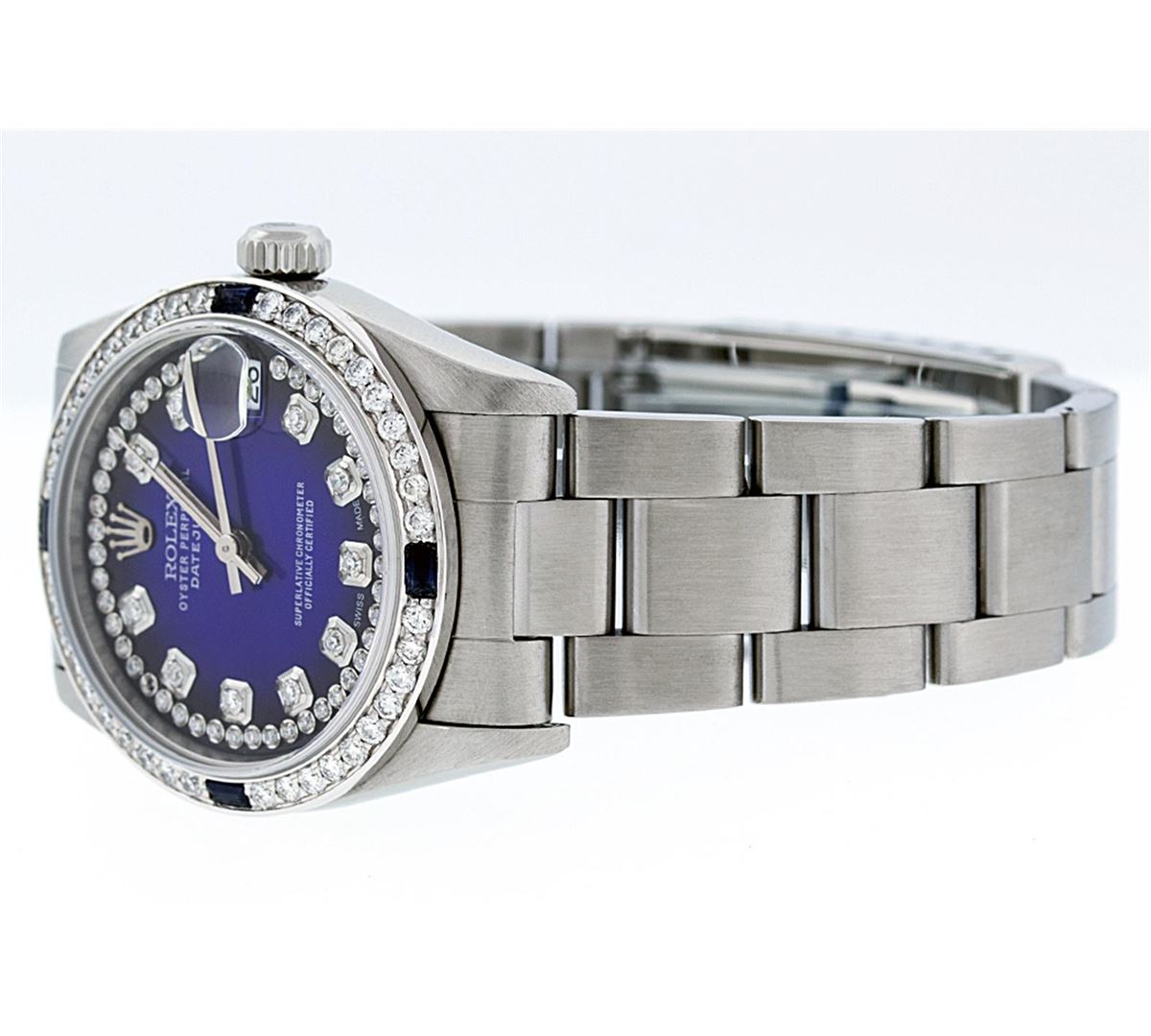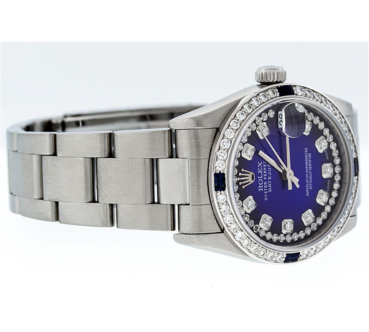 One Midsize Stainless Steel Rolex Datejust Polished, Serviced & Electronically Tested, Stainless Steel Case Case:31mm, Stainless Steel Crown, Custom Bezel: 18K White Gold Sapphire Beadset Bezel, Diamond Count: 40 Diamonds + 4 Sapphires, Total Weight: 1 Carat, Color: G To H, Clarity: VS2-SI1. Custom Crystal: Synthetic Sapphire Cyclops Lens. Movement: Automatic Winding Movement Caliber 2235. Custom Dial: Blue Vignette String Diamond Dial VVS. Color: G to H, Clarity: VVS, Date Window: 3 O'Clock Position Date Display, Quickset, Model: Midsize Datejust. Condition: G-6 Extra Fine. Bracelet: Stainless Steel Oyster Band. Bright Polish. 6.0 Inch Length, Adjustable. Standard Clasp, With Rolex Logo.