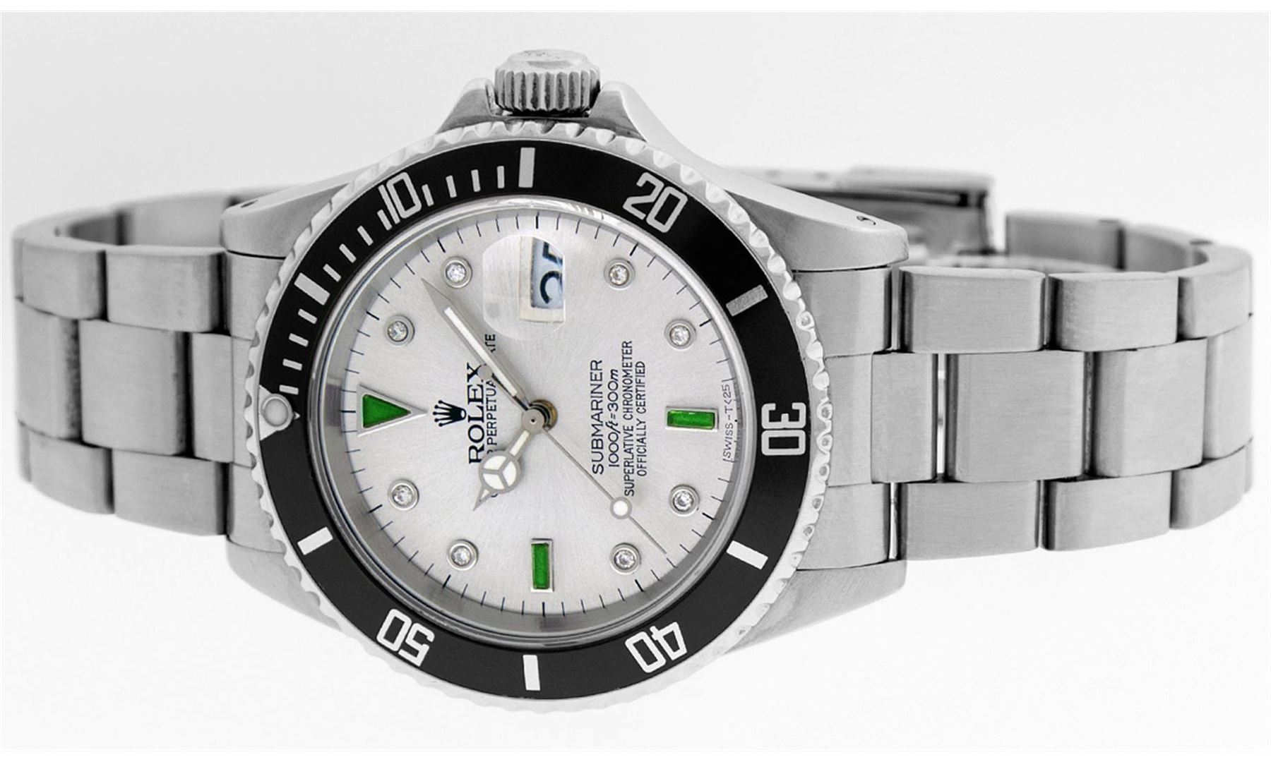 One Mens Rolex Submariner With Date Polished, Serviced & Electronically Tested, Stainless Steel Case:41mm, Stainless Steel Crown, Bezel: Stainless Steel Rotatable Bezel With Black Insert. Crystal: Synthetic Sapphire Cyclops Lens. Movement: Automatic Winding Movement Caliber 3135. Custom Dial: Silver Serti Diamond & Emerald Dial, Diamond Count: 8 Diamonds + 2 Baguette Emeralds, Color: G To H, Clarity: SI-VS. Date Window: 3 O'Clock Position Date Display, Model: Submariner 16610, Quickset, Condition: G-6 Extra Fine. Bracelet: Stainless Steel Oyster. Bright Polish & Satin Finish. 7.0 Inch Length, Adjustable. Standard Clasp, With Rolex Logo. Comes with 6 month warranty.