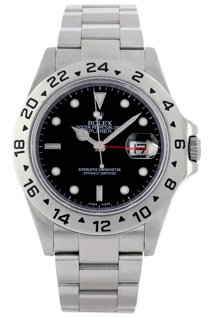 One Gents Rolex Explorer 2 Polished Bright with Satin Finish, Serviced & Electronically Tested, Stainless Steel Case:40mm, Stainless Steel Crown, Bezel: Stainless Steel Bezel. Crystal: Sapphire Lens. Movement: Automatic Winding Movement Caliber 3185. Dial: Black Explorer Dial With Red GMT Hand. Date Window: 3 O'Clock Position Date Display, Quickset, Model: 16570 Condition: G-6 Extra Fine. Bracelet: Stainless Steel Oyster. Bright Polish & Satin Finish. 6.5 Inch Length, Adjustable. Standard Clasp, With Rolex Logo.