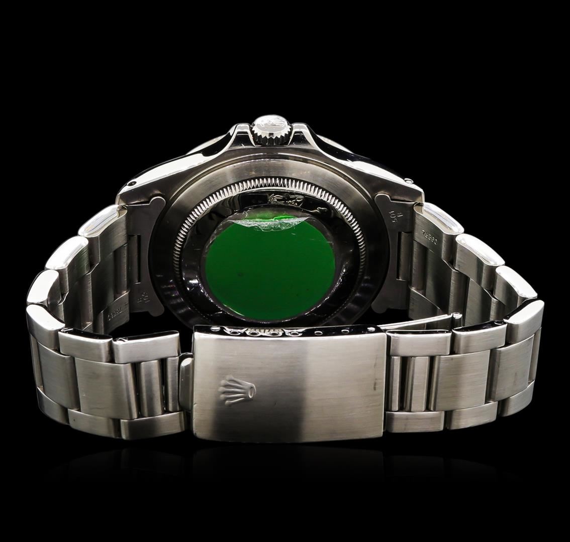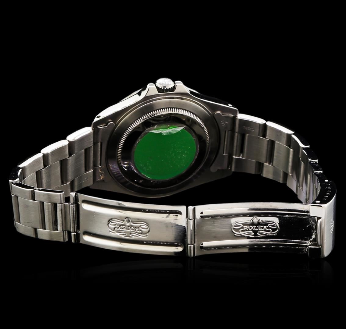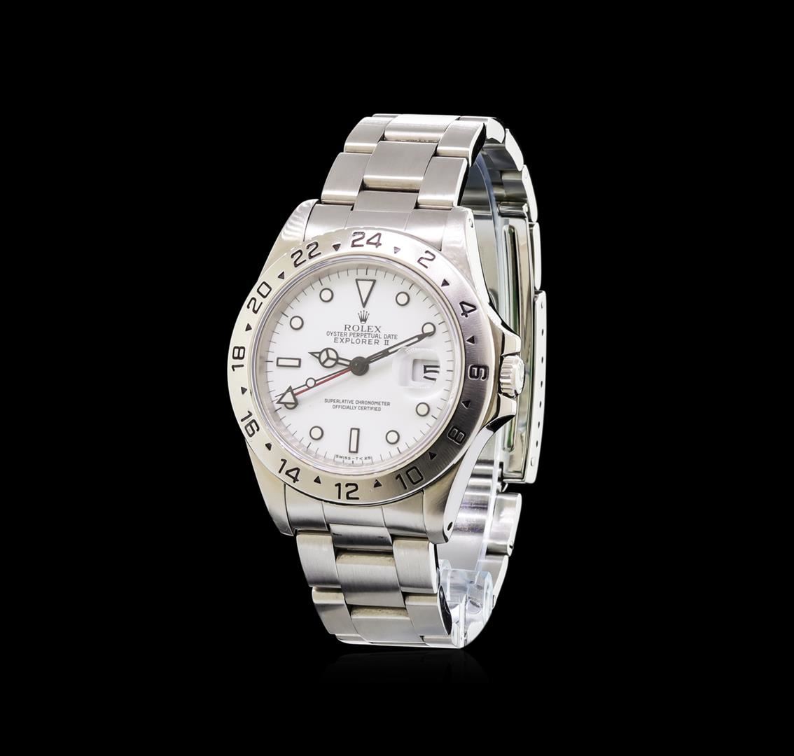 One gents, hand crafted & machine milled Rolex Stainless Steel Explorer II wristwatch electronically tested, Case: 40mm oyster, Scalloped Crown: twinlock with logo, set within protective shoulders, Fixed 24 Hour Bezel: engraved with numerals and indices, Crystal: synthetic sapphire cyclops lens. Movement: superlative chronometer, Rolex signed Dial: White Porcelain color; with luminous hands & indices, and both a 24 hour hand, and an independent 12 hour hand, Circa: 1991, Calendar: 3 o'clock position date window, Rolex Bracelet: stainless steel oyster, Condition: G-6 Extra Fine. Seven and three quarter inch length adjustable. Standard flip lock clasp, with logo. Total Weight of Watch 119.53gm. AIG Appraised at $6,050.00.