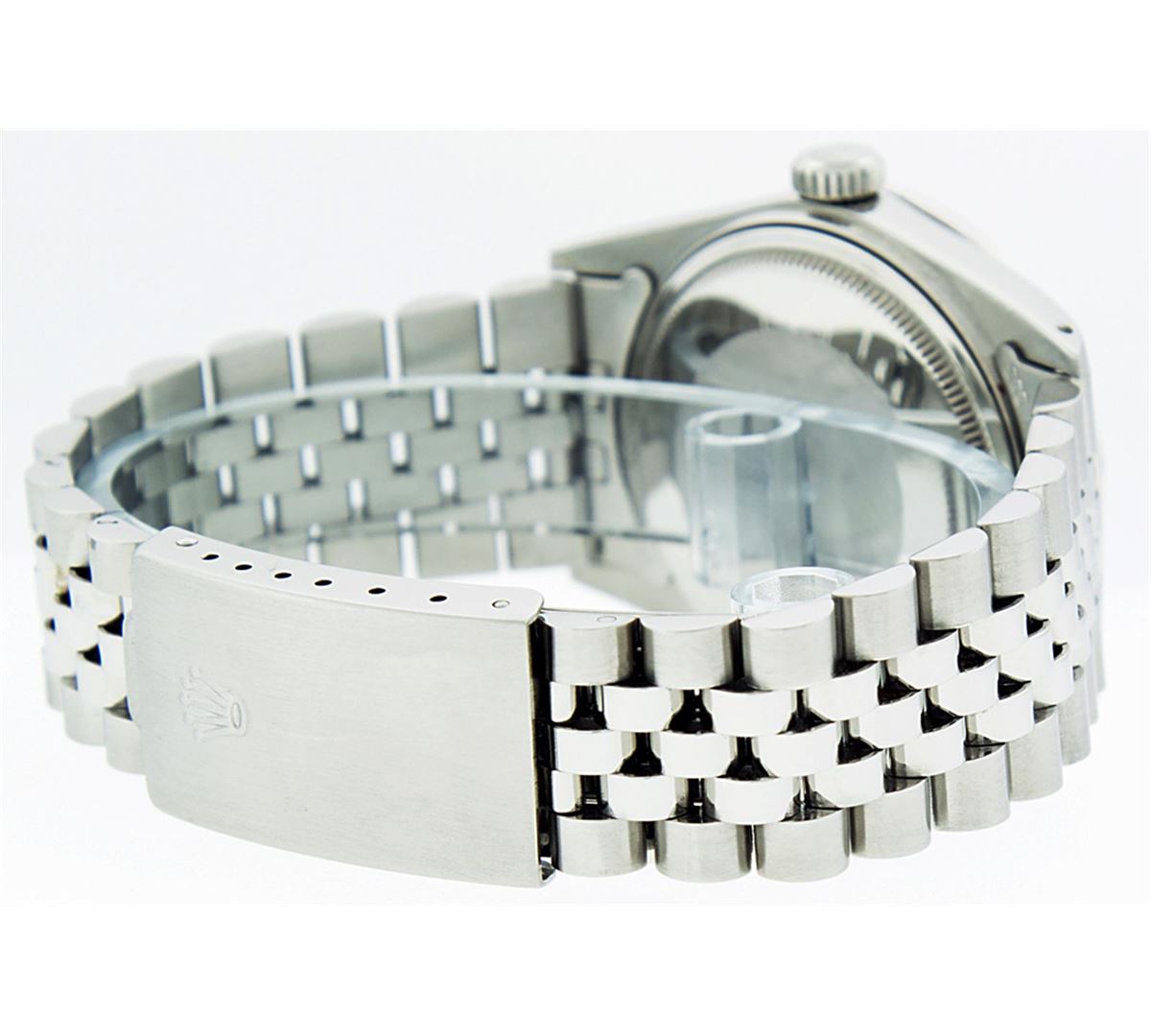 One Gents Rolex Datejust Polished, Serviced & Electronically Tested, Stainless Steel Case:36mm, Stainless Steel Crown, Custom Bezel: 18K White Gold Emerald Beadset Diamond Bezel, Diamond + Gem Count: 36 Diamonds + 4 Emeralds Total Weight 1.00 Carat, Clarity: SI-VS, Color: G to H. Custom Crystal: Synthetic Sapphire Cyclops Lens. Movement: Automatic Winding Movement Caliber 3035. Custom Dial: Green With Diamond Hour Markers, 10 Diamond Dial G To H In Color, Clarity: SI-VS. Date Window: 3 O'Clock Position Date Display, Quickset, Model: Datejust, Condition: G-6 Extra Fine. Bracelet: Stainless Steel Jubilee. Bright Polish & Satin Finish. 7.0 Inch Length, Adjustable. Standard Clasp, With Rolex Logo Comes with a 6 month warranty card.