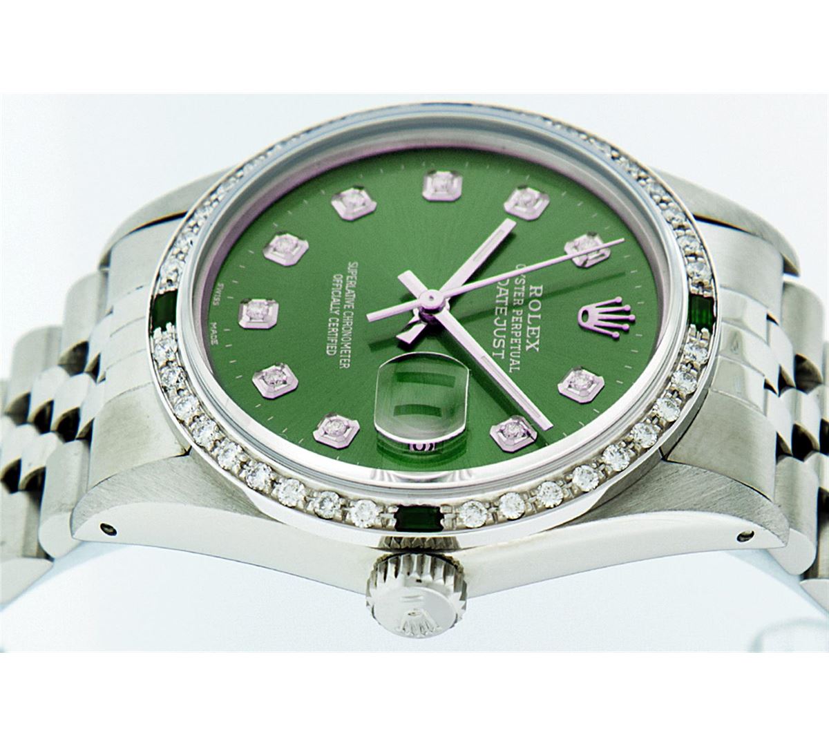 One Gents Rolex Datejust Polished, Serviced & Electronically Tested, Stainless Steel Case:36mm, Stainless Steel Crown, Custom Bezel: 18K White Gold Emerald Beadset Diamond Bezel, Diamond + Gem Count: 36 Diamonds + 4 Emeralds Total Weight 1.00 Carat, Clarity: SI-VS, Color: G to H. Custom Crystal: Synthetic Sapphire Cyclops Lens. Movement: Automatic Winding Movement Caliber 3035. Custom Dial: Green With Diamond Hour Markers, 10 Diamond Dial G To H In Color, Clarity: SI-VS. Date Window: 3 O'Clock Position Date Display, Quickset, Model: Datejust, Condition: G-6 Extra Fine. Bracelet: Stainless Steel Jubilee. Bright Polish & Satin Finish. 7.0 Inch Length, Adjustable. Standard Clasp, With Rolex Logo Comes with a 6 month warranty card.