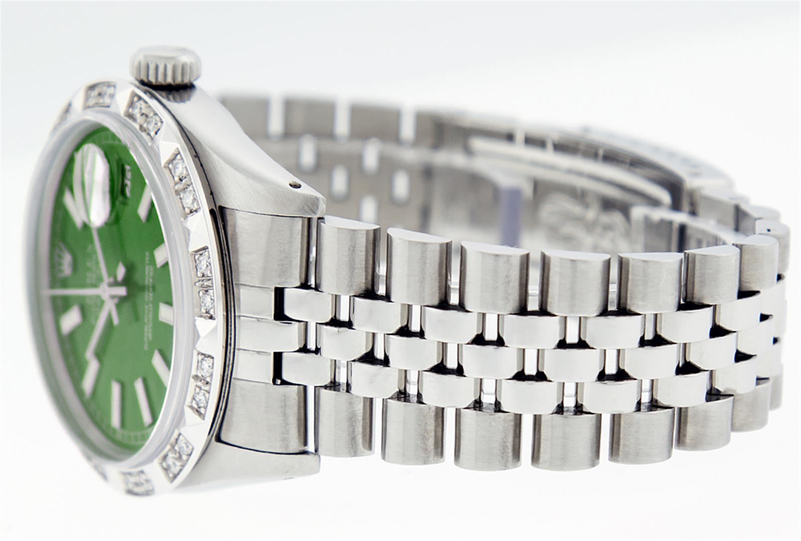One Mens Rolex Datejust Polished Bright with Satin Finish, Serviced & Electronically Tested, Stainless Steel Case:36mm, Stainless Steel Crown, Custom Bezel: 18K White Gold Pyramid Diamond Bezel, Diamond Count: 24 Diamonds Total Weight .70 Carat, Clarity: SI-VS, Color: G to H. Custom Crystal: Synthetic Sapphire Cyclops Lens. Movement: Automatic Winding Movement Caliber 3035. Custom Dial: Green Index Dial. Date Window: 3 O'Clock Position Date Display, Quickset, Model: Datejust, Condition: G-6 Extra Fine. Bracelet: Stainless Steel Jubilee. Bright Polish & Satin Finish. 7.0 Inch Length, Adjustable. Standard Clasp, With Rolex Logo. Comes with a 6 month warranty card.