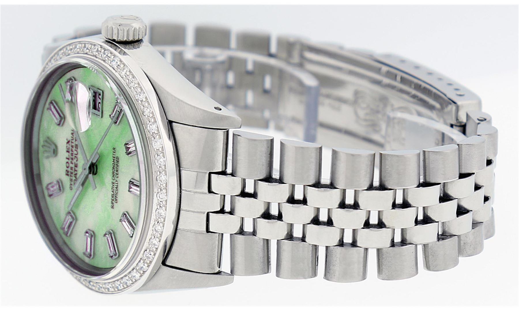 One Gents Rolex Datejust Polished, Serviced & Electronically Tested, Stainless Steel Case:36mm, Stainless Steel Crown, Custom Bezel: 18K White Gold Beadset Diamond Bezel, Diamond Count: 44 Diamonds, Total Weight 1.00 Carat, Clarity: SI-VS, Color: G to H. Custom Crystal: Synthetic Sapphire Cyclops Lens. Movement: Automatic Winding Movement Caliber 3035. Custom Dial: Green MOP Baguette Diamond Hour Markers, Diamond Count: 10 Diamond Baguette. G To H In Color, Clarity: SI-VS. Date Window: 3 O'Clock Position Date Display, Quickset, Model: Datejust. Condition: G-6 Extra Fine. Bracelet: Stainless Steel Jubilee. Bright Polish & Satin Finish. 7.0 Inch Length, Adjustable. Standard Clasp, With Rolex Logo. Comes with 6 month warranty.