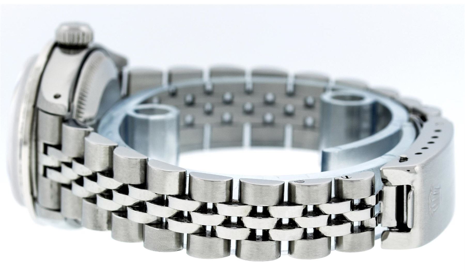 One Ladies Rolex Datejust Polished Bright with Satin Finish, Serviced & Electronically Tested, Stainless Steel Case:26mm, Stainless Steel Crown, Custom Bezel: 18K White Gold Emerald Beadset Diamond Bezel, Diamond + Gem Count: 28 Diamonds + 4 Emeralds Total Weight .70 Carat, Clarity: SI-VS, Color: G to H. Custom Crystal: Synthetic Sapphire Cyclops Lens. Movement: Automatic Winding Movement Caliber 2030. Custom Dial: Refinished Green Roman Dial With Square Track. Date Window: 3 O'Clock Position Date Display, Model: Datejust. Condition: G-6 Extra Fine. Bracelet: Stainless Steel Jubilee. Bright Polish & Satin Finish. 5.5 Inch Length, Adjustable. Standard Clasp, With Rolex Logo. Comes with a 6 month warranty card.