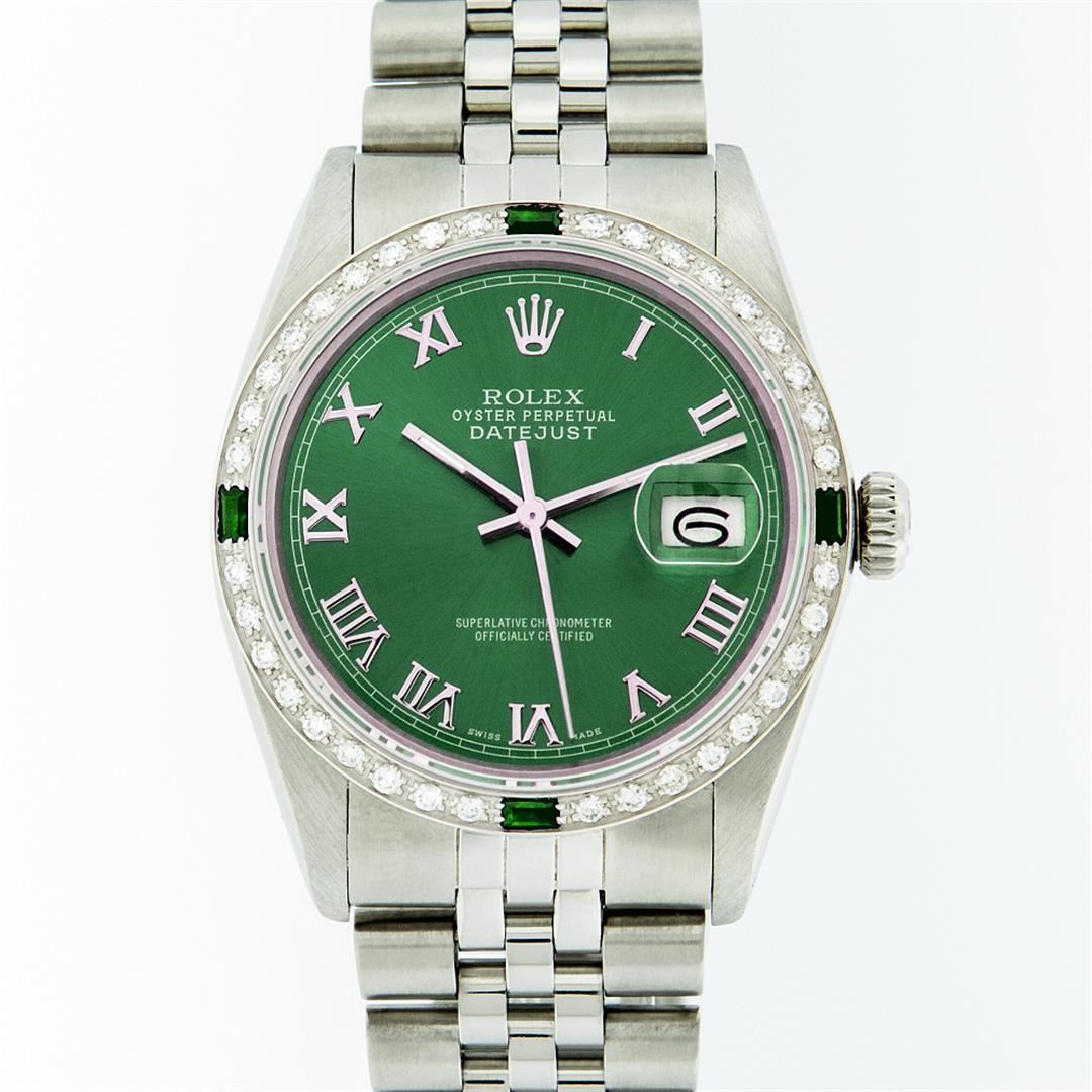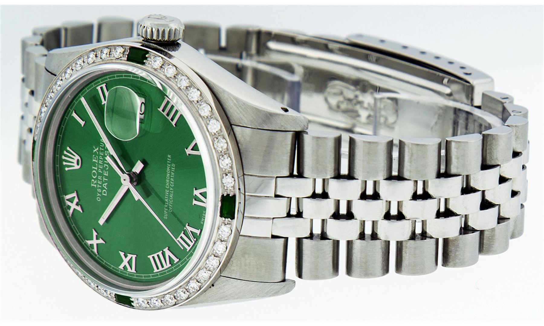 One Mens Rolex Datejust Polished Bright with Satin Finish, Serviced & Electronically Tested, Stainless Steel Case:36mm, Stainless Steel Crown, Custom Bezel: 18K White Gold Emerald Beadset Diamond Bezel, Diamond + Gem Count: 36 Diamonds + 4 Emeralds. Total Weight 1.00 Carat, Clarity: Si-VS, Color: G to H. Custom Crystal: Synthetic Sapphire Cyclops Lens. Movement: Automatic Winding Movement Caliber 3035. Custom Dial: Green Roman Dial With Square Track. Date Window: 3 O'Clock Position Date Display, Quickset, Model: Datejust. Condition: G-6 Extra Fine. Bracelet: Stainless Steel Jubilee. Bright Polish & Satin Finish. 7.0 Inch Length, Adjustable. Standard Clasp, With Rolex Logo. Comes with a 6 month warranty card.