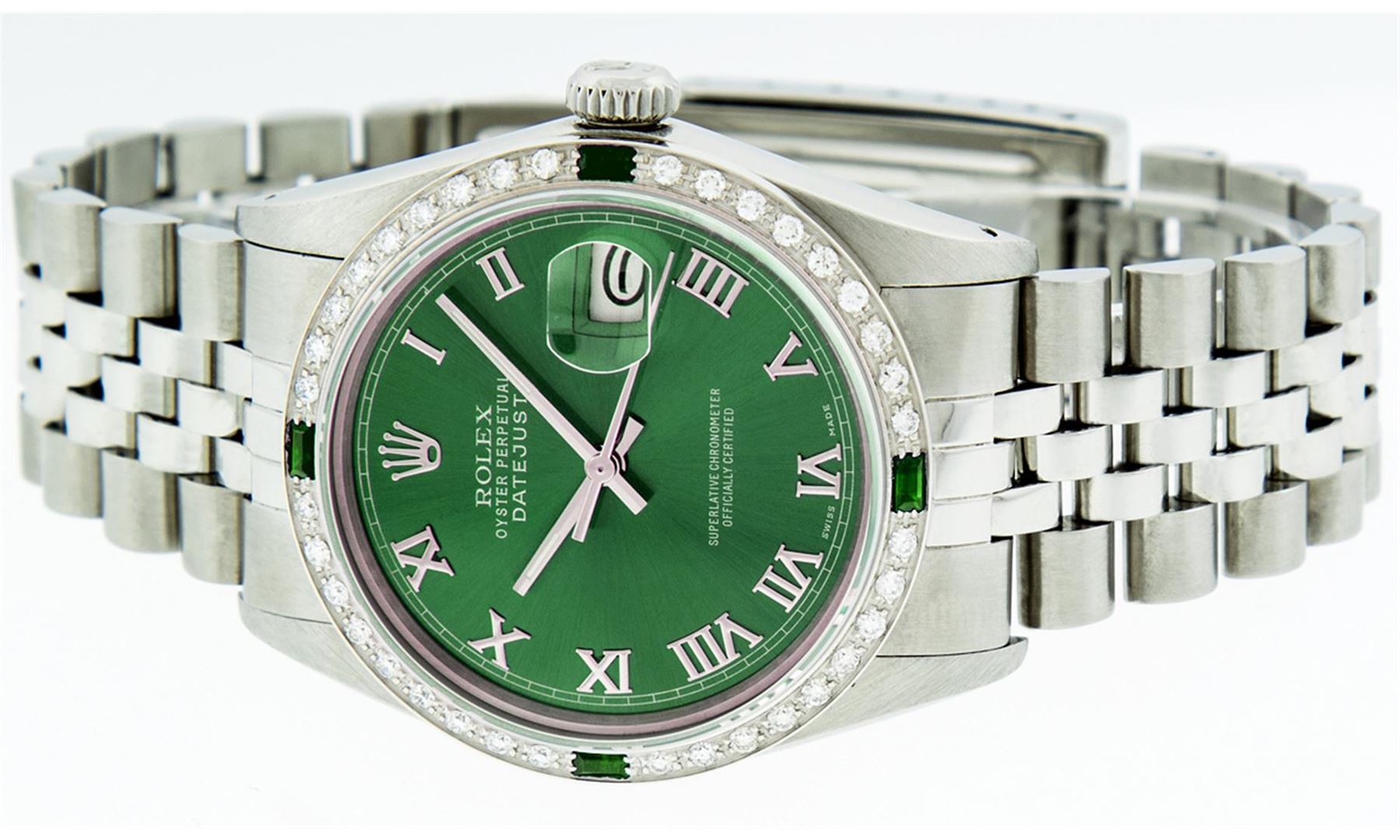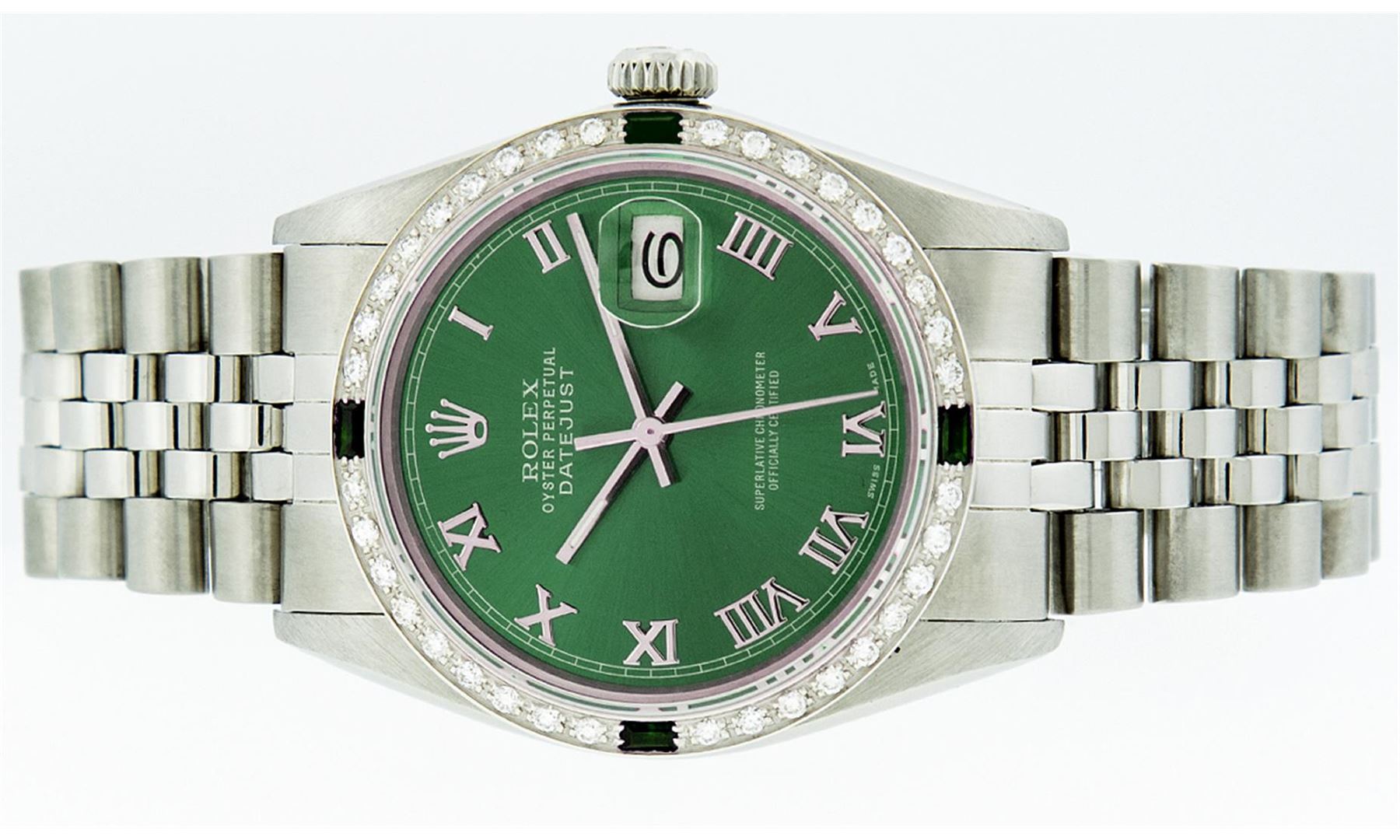 One Mens Rolex Datejust Polished Bright with Satin Finish, Serviced & Electronically Tested, Stainless Steel Case:36mm, Stainless Steel Crown, Custom Bezel: 18K White Gold Emerald Beadset Diamond Bezel, Diamond + Gem Count: 36 Diamonds + 4 Emeralds. Total Weight 1.00 Carat, Clarity: Si-VS, Color: G to H. Custom Crystal: Synthetic Sapphire Cyclops Lens. Movement: Automatic Winding Movement Caliber 3035. Custom Dial: Green Roman Dial With Square Track. Date Window: 3 O'Clock Position Date Display, Quickset, Model: Datejust. Condition: G-6 Extra Fine. Bracelet: Stainless Steel Jubilee. Bright Polish & Satin Finish. 7.0 Inch Length, Adjustable. Standard Clasp, With Rolex Logo. Comes with a 6 month warranty card.