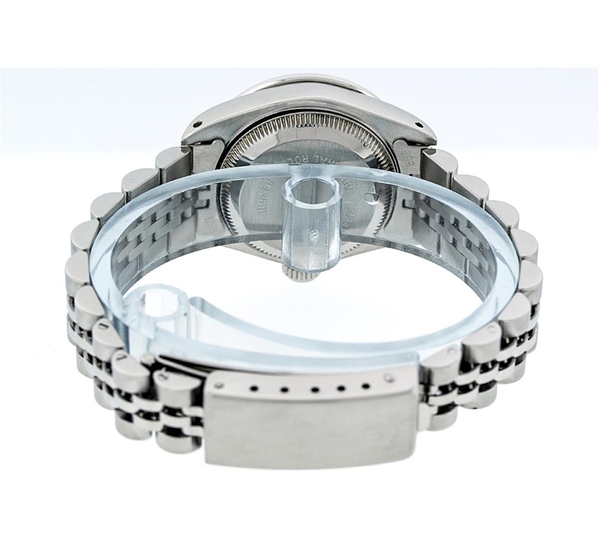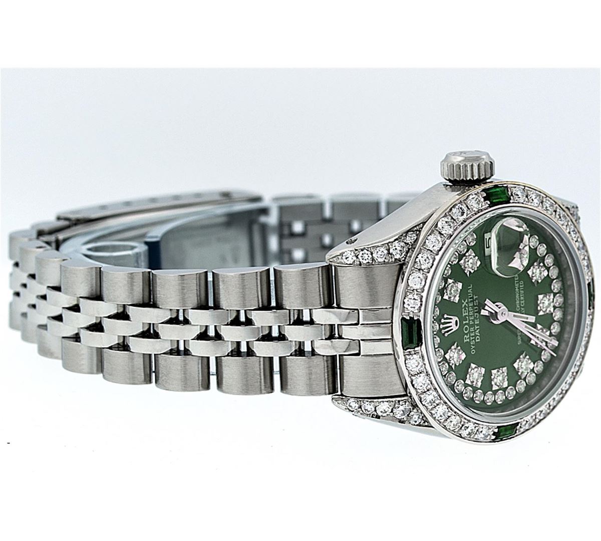 One Ladies Rolex Datejust Polished Bright with Satin Finish, Serviced & Electronically Tested, Stainless Steel Case:26mm, Stainless Steel Crown, Diamond Lugs: 16 Diamonds On Lugs, Clarity: SI-VS, Color: G to H. Custom Bezel: 18K White Gold Emerald Beadset Bezel, Diamond Count: 28 Diamonds + 4 Emeralds, Total Weight 1.00 Carat, Clarity: SI-VS, Color: G to H. Custom Crystal: Synthetic Sapphire Cyclops Lens. Movement: Automatic Winding Movement Caliber 2030. Custom Dial: Refinished Green With String Diamond Dial, 43 Diamonds in Dial G To H In Color, Clarity: VVS. Date Window: 3 O'Clock Position Date Display, Model: Datejust Condition: G-6 Extra Fine. Bracelet: Stainless Steel Jubilee. Bright Polish & Satin Finish. 5.5 Inch Length, Adjustable. Standard Clasp, With Rolex Logo. Comes with a 6 month warranty card.