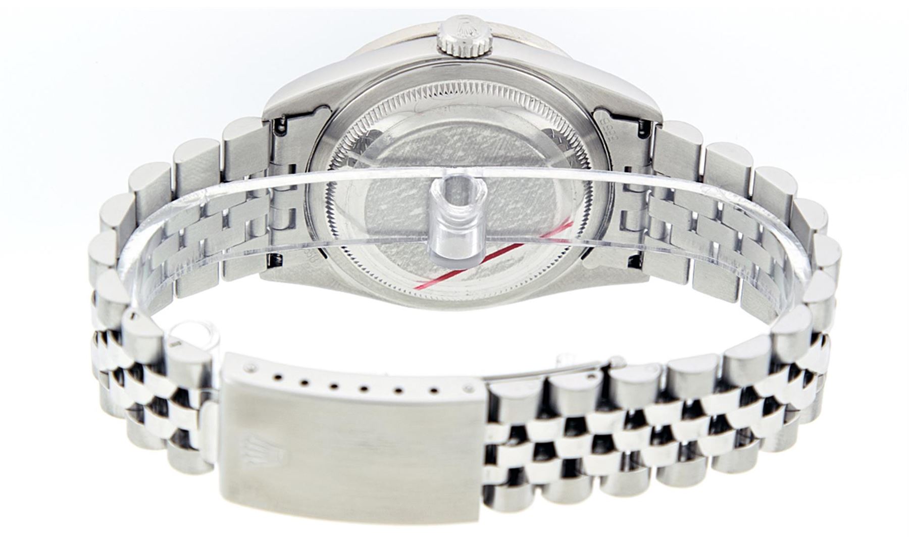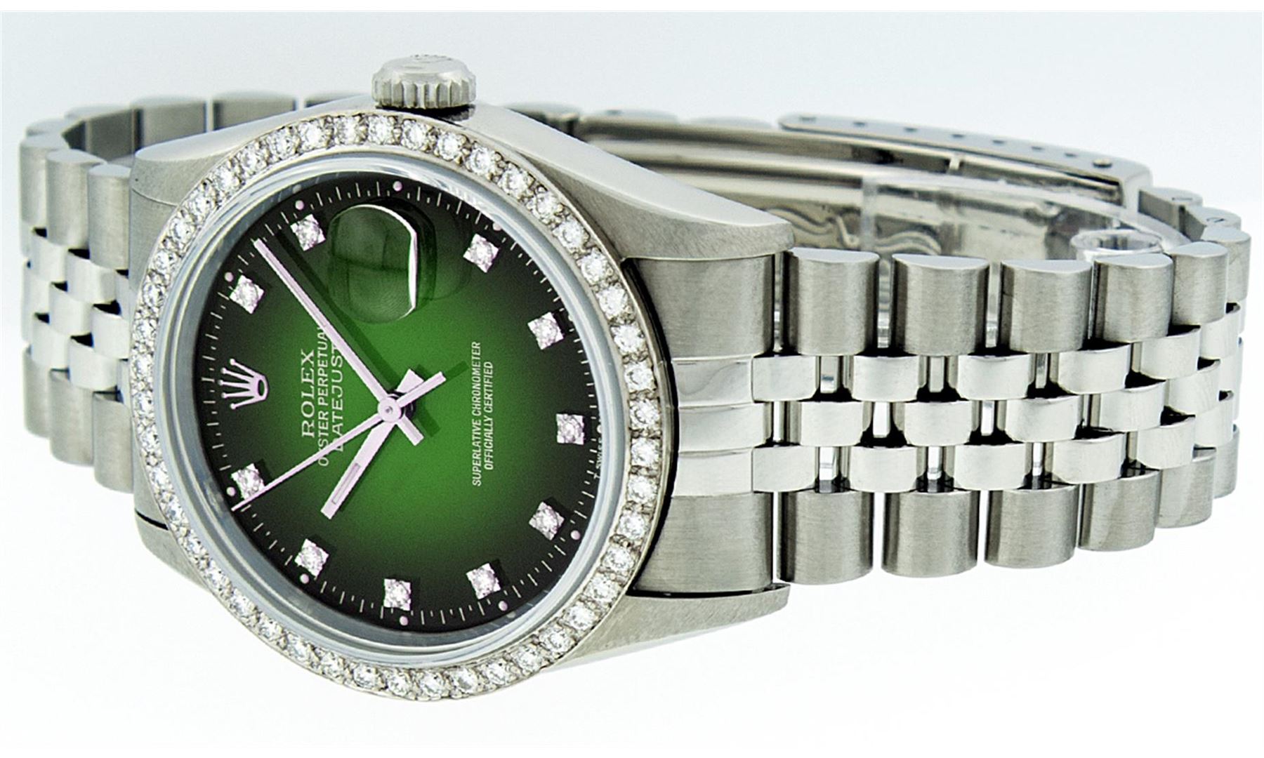 One Mens Stainless Steel Rolex Datejust Polished Bright with Satin Finish, Fully Serviced & Electronically Tested, Stainless Steel Case:36mm, Stainless Steel Crown, Custom Bezel: 18K White Gold Beadset Diamond Bezel, Diamond Count: 46 Diamonds Total Weight 1.40 Carat, Clarity: SI-VS, Color: G to H. Custom Crystal: Synthetic Sapphire Cyclops Lens. Movement: Automatic Winding Movement Caliber 3035. Custom Dial: Green Vignette Diamond With Line Track & Lumi Dots, 10 Single Cut Diamonds in Dial G To H In Color, Clarity: VVS. Date Window: 3 O'Clock Position Date Display, Quickset, Model: Datejust, Condition: G-6 Extra Fine. Bracelet: Stainless Steel Jubilee. Bright Polish & Satin Finish. 7.0 Inch Length, Adjustable. Standard Clasp, With Rolex Logo.