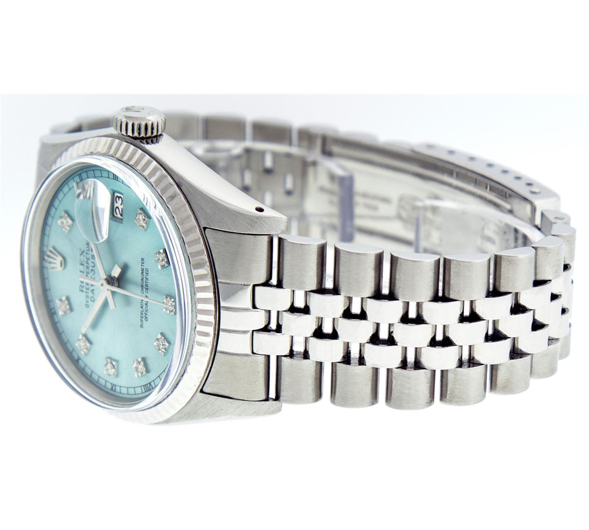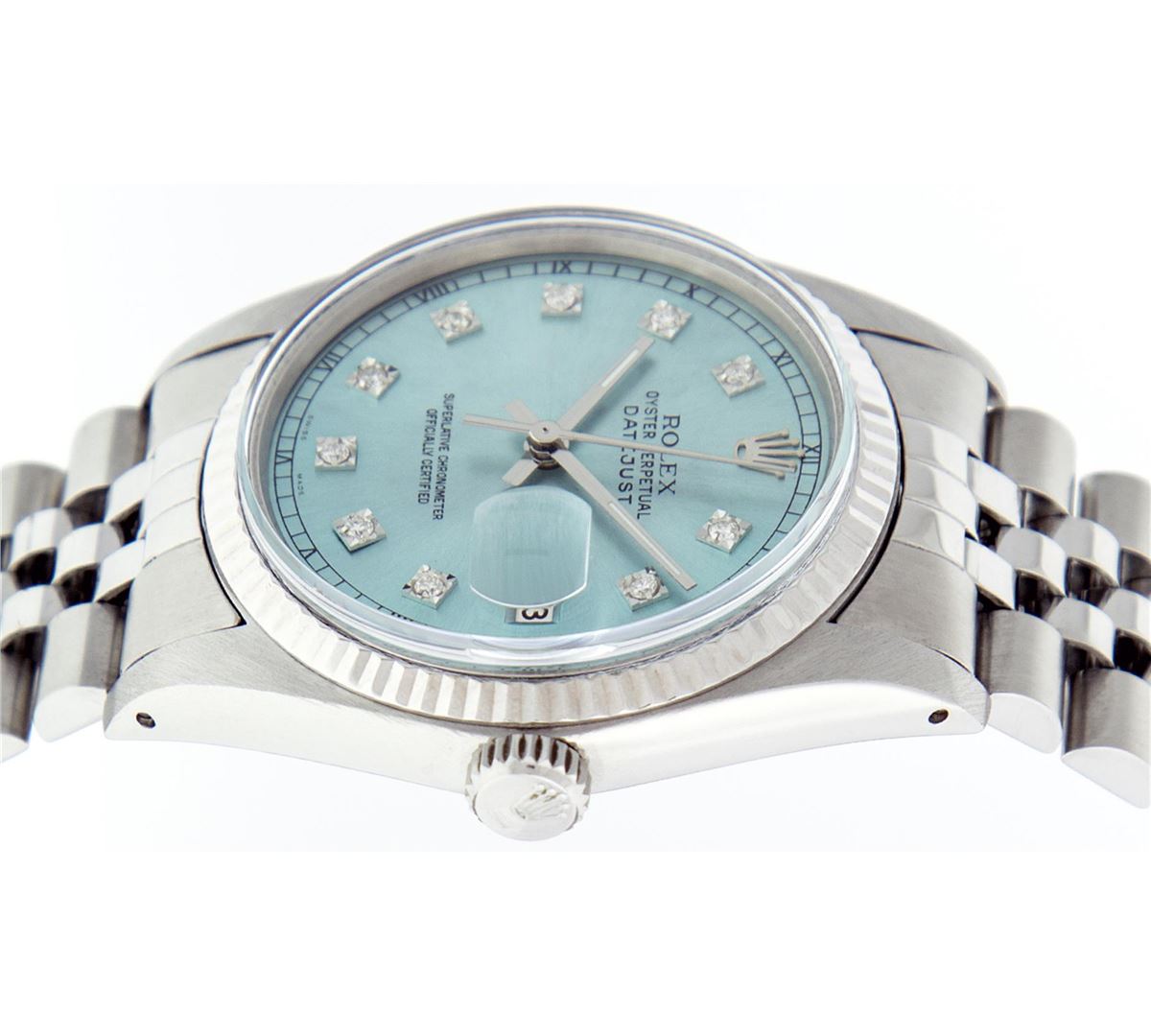 One Gents Rolex Datejust Polished Bright with Satin Finish, Serviced & Electronically Tested, Stainless Steel Case:36mm, Stainless Steel Crown, Original Bezel: 14K White Gold Fluted Bezel. Custom Crystal: Acrylic Cyclops Lens. Movement: Automatic Winding Movement Caliber 3035. Custom Dial: Ice Blue Dial With Diamond Hour Markers and Track Square Setting, 10 Diamond in Dial G To H In Color, Si-VS Clarity. Date Window: 3 O'Clock Position Date Display, Quickset, Model: Datejust, Condition: G-6 Extra Fine. Bracelet: Stainless Steel Jubilee. Bright Polish & Satin Finish. 7.0 Inch Length, Adjustable. Standard Clasp, With Rolex Logo. Comes with a 6 month warranty card.