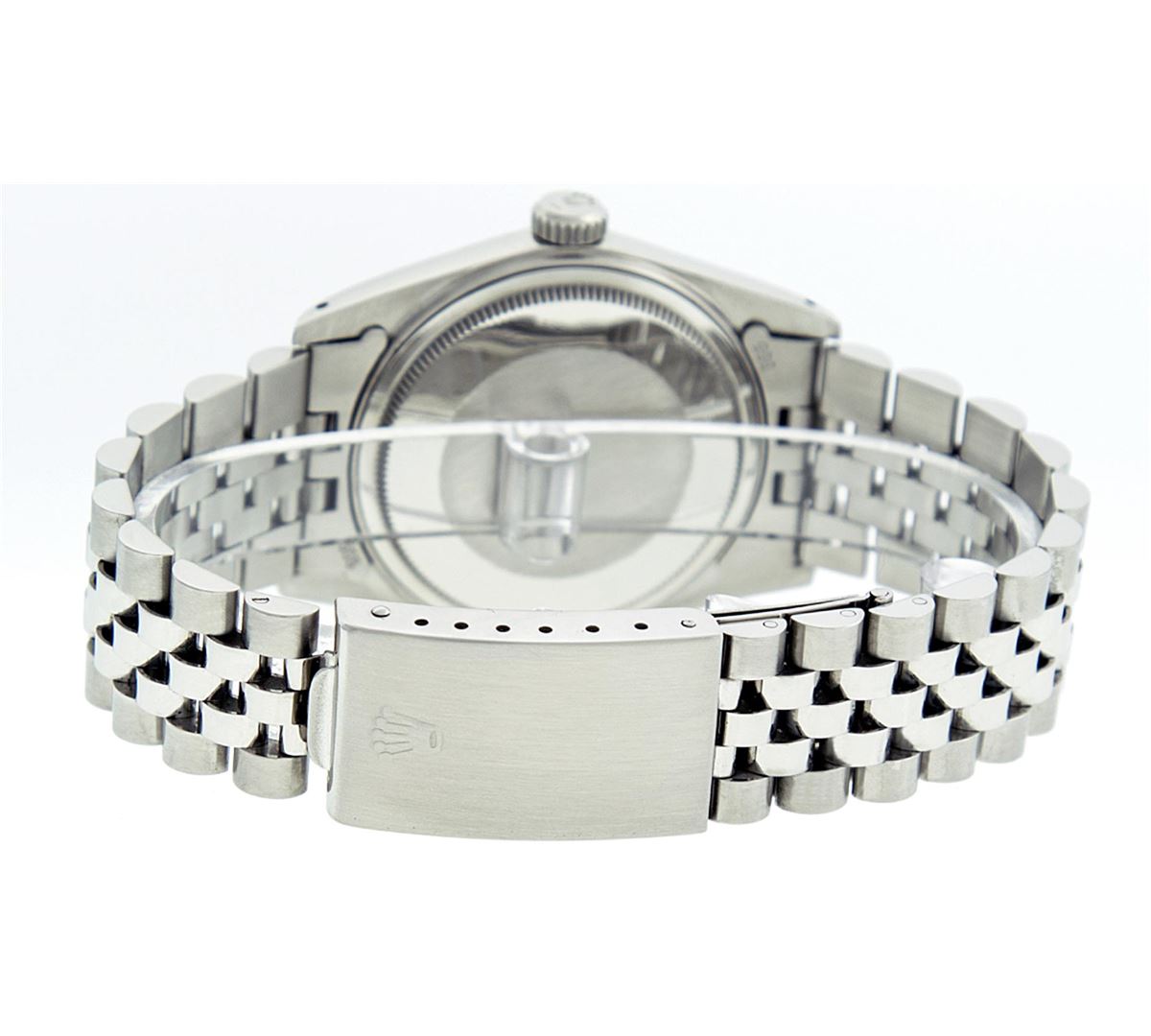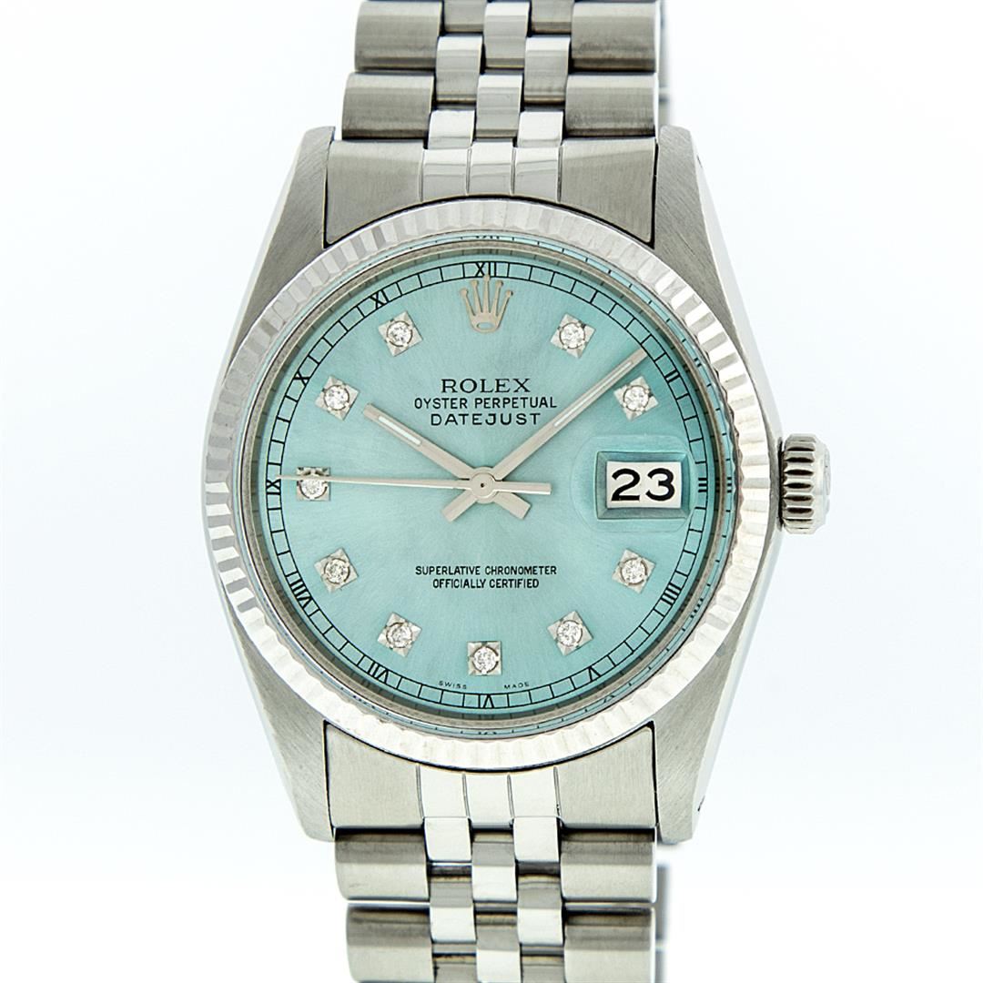One Gents Rolex Datejust Polished Bright with Satin Finish, Serviced & Electronically Tested, Stainless Steel Case:36mm, Stainless Steel Crown, Original Bezel: 14K White Gold Fluted Bezel. Custom Crystal: Acrylic Cyclops Lens. Movement: Automatic Winding Movement Caliber 3035. Custom Dial: Ice Blue Dial With Diamond Hour Markers and Track Square Setting, 10 Diamond in Dial G To H In Color, Si-VS Clarity. Date Window: 3 O'Clock Position Date Display, Quickset, Model: Datejust, Condition: G-6 Extra Fine. Bracelet: Stainless Steel Jubilee. Bright Polish & Satin Finish. 7.0 Inch Length, Adjustable. Standard Clasp, With Rolex Logo. Comes with a 6 month warranty card.