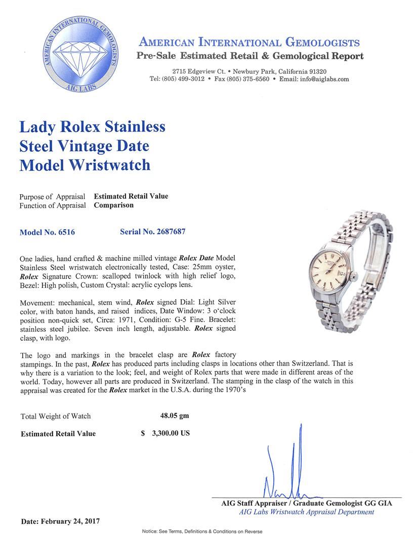 One ladies hand crafted & machine milled vintage Rolex Date Model Stainless Steel wristwatch electronically tested, Case: 25mm oyster, Rolex Signature Crown: scalloped twinlock with high relief logo, Bezel: High polish, Custom Crystal: acrylic cyclops lens.Movement: mechanical, stem wind, Rolex signed Dial: Light Silver color, with baton hands, and raised indices, Date Window: 3 o'clock position non-quick set, Circa: 1971, Condition: G-5 Fine. Bracelet: stainless steel jubilee. Seven inch length, adjustable. Rolex signed clasp, with logo.The logo and markings in the bracelet clasp are Rolex factory stampings. In the past, Rolex has produced parts including clasps in locations other than Switzerland. That is why there is a variation to the look; feel, and weight of Rolex parts that were made in different areas of the world. Today, however all parts are produced in Switzerland. The stamping in the clasp of the watch in this appraisal was created for the Rolex market in the U.S.A. during the 1970'sTotal Weight of Watch 48.05gm. AIG Appraised at $3,300.00.