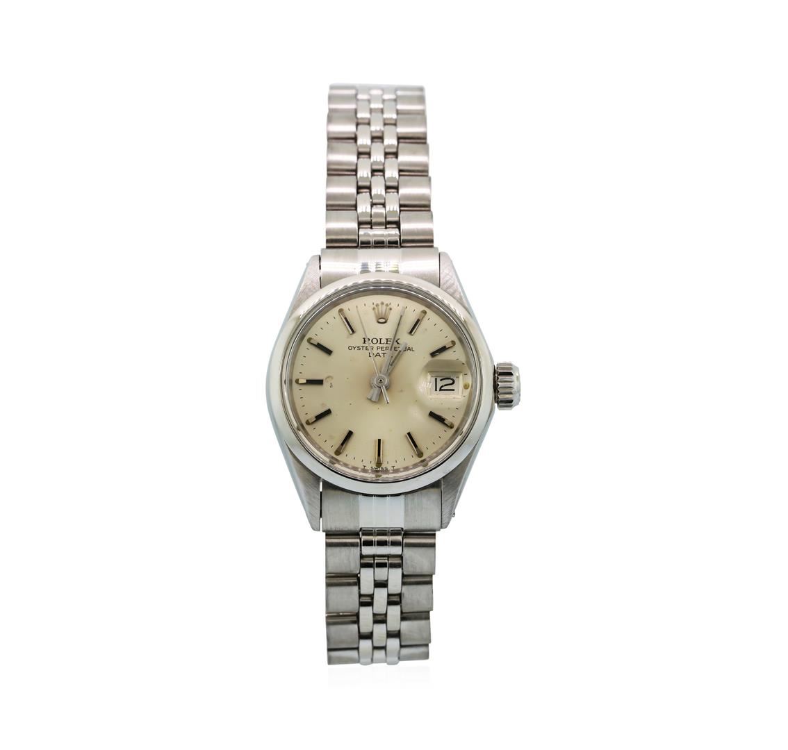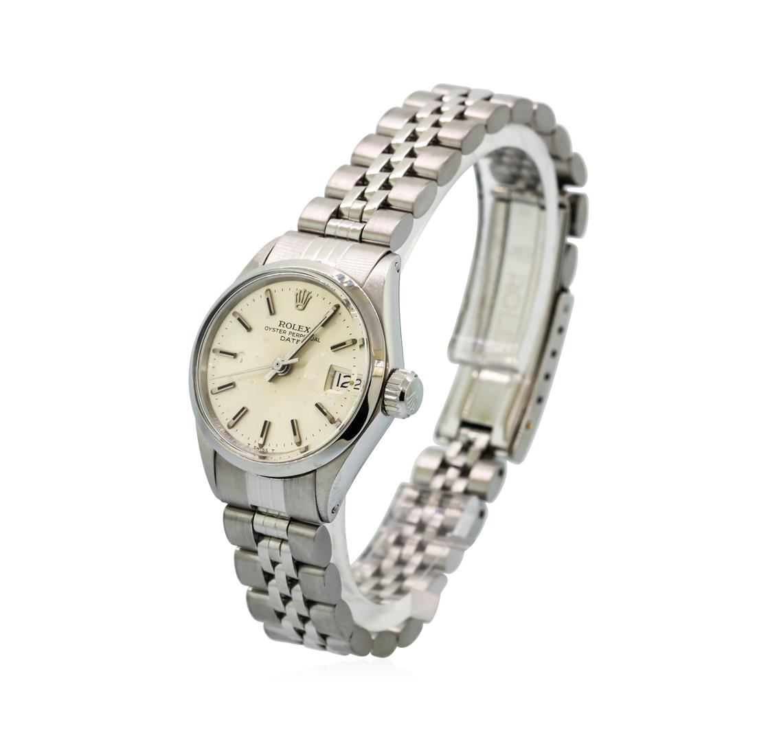 One ladies hand crafted & machine milled vintage Rolex Date Model Stainless Steel wristwatch electronically tested, Case: 25mm oyster, Rolex Signature Crown: scalloped twinlock with high relief logo, Bezel: High polish, Custom Crystal: acrylic cyclops lens.Movement: mechanical, stem wind, Rolex signed Dial: Light Silver color, with baton hands, and raised indices, Date Window: 3 o'clock position non-quick set, Circa: 1971, Condition: G-5 Fine. Bracelet: stainless steel jubilee. Seven inch length, adjustable. Rolex signed clasp, with logo.The logo and markings in the bracelet clasp are Rolex factory stampings. In the past, Rolex has produced parts including clasps in locations other than Switzerland. That is why there is a variation to the look; feel, and weight of Rolex parts that were made in different areas of the world. Today, however all parts are produced in Switzerland. The stamping in the clasp of the watch in this appraisal was created for the Rolex market in the U.S.A. during the 1970'sTotal Weight of Watch 48.05gm. AIG Appraised at $3,300.00.