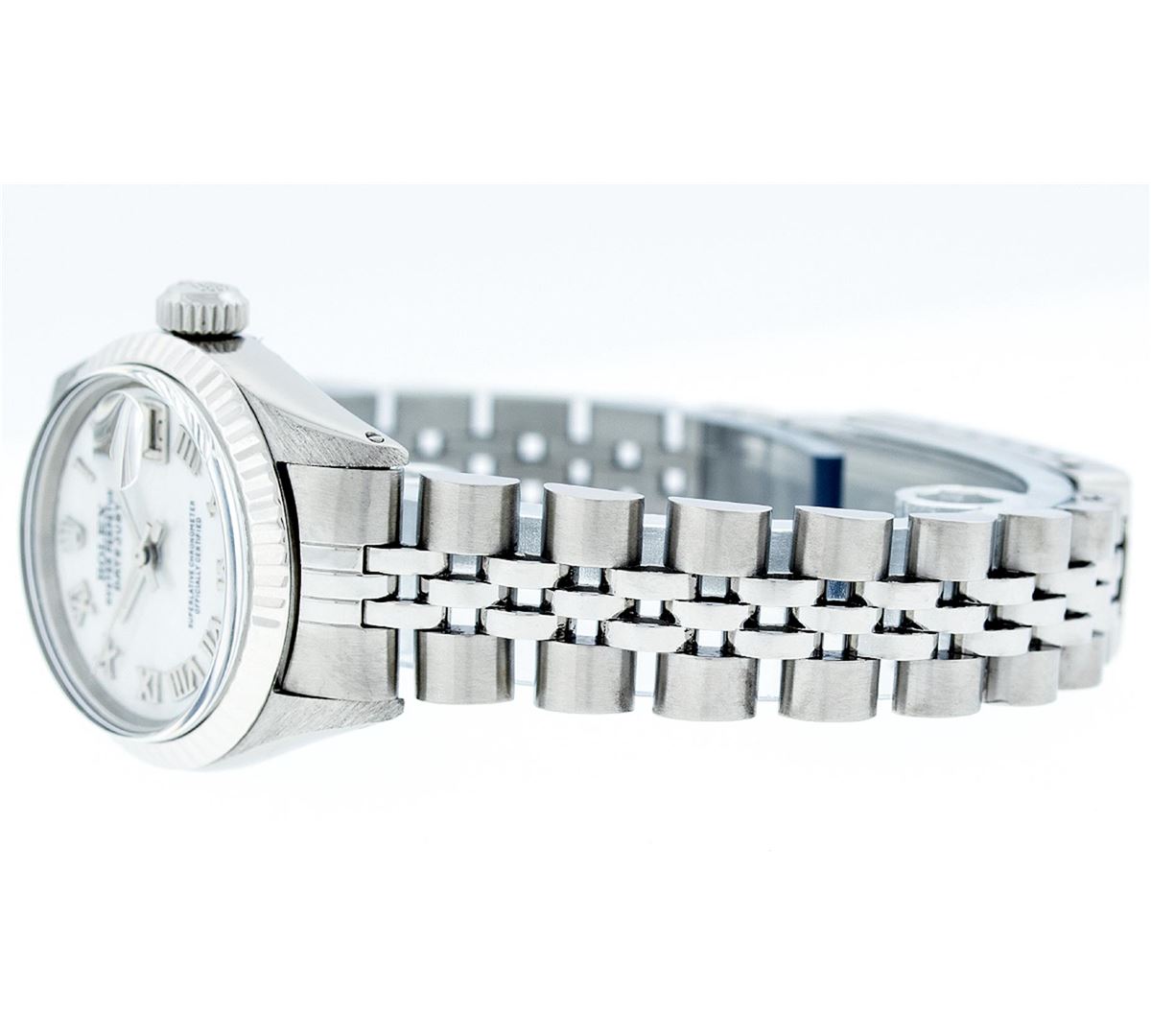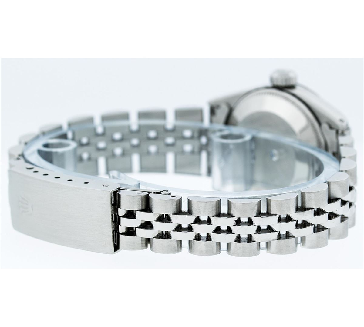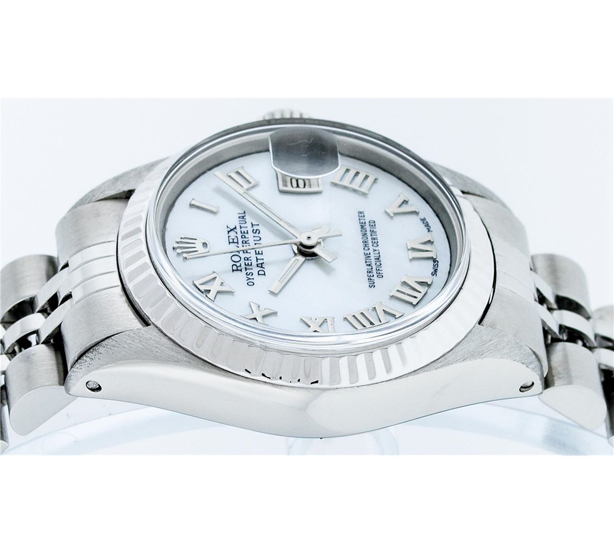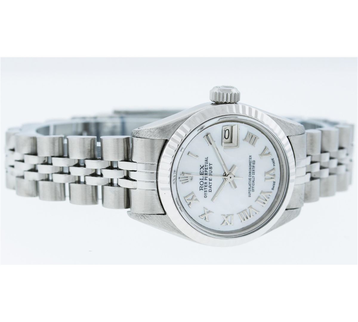 One Ladies Rolex Datejust Polished Bright with Satin Finish, Serviced & Electronically Tested, Stainless Steel Case:26mm, Stainless Steel Crown, Bezel: 14K White Gold Fluted. Custom Crystal: Acrylic Cyclops Lens. Movement: Automatic Winding Movement Caliber 2030. Custom Dial: White Mother Of Pearl With Roman Hour Markers. Date Window: 3 O'Clock Position Date Display, Non Quickset, Model: 6917 Condition: G-6 Extra Fine. Bracelet: Stainless Steel Jubilee Band. Bright Polish & Satin Finish. 6.0 Inch Length, Adjustable. Standard Clasp, With Rolex Logo.