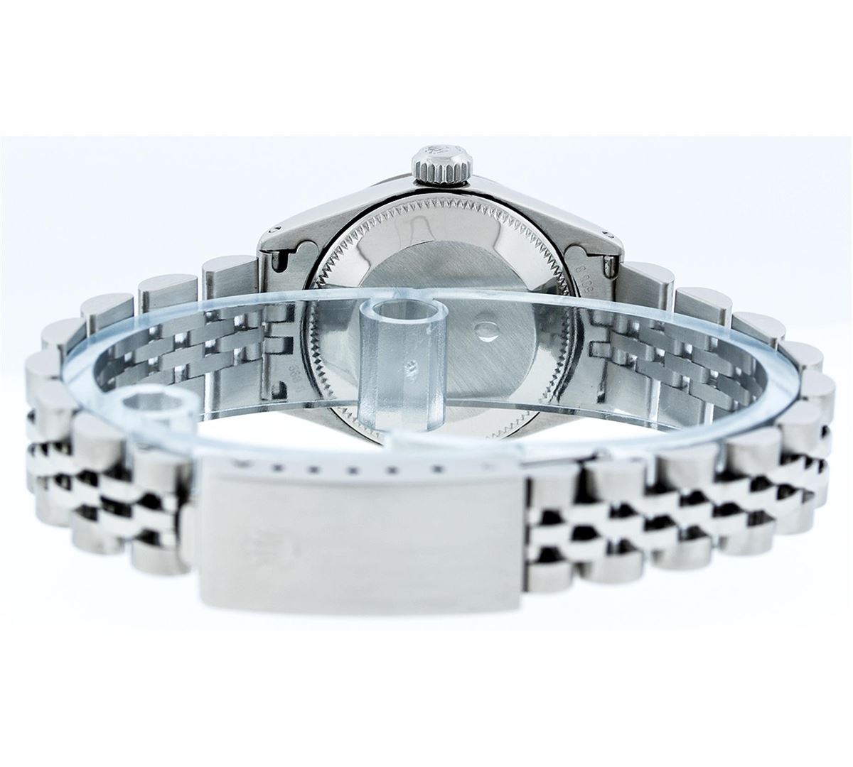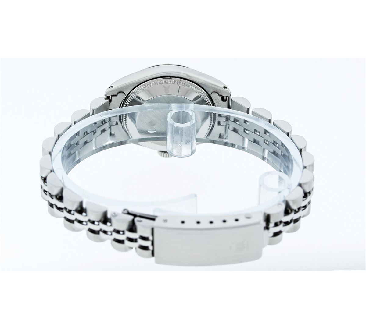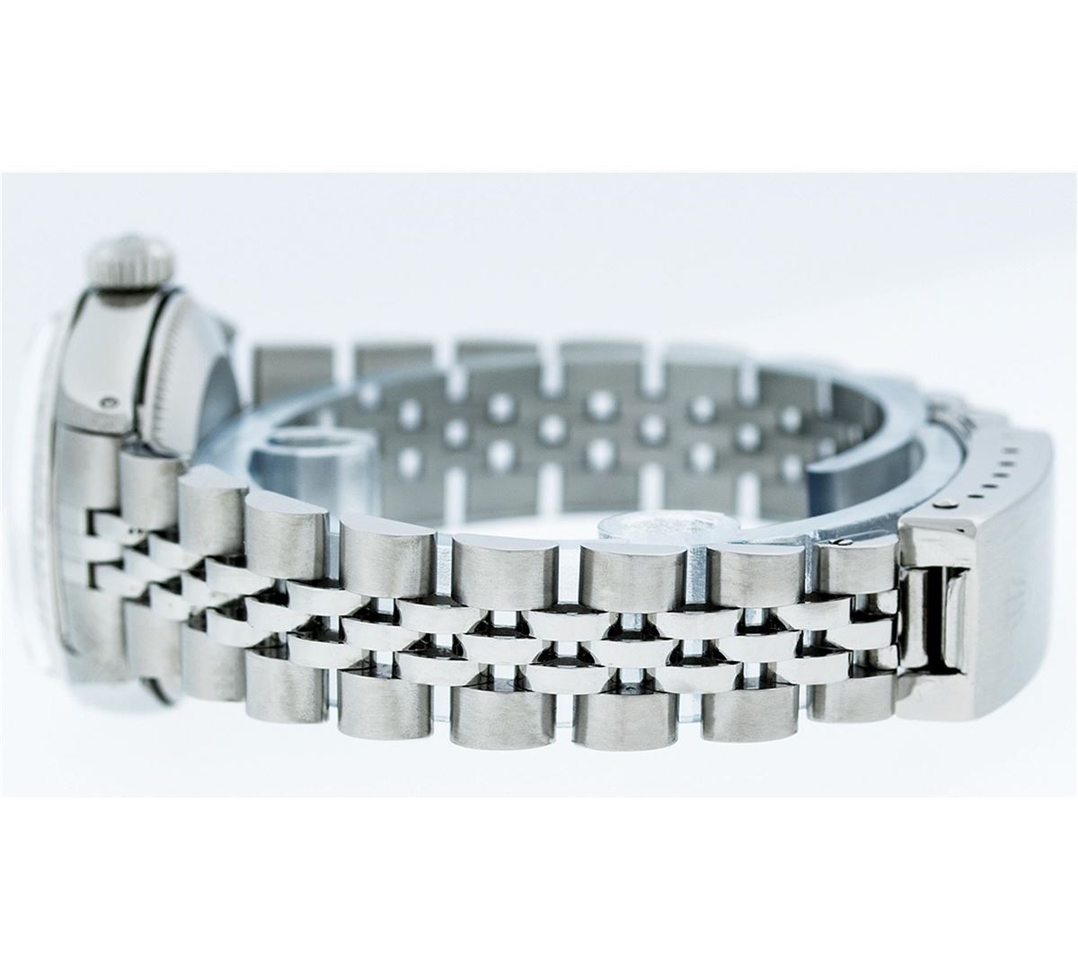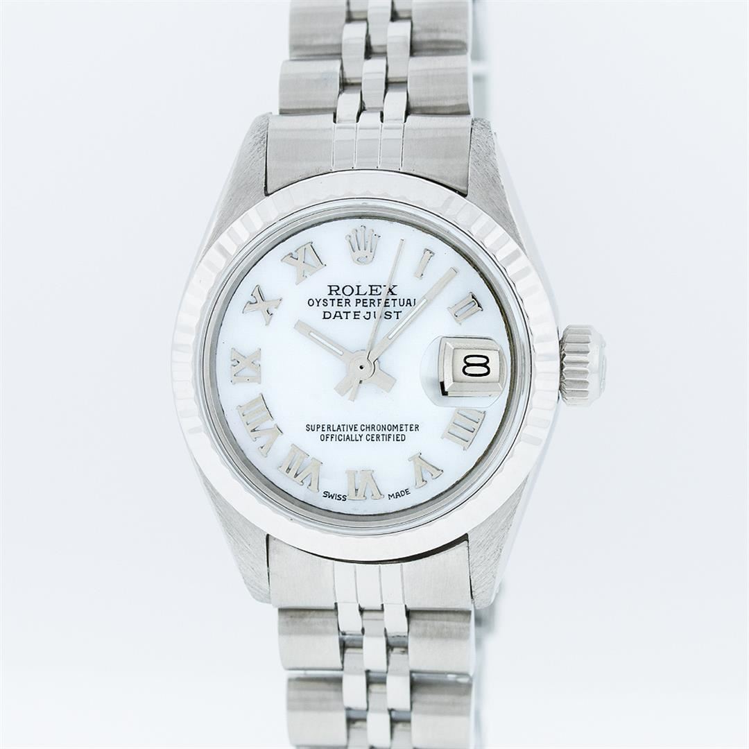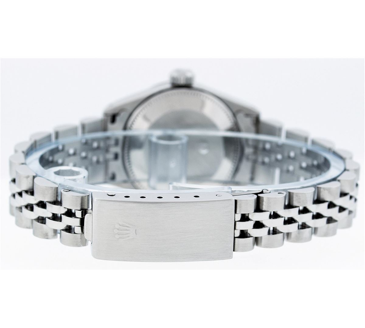 One Ladies Rolex Datejust Polished Bright with Satin Finish, Serviced & Electronically Tested, Stainless Steel Case:26mm, Stainless Steel Crown, Bezel: 14K White Gold Fluted. Custom Crystal: Acrylic Cyclops Lens. Movement: Automatic Winding Movement Caliber 2030. Custom Dial: White Mother Of Pearl With Roman Hour Markers. Date Window: 3 O'Clock Position Date Display, Non Quickset, Model: 6917 Condition: G-6 Extra Fine. Bracelet: Stainless Steel Jubilee Band. Bright Polish & Satin Finish. 6.0 Inch Length, Adjustable. Standard Clasp, With Rolex Logo.