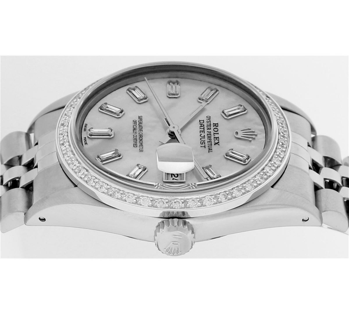 One Gents Rolex Datejust Polished, Serviced & Electronically Tested, Stainless Steel Case:36mm, Stainless Steel Crown, Custom Bezel: 18K White Gold Beadset Diamond Bezel, Diamond Count: 44 Diamonds, Total Weight 1.00 Carat, Clarity: SI-VS, Color: G to H. Custom Crystal: Synthetic Sapphire Cyclops Lens. Movement: Automatic Winding Movement Caliber 3035. Custom Dial: MOP Baguette Diamond Hour Markers, Diamond Count: 10 Diamond Baguette. G To H In Color, Clarity: SI-VS. Date Window: 3 O'Clock Position Date Display, Quickset, Model: Datejust. Condition: G-6 Extra Fine. Bracelet: Stainless Steel Jubilee. Bright Polish & Satin Finish. 7.0 Inch Length, Adjustable. Standard Clasp, With Rolex Logo. Comes with 6 month warranty.