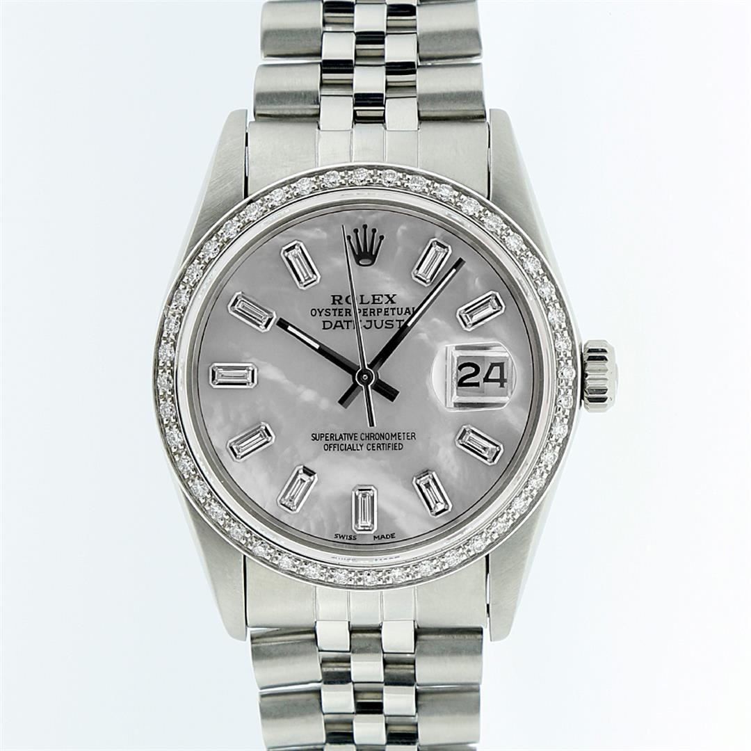 One Gents Rolex Datejust Polished, Serviced & Electronically Tested, Stainless Steel Case:36mm, Stainless Steel Crown, Custom Bezel: 18K White Gold Beadset Diamond Bezel, Diamond Count: 44 Diamonds, Total Weight 1.00 Carat, Clarity: SI-VS, Color: G to H. Custom Crystal: Synthetic Sapphire Cyclops Lens. Movement: Automatic Winding Movement Caliber 3035. Custom Dial: MOP Baguette Diamond Hour Markers, Diamond Count: 10 Diamond Baguette. G To H In Color, Clarity: SI-VS. Date Window: 3 O'Clock Position Date Display, Quickset, Model: Datejust. Condition: G-6 Extra Fine. Bracelet: Stainless Steel Jubilee. Bright Polish & Satin Finish. 7.0 Inch Length, Adjustable. Standard Clasp, With Rolex Logo. Comes with 6 month warranty.