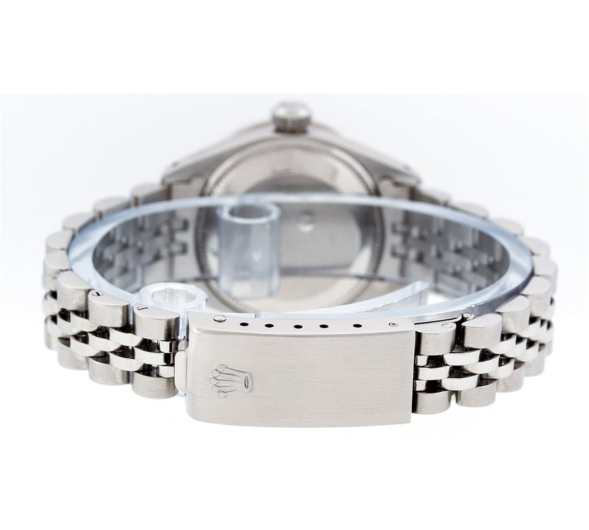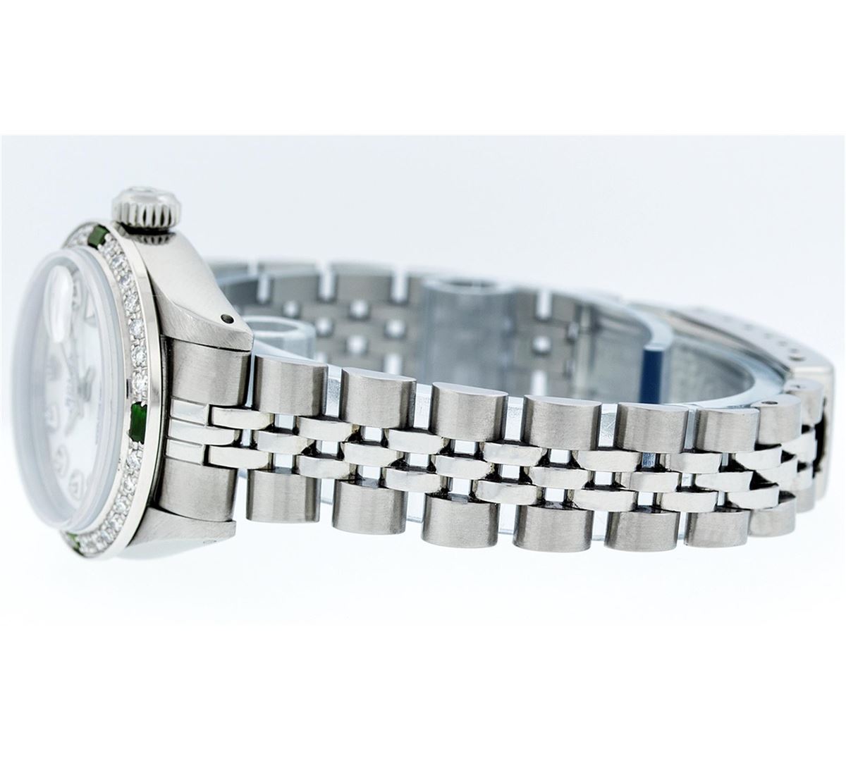 One Ladies Rolex Datejust Polished Bright with Satin Finish, Serviced & Electronically Tested, Stainless Steel Case:26mm, Stainless Steel Crown, Custom Bezel: 18K White Gold Emerald Beadset Diamond Bezel, Diamond + Gem Count: 28 Diamonds + 4 Emeralds. Total Weight .70 Carat, Clarity: SI-VS, Color: G to H. Custom Crystal: Synthetic Sapphire Cyclops Lens. Movement: Automatic Winding Movement Caliber 2030. Custom Dial: Refinished Mother Of Pearl With Diamond Hour Markers, 10 Diamond in Dial G To H In Color, Clarity: SI-VS. Date Window: 3 O'Clock Position Date Display, Model: Datejust. Condition: G-6 Extra Fine. Bracelet: Stainless Steel Jubilee. Bright Polish & Satin Finish. 5.5 Inch Length, Adjustable. Standard Clasp, With Rolex Logo. Comes with 6 month warranty.