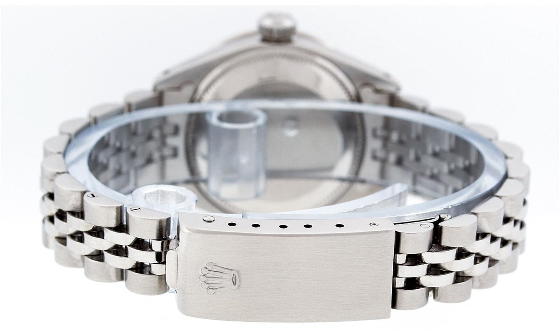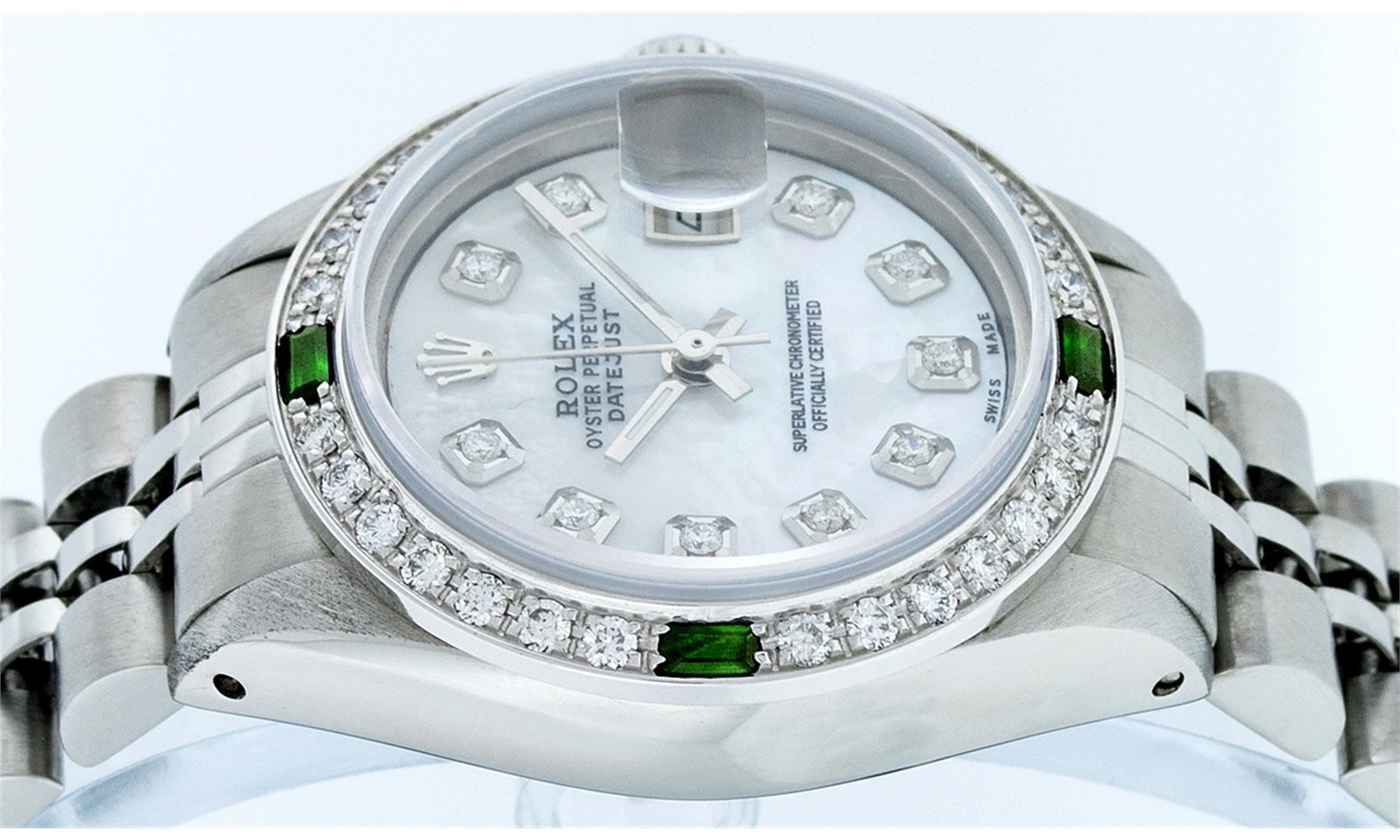 One Ladies Rolex Datejust Polished Bright with Satin Finish, Serviced & Electronically Tested, Stainless Steel Case:26mm, Stainless Steel Crown, Custom Bezel: 18K White Gold Emerald Beadset Diamond Bezel, Diamond + Gem Count: 28 Diamonds + 4 Emeralds. Total Weight .70 Carat, Clarity: SI-VS, Color: G to H. Custom Crystal: Synthetic Sapphire Cyclops Lens. Movement: Automatic Winding Movement Caliber 2030. Custom Dial: Refinished Mother Of Pearl With Diamond Hour Markers, 10 Diamond in Dial G To H In Color, Clarity: SI-VS. Date Window: 3 O'Clock Position Date Display, Model: Datejust. Condition: G-6 Extra Fine. Bracelet: Stainless Steel Jubilee. Bright Polish & Satin Finish. 5.5 Inch Length, Adjustable. Standard Clasp, With Rolex Logo. Comes with 6 month warranty.