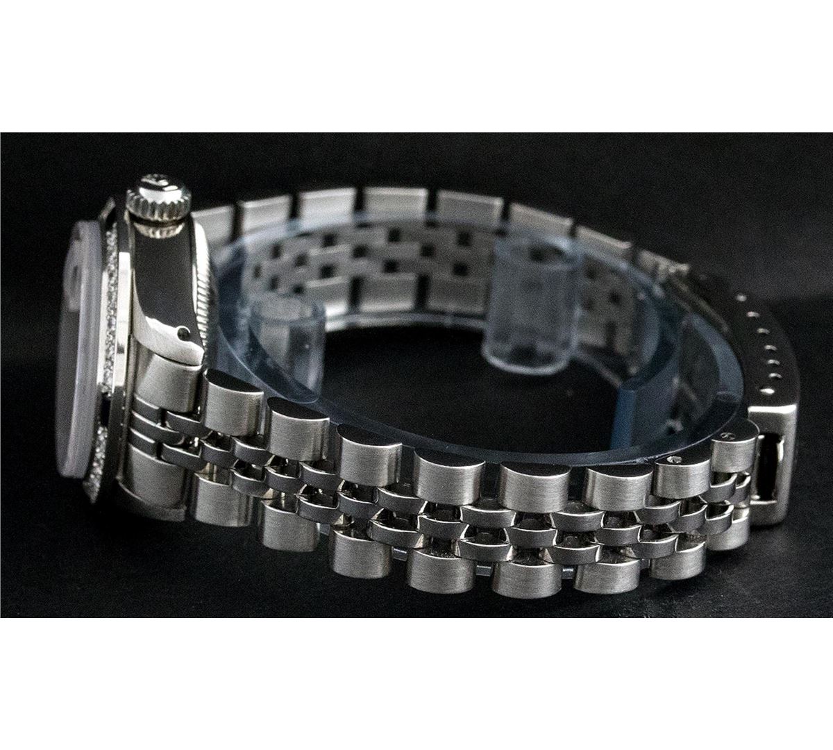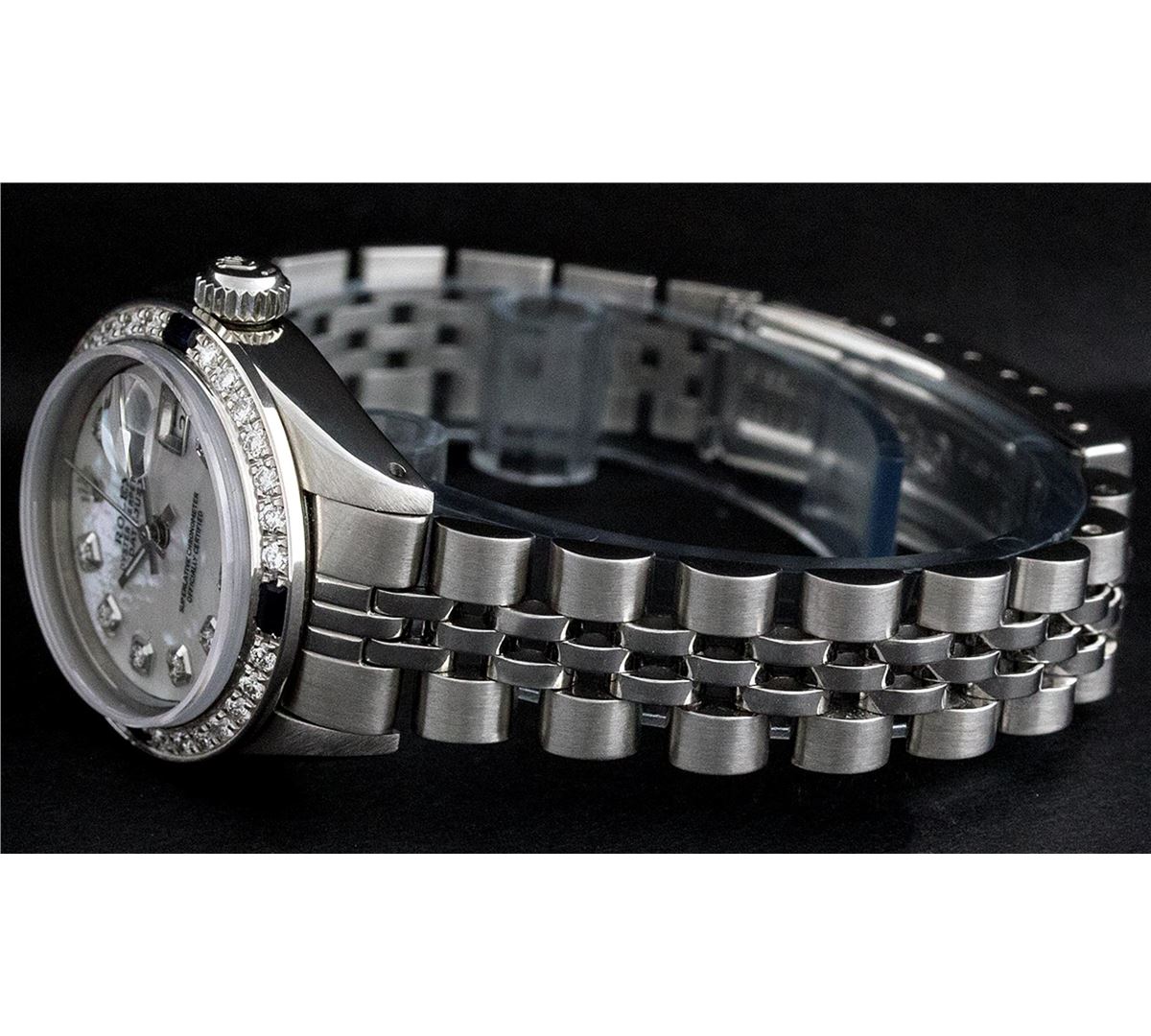 One Ladies Rolex Datejust Polished Bright with Satin Finish, Serviced & Electronically Tested, Stainless Steel Case:26mm, Stainless Steel Crown, Custom Bezel: 18K White Gold Sapphire Beadset Diamond Bezel, Diamond + Gem Count: 28 Diamonds + 4 Sapphires Total Weight .70 Carat, Clarity: SI-VS, Color: G to H. Custom Crystal: Synthetic Sapphire Cyclops Lens. Movement: Automatic Winding Movement Caliber 2030. Custom Dial: Refinished Mother Of Pearl With Diamond Hour Markers, 10 Diamond in Dial G To H In Color, Clarity: SI-VS. Date Window: 3 O'Clock Position Date Display, Model: Datejust. Condition: G-6 Extra Fine. Bracelet: Stainless Steel Jubilee. Bright Polish & Satin Finish. 6.0 Inch Length, Adjustable. Standard Clasp, With Rolex Logo. Comes with 6 month warranty.