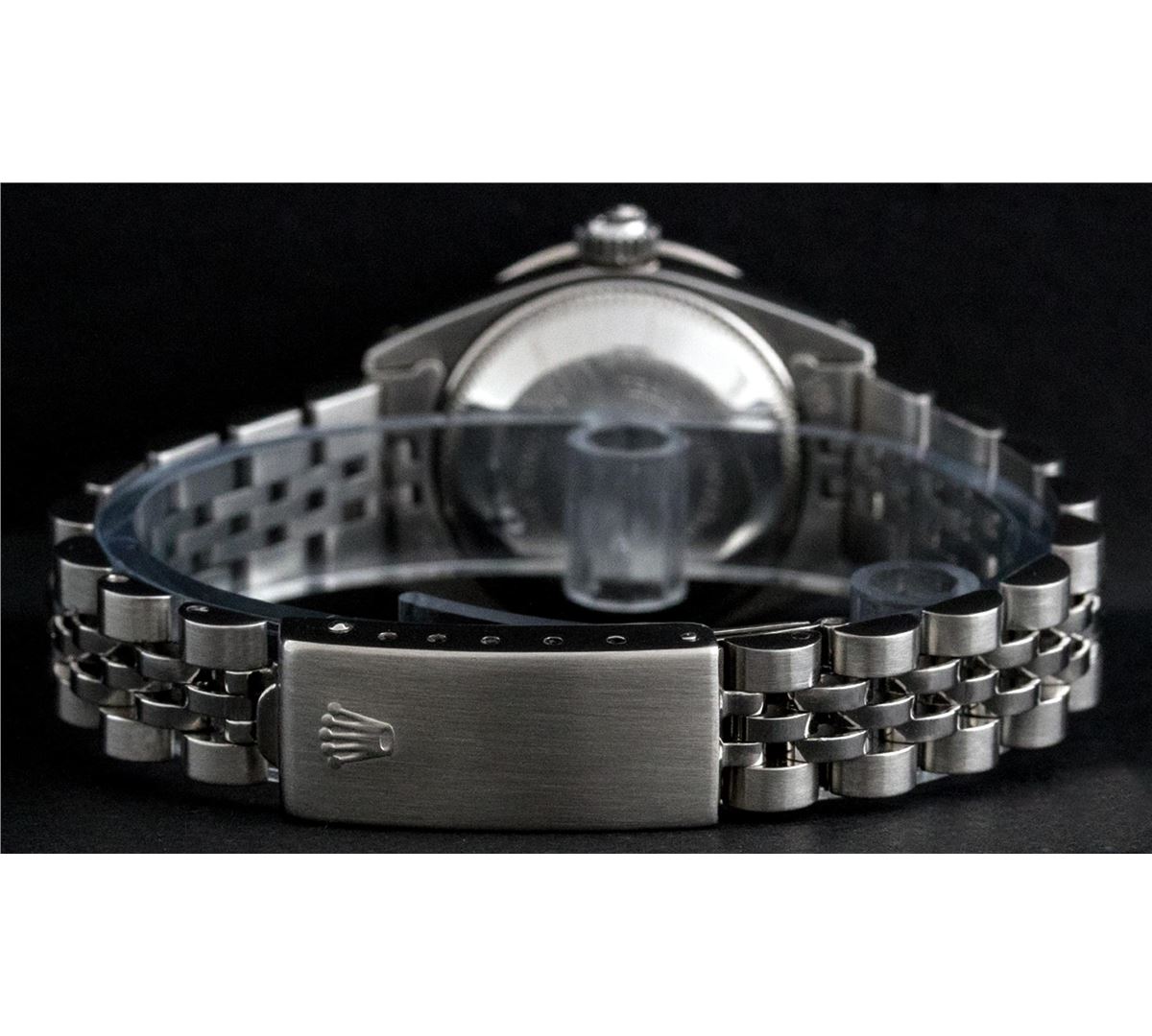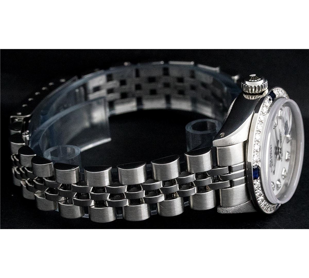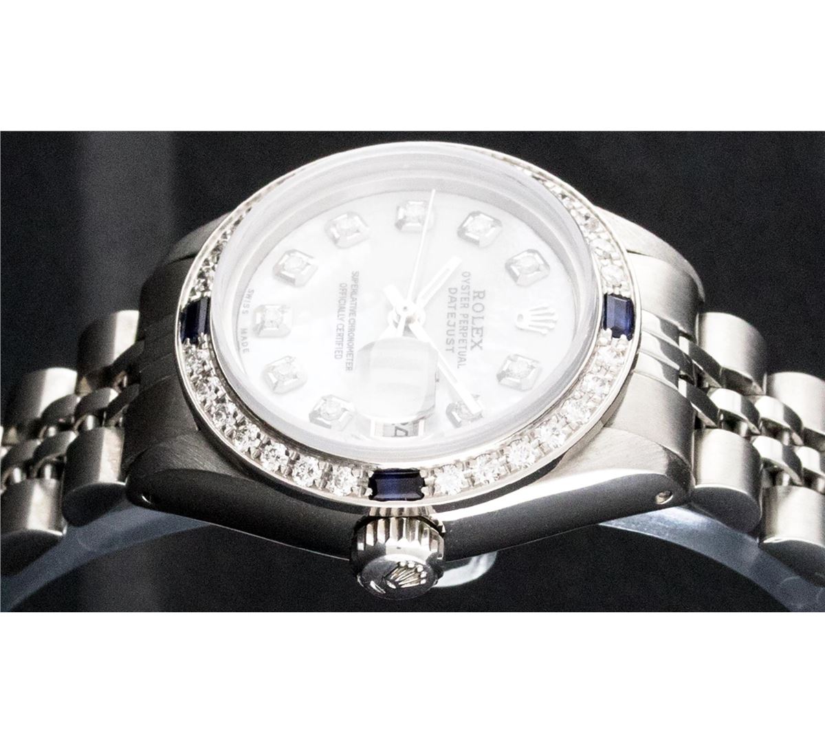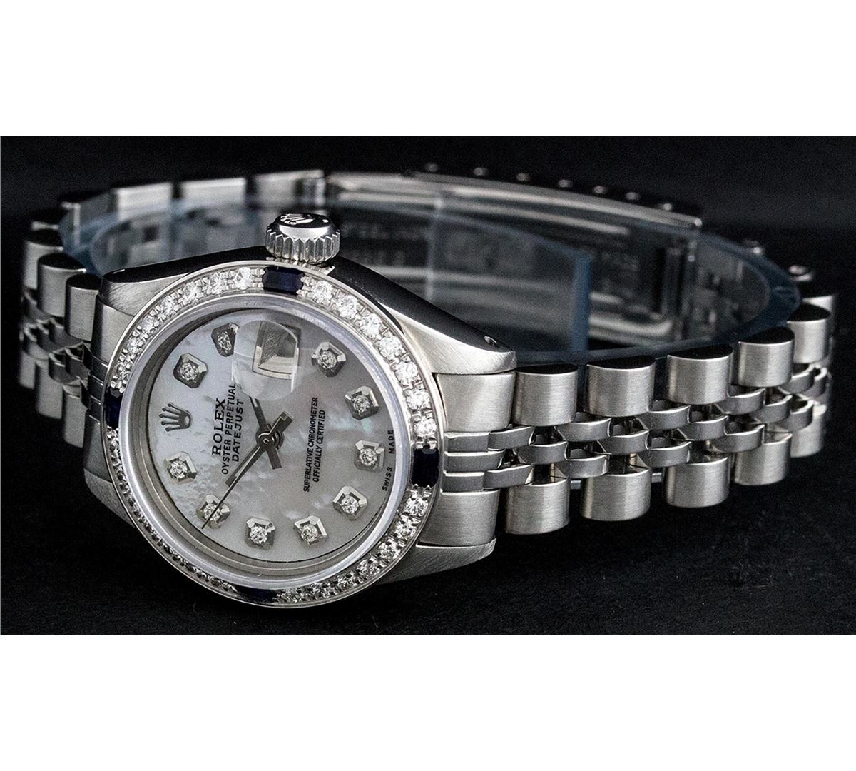 One Ladies Rolex Datejust Polished Bright with Satin Finish, Serviced & Electronically Tested, Stainless Steel Case:26mm, Stainless Steel Crown, Custom Bezel: 18K White Gold Sapphire Beadset Diamond Bezel, Diamond + Gem Count: 28 Diamonds + 4 Sapphires Total Weight .70 Carat, Clarity: SI-VS, Color: G to H. Custom Crystal: Synthetic Sapphire Cyclops Lens. Movement: Automatic Winding Movement Caliber 2030. Custom Dial: Refinished Mother Of Pearl With Diamond Hour Markers, 10 Diamond in Dial G To H In Color, Clarity: SI-VS. Date Window: 3 O'Clock Position Date Display, Model: Datejust. Condition: G-6 Extra Fine. Bracelet: Stainless Steel Jubilee. Bright Polish & Satin Finish. 6.0 Inch Length, Adjustable. Standard Clasp, With Rolex Logo. Comes with 6 month warranty.