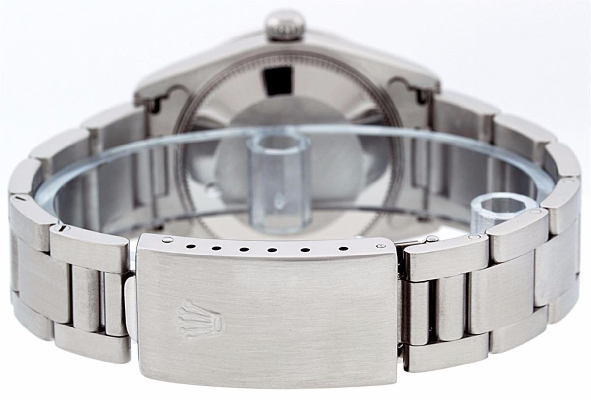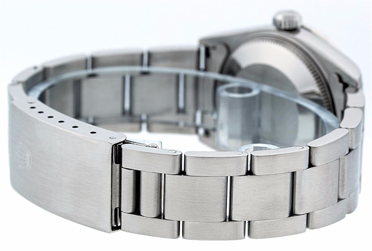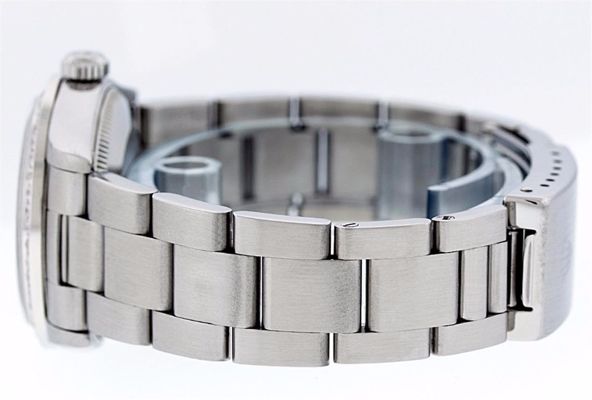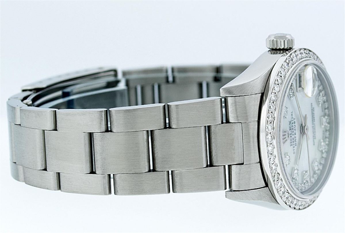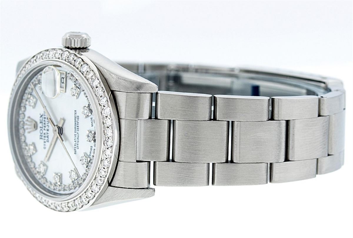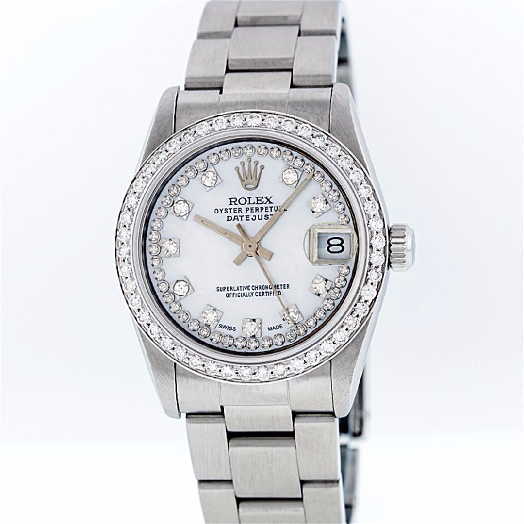 One Midsize Stainless Steel Rolex Datejust Polished, Serviced & Electronically Tested, Stainless Steel Case Case:31mm, Stainless Steel Crown, Custom Bezel: Stainless Steel Beadset Bezel, Diamond Count: 48 Diamonds, Color: G To H, Clarity: VS2-SI1. Custom Crystal: Synthetic Sapphire Cyclops Lens. Movement: Automatic Winding Movement Caliber 2135. Custom Dial: Mother Of Pearl String Diamond Dial VVS. Color: G to H, Clarity: VS2-SI1, Date Window: 3 O'Clock Position Date Display, Quickset, Model: Midsize Datejust. Condition: G-6 Extra Fine. Bracelet: Stainless Steel Oyster Band. Bright Polish. 6.0 Inch Length, Adjustable. Standard Clasp, With Rolex Logo. Comes with 6 month warranty.