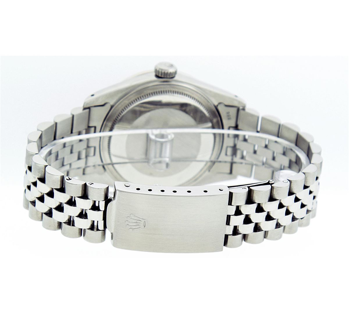 One Gents Stainless Steel Rolex Datejust Polished Bright with Satin Finish, Fully Serviced & Electronically Tested, Stainless Steel Case:36mm, Stainless Steel Crown, Custom Bezel: 18K White Gold Ruby Beadset Diamond Bezel, Diamond Count: 36 Diamonds + 4 Rubies, Total Weight 1.00 Carat, Clarity: SI-VS, Color: G to H. Custom Crystal: Synthetic Sapphire Cyclops Lens. Movement: Automatic Winding Movement Caliber 3035. Custom Dial: Meteorite Diamond Dial, 10 Diamonds in Dial, G To H In Color, Clarity: SI-VS. Date Window: 3 O'Clock Position Date Display, Quickset, Model: Datejust, Condition: G-6 Extra Fine. Bracelet: Stainless Steel Jubilee. Bright Polish & Satin Finish. 7.0 Inch Length, Adjustable. Standard Clasp, With Rolex Logo. Comes with a 6 month warranty card.