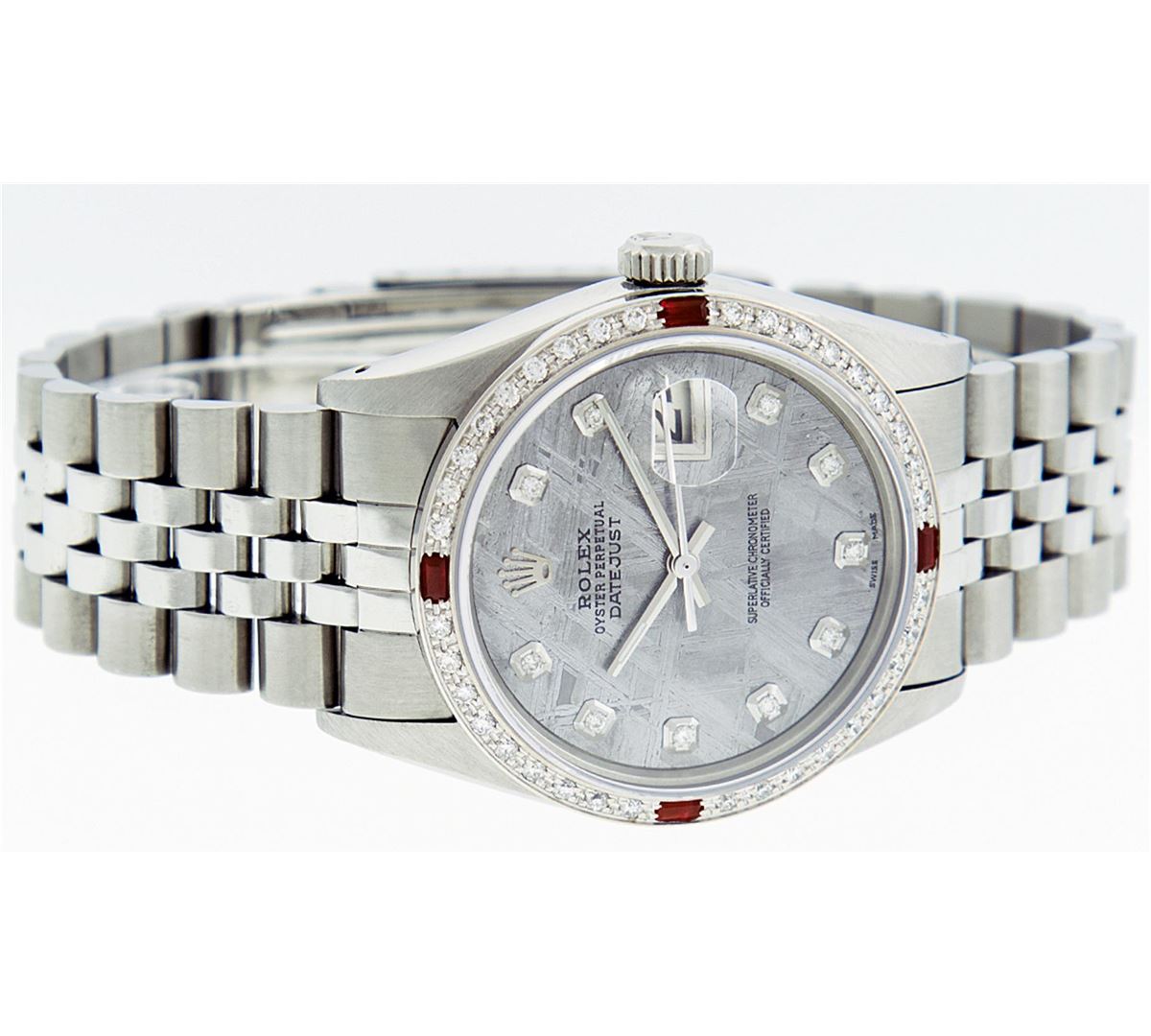 One Gents Stainless Steel Rolex Datejust Polished Bright with Satin Finish, Fully Serviced & Electronically Tested, Stainless Steel Case:36mm, Stainless Steel Crown, Custom Bezel: 18K White Gold Ruby Beadset Diamond Bezel, Diamond Count: 36 Diamonds + 4 Rubies, Total Weight 1.00 Carat, Clarity: SI-VS, Color: G to H. Custom Crystal: Synthetic Sapphire Cyclops Lens. Movement: Automatic Winding Movement Caliber 3035. Custom Dial: Meteorite Diamond Dial, 10 Diamonds in Dial, G To H In Color, Clarity: SI-VS. Date Window: 3 O'Clock Position Date Display, Quickset, Model: Datejust, Condition: G-6 Extra Fine. Bracelet: Stainless Steel Jubilee. Bright Polish & Satin Finish. 7.0 Inch Length, Adjustable. Standard Clasp, With Rolex Logo. Comes with a 6 month warranty card.