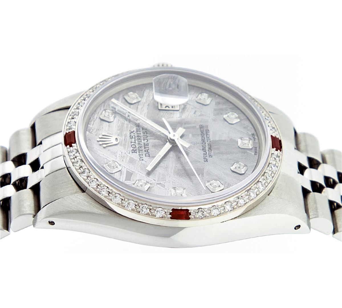 One Gents Stainless Steel Rolex Datejust Polished Bright with Satin Finish, Fully Serviced & Electronically Tested, Stainless Steel Case:36mm, Stainless Steel Crown, Custom Bezel: 18K White Gold Ruby Beadset Diamond Bezel, Diamond Count: 36 Diamonds + 4 Rubies, Total Weight 1.00 Carat, Clarity: SI-VS, Color: G to H. Custom Crystal: Synthetic Sapphire Cyclops Lens. Movement: Automatic Winding Movement Caliber 3035. Custom Dial: Meteorite Diamond Dial, 10 Diamonds in Dial, G To H In Color, Clarity: SI-VS. Date Window: 3 O'Clock Position Date Display, Quickset, Model: Datejust, Condition: G-6 Extra Fine. Bracelet: Stainless Steel Jubilee. Bright Polish & Satin Finish. 7.0 Inch Length, Adjustable. Standard Clasp, With Rolex Logo. Comes with a 6 month warranty card.