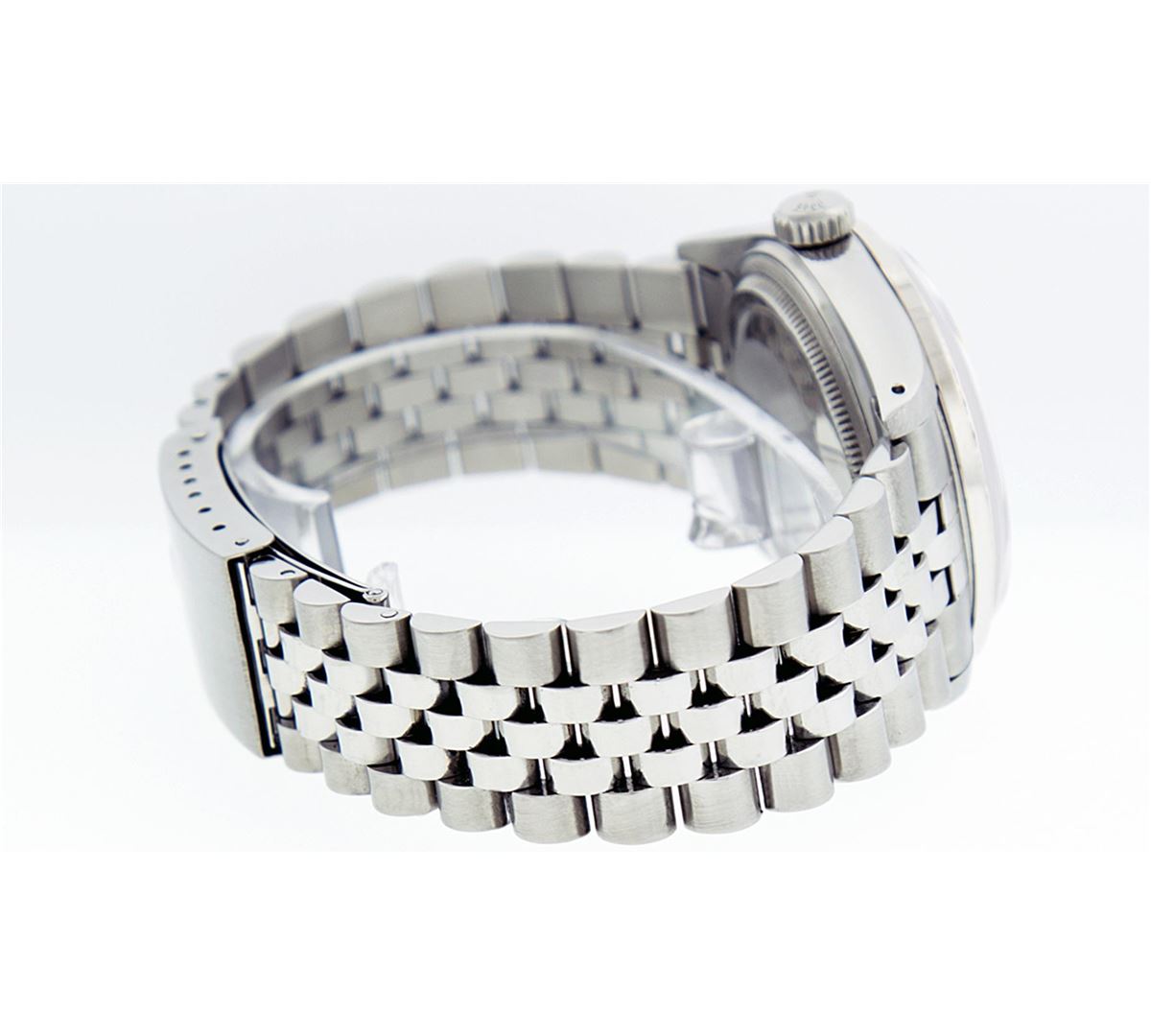 One Gents Stainless Steel Rolex Datejust Polished Bright with Satin Finish, Fully Serviced & Electronically Tested, Stainless Steel Case:36mm, Stainless Steel Crown, Custom Bezel: 18K White Gold Ruby Beadset Diamond Bezel, Diamond Count: 36 Diamonds + 4 Rubies, Total Weight 1.00 Carat, Clarity: SI-VS, Color: G to H. Custom Crystal: Synthetic Sapphire Cyclops Lens. Movement: Automatic Winding Movement Caliber 3035. Custom Dial: Meteorite Diamond Dial, 10 Diamonds in Dial, G To H In Color, Clarity: SI-VS. Date Window: 3 O'Clock Position Date Display, Quickset, Model: Datejust, Condition: G-6 Extra Fine. Bracelet: Stainless Steel Jubilee. Bright Polish & Satin Finish. 7.0 Inch Length, Adjustable. Standard Clasp, With Rolex Logo. Comes with a 6 month warranty card.