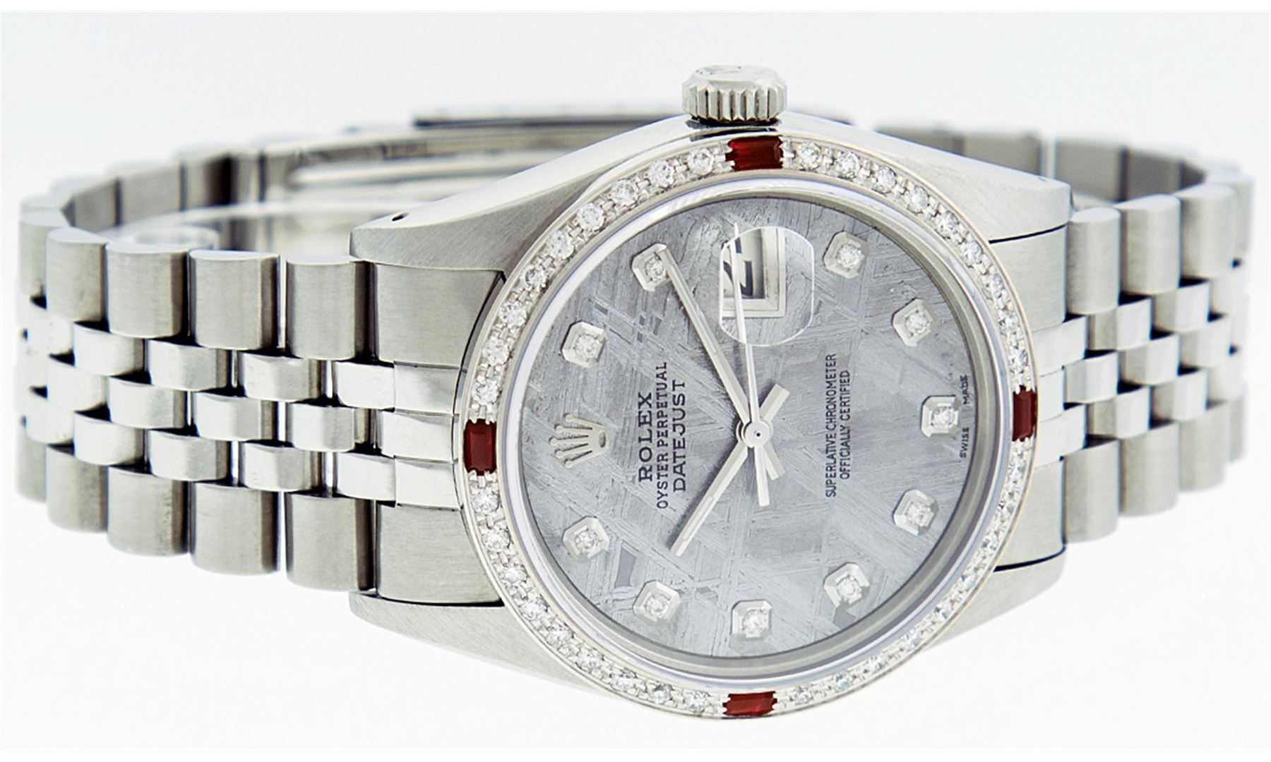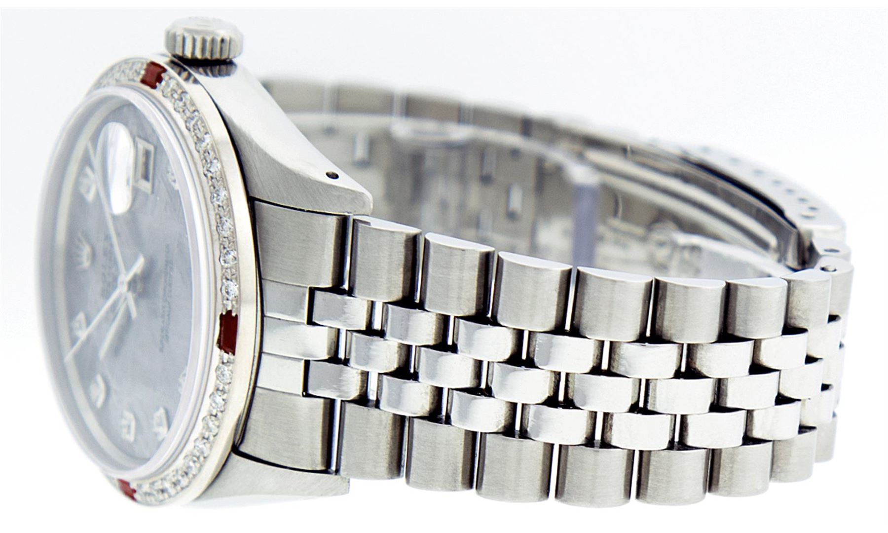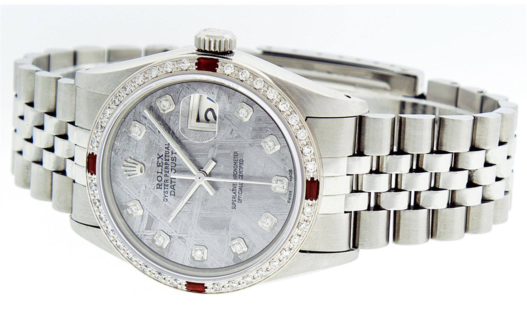 One Gents Stainless Steel Rolex Datejust Polished Bright with Satin Finish, Fully Serviced & Electronically Tested, Stainless Steel Case:36mm, Stainless Steel Crown, Custom Bezel: 18K White Gold Ruby Beadset Diamond Bezel, Diamond Count: 36 Diamonds + 4 Rubies, Total Weight 1.00 Carat, Clarity: SI-VS, Color: G to H. Custom Crystal: Synthetic Sapphire Cyclops Lens. Movement: Automatic Winding Movement Caliber 3035. Custom Dial: Meteorite Diamond Dial, 10 Diamonds in Dial, G To H In Color, Clarity: SI-VS. Date Window: 3 O'Clock Position Date Display, Quickset, Model: Datejust, Condition: G-6 Extra Fine. Bracelet: Stainless Steel Jubilee. Bright Polish & Satin Finish. 7.0 Inch Length, Adjustable. Standard Clasp, With Rolex Logo. Comes with a 6 month warranty card.