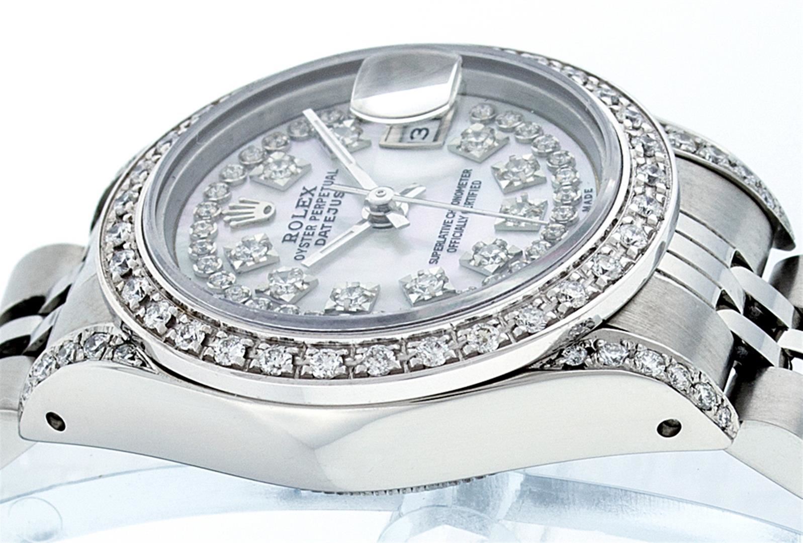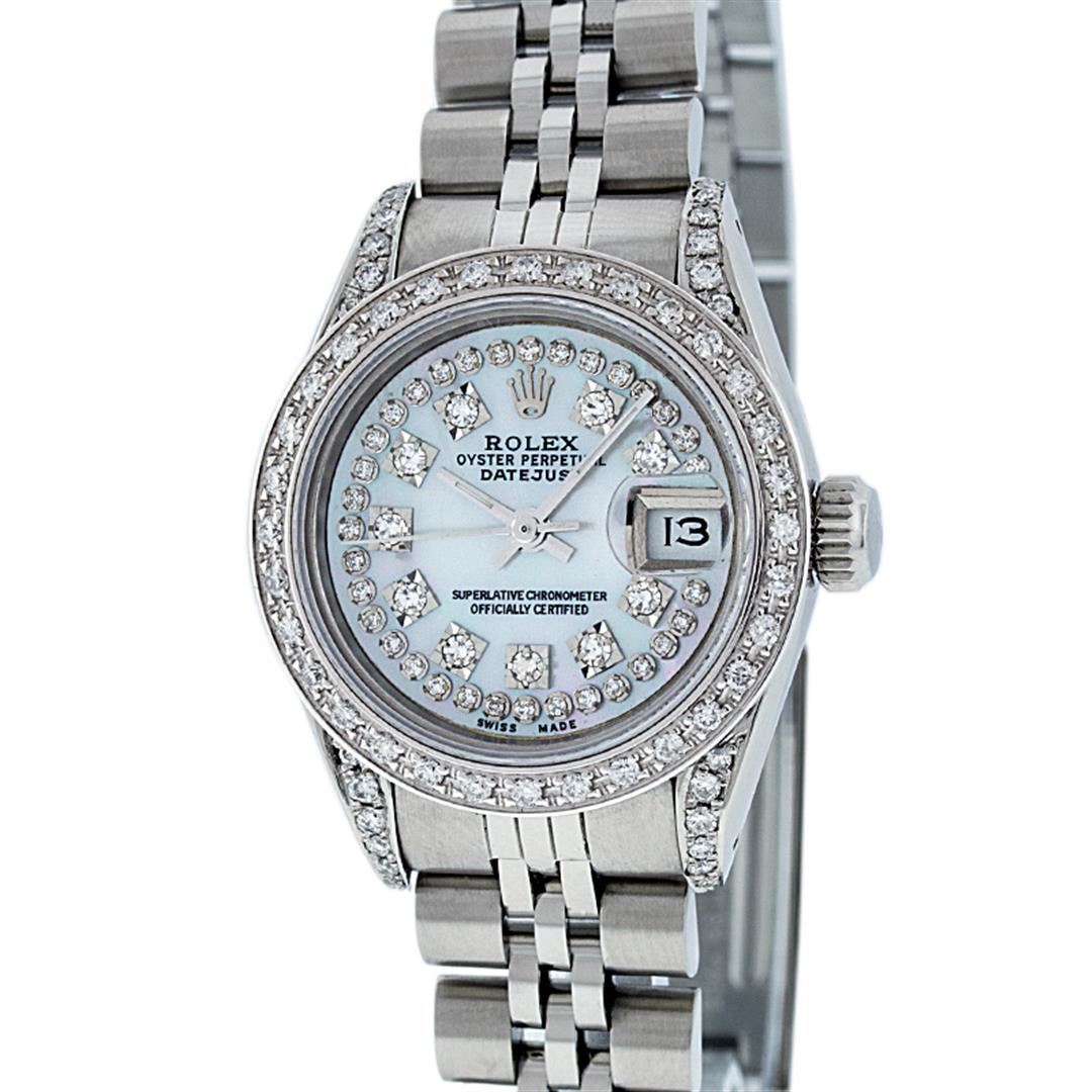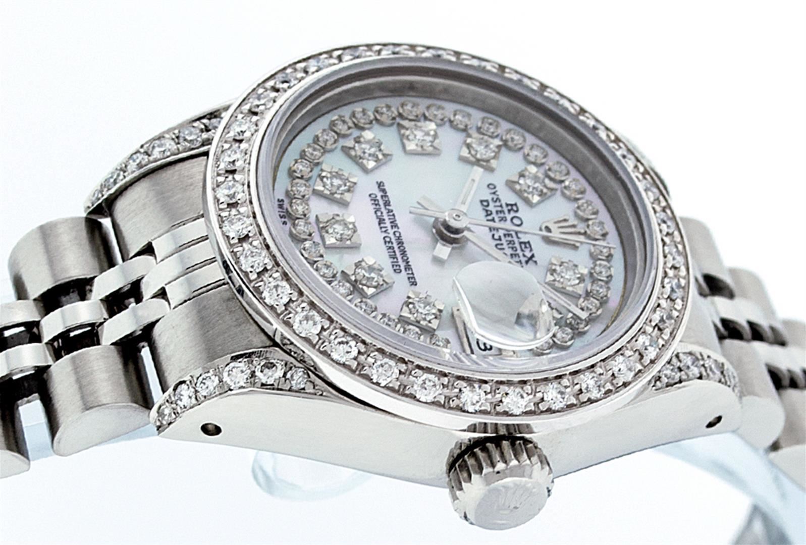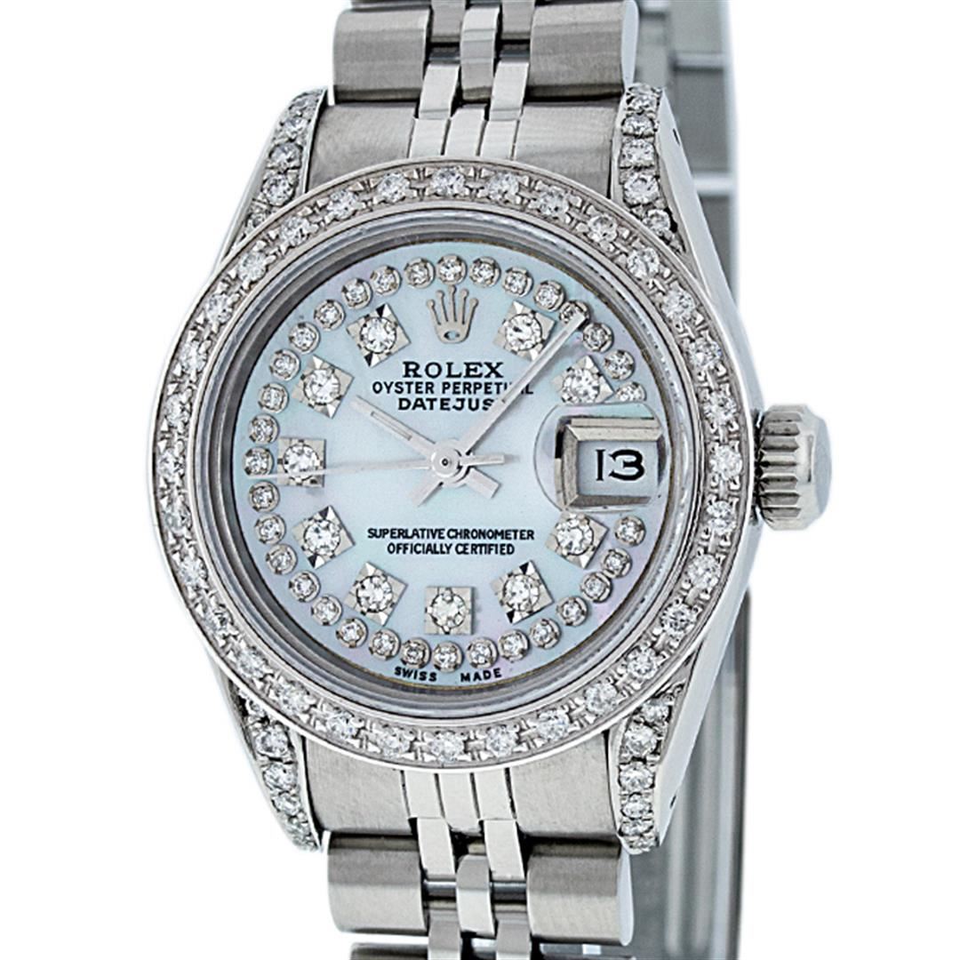One Ladies Rolex Datejust Polished Bright with Satin Finish, Serviced & Electronically Tested, Stainless Steel Case:26mm, Stainless Steel Crown, Diamond Lugs: 16 Diamonds On Lugs, Clarity: SI-VS, Color: G to H. Custom Bezel: 18K White Gold Beadset Bezel, Diamond Count: 32 Diamonds, Total Weight 1.00 Carat, Clarity: SI-VS, Color: G to H. Custom Crystal: Synthetic Sapphire Cyclops Lens. Movement: Automatic Winding Movement Caliber 2030. Custom Dial: Refinished Mother Of Pearl With String Diamond Dial, 43 Diamonds in Dial G To H In Color, Clarity: VS. Date Window: 3 O'Clock Position Date Display, Model: Datejust. Condition: G-6 Extra Fine. Bracelet: Stainless Steel Jubilee. Bright Polish & Satin Finish. 6.0 Inch Length, Adjustable. Standard Clasp, With Rolex Logo. Total Diamond Weight: 1.25 CTW