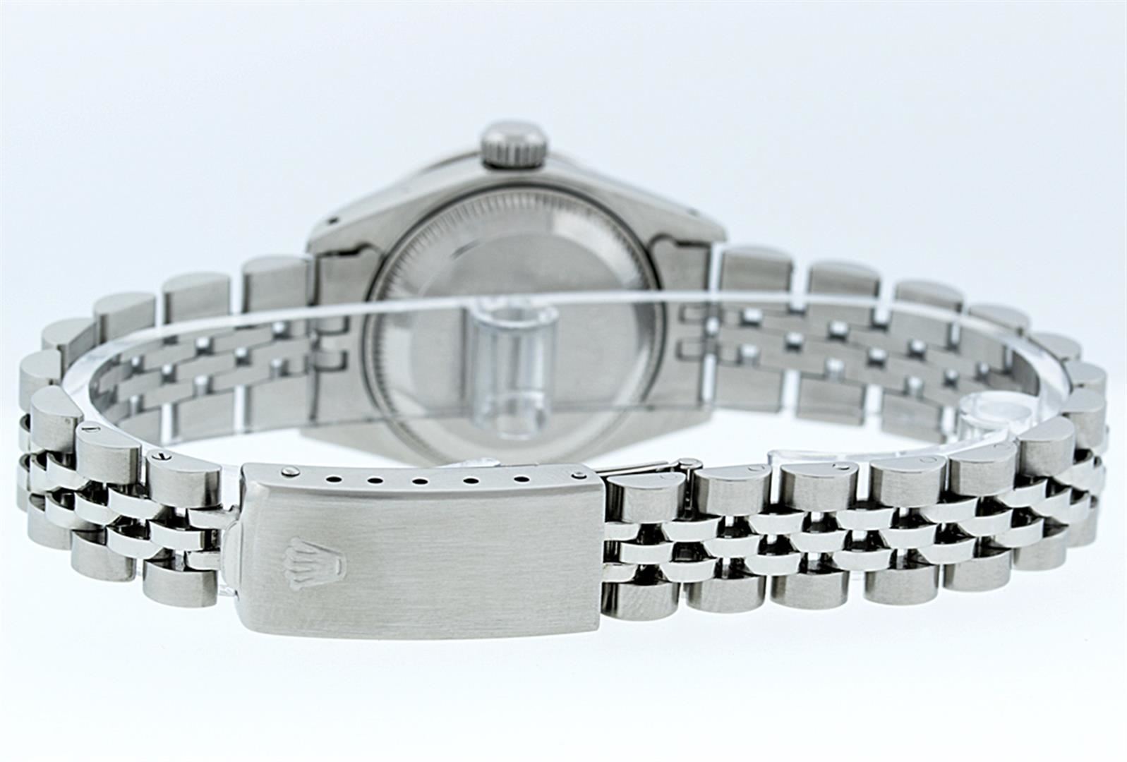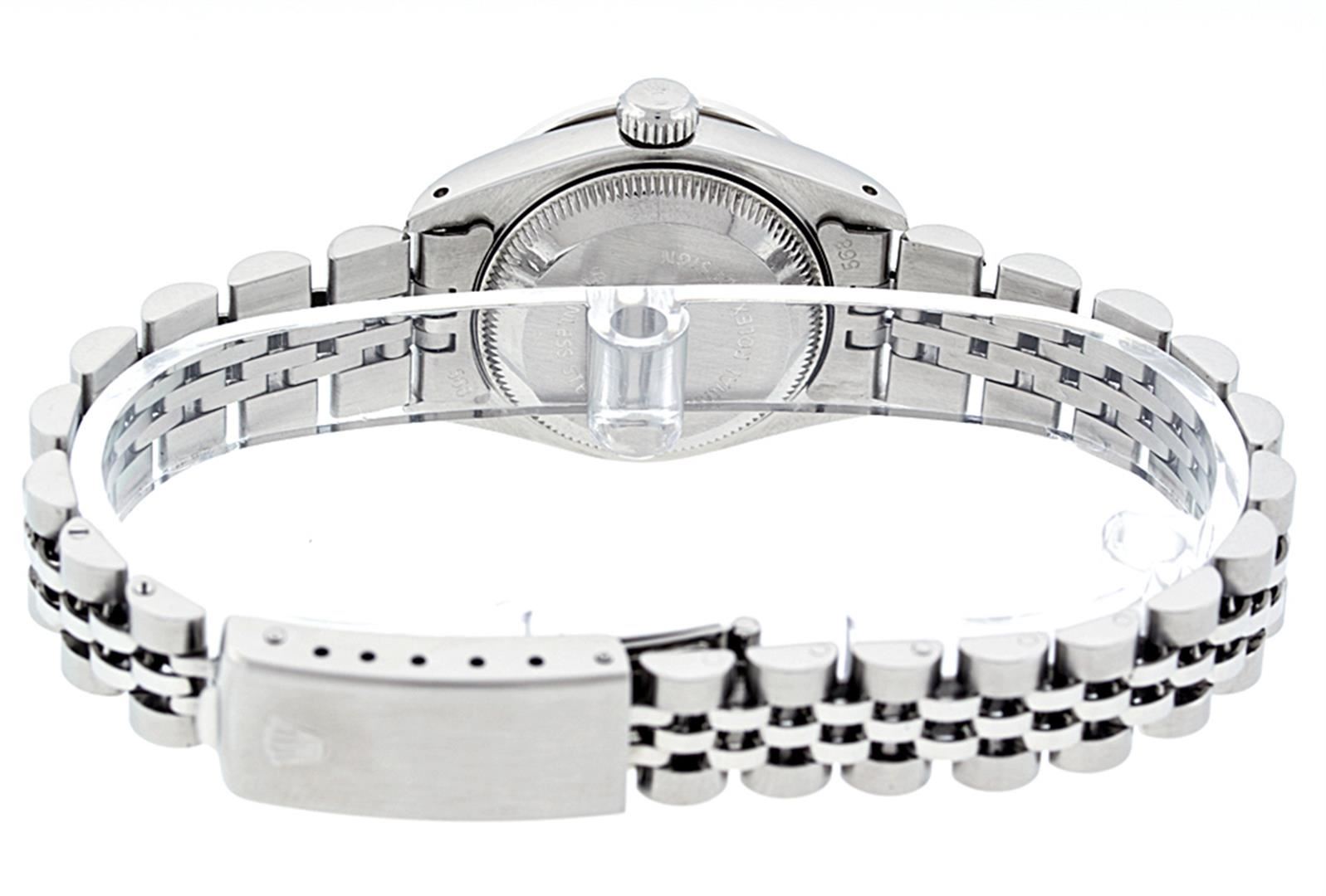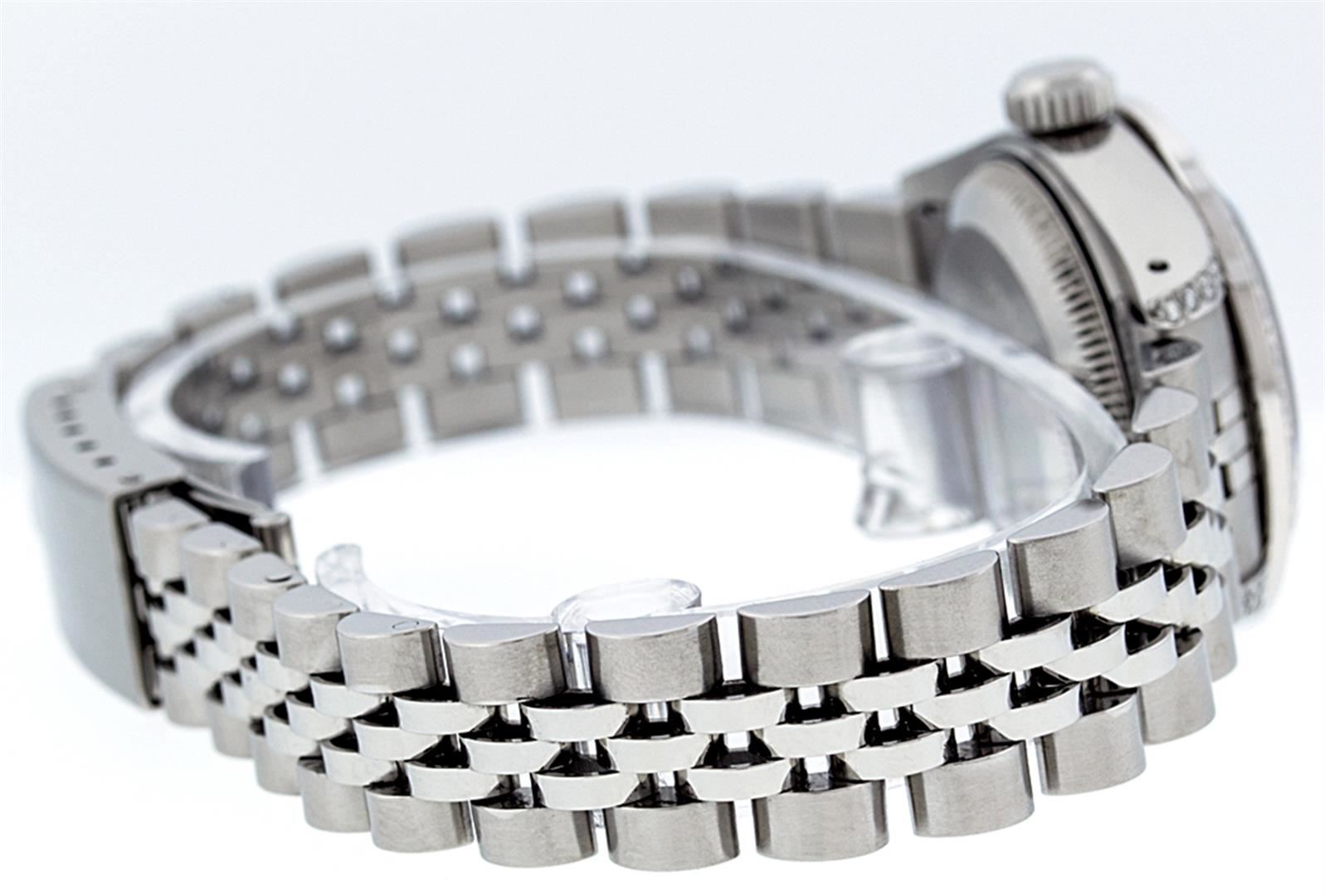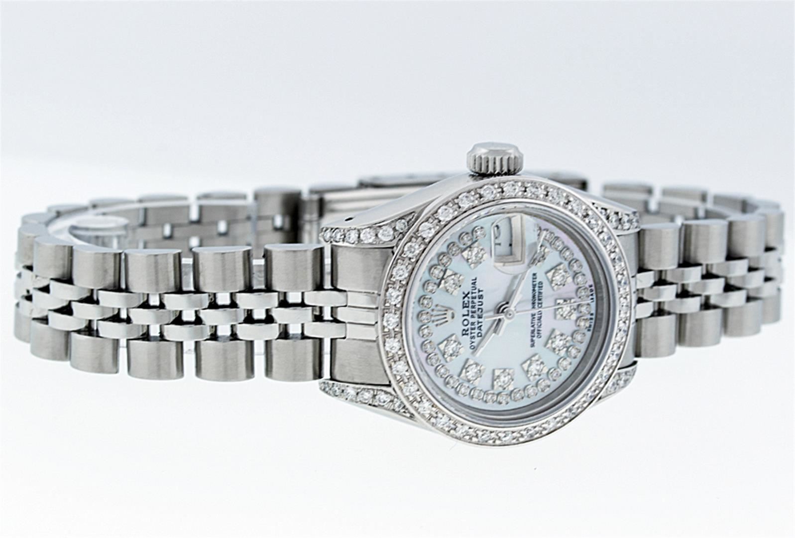 One Ladies Rolex Datejust Polished Bright with Satin Finish, Serviced & Electronically Tested, Stainless Steel Case:26mm, Stainless Steel Crown, Diamond Lugs: 16 Diamonds On Lugs, Clarity: SI-VS, Color: G to H. Custom Bezel: 18K White Gold Beadset Bezel, Diamond Count: 32 Diamonds, Total Weight 1.00 Carat, Clarity: SI-VS, Color: G to H. Custom Crystal: Synthetic Sapphire Cyclops Lens. Movement: Automatic Winding Movement Caliber 2030. Custom Dial: Refinished Mother Of Pearl With String Diamond Dial, 43 Diamonds in Dial G To H In Color, Clarity: VS. Date Window: 3 O'Clock Position Date Display, Model: Datejust. Condition: G-6 Extra Fine. Bracelet: Stainless Steel Jubilee. Bright Polish & Satin Finish. 6.0 Inch Length, Adjustable. Standard Clasp, With Rolex Logo. Total Diamond Weight: 1.25 CTW