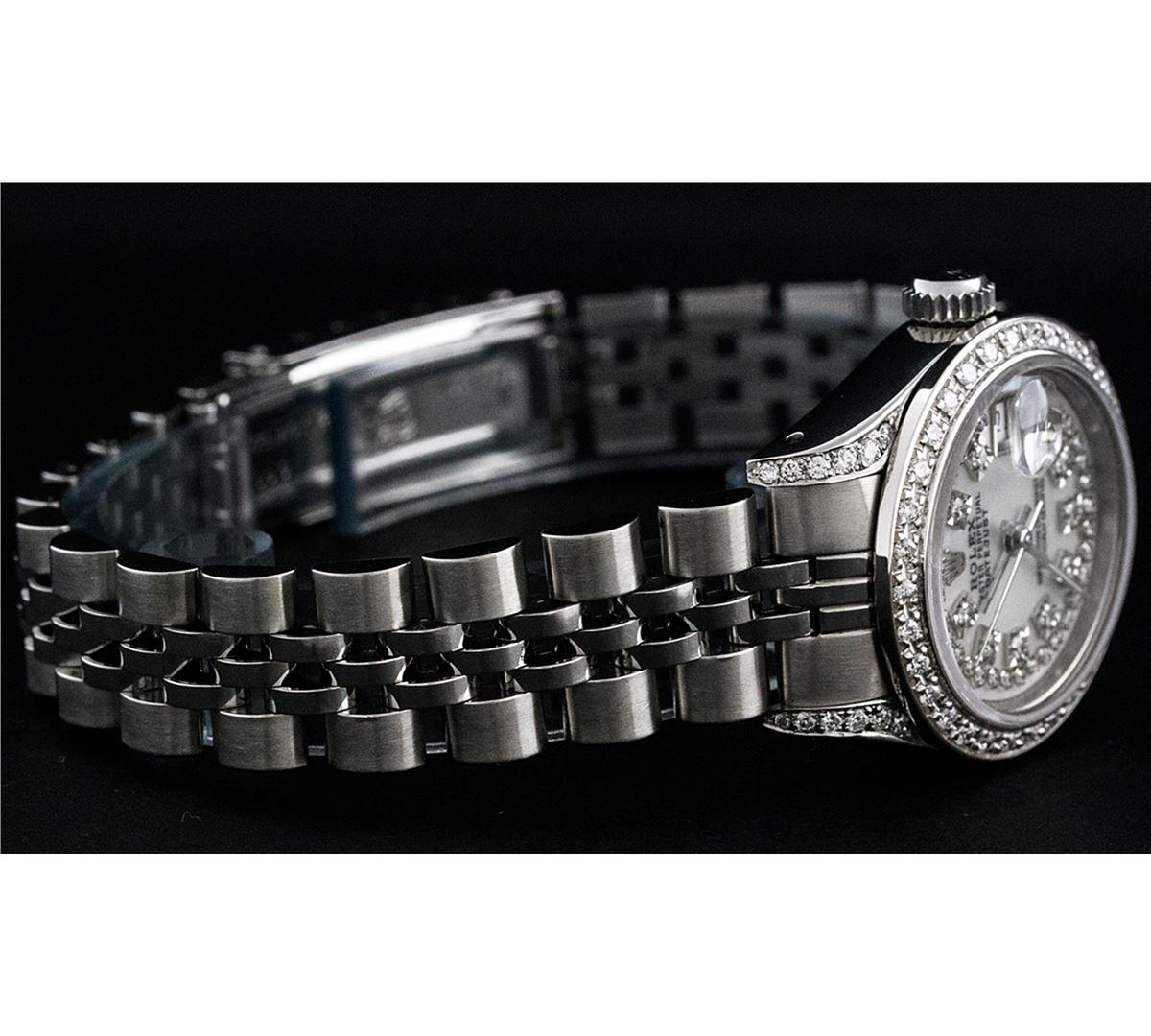 One Ladies Rolex Datejust Polished Bright with Satin Finish, Serviced & Electronically Tested, Stainless Steel Case:26mm, Stainless Steel Crown, Diamond Lugs: 16 Diamonds On Lugs, Clarity: SI-VS, Color: G to H. Custom Bezel: 18K White Gold Beadset Bezel, Diamond Count: 32 Diamonds, Total Weight 1.00 Carat, Clarity: SI-VS, Color: G to H. Custom Crystal: Synthetic Sapphire Cyclops Lens. Movement: Automatic Winding Movement Caliber 2030. Custom Dial: Refinished Mother Of Pearl With String Diamond Dial, 43 Diamonds in Dial G To H In Color, Clarity: VVS. Date Window: 3 O'Clock Position Date Display, Non Quickset, Model: 6917 Condition: G-6 Extra Fine. Bracelet: Stainless Steel Jubilee. Bright Polish & Satin Finish. 5.5 Inch Length, Adjustable. Standard Clasp, With Rolex Logo. Total Diamond Weight: 1.25 CTW