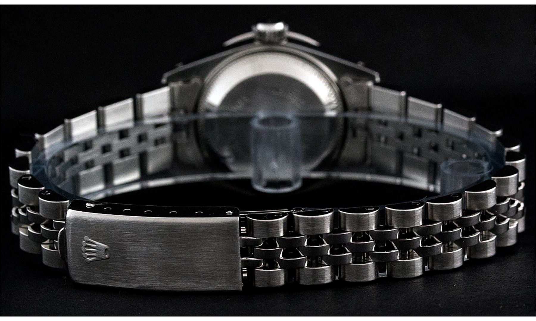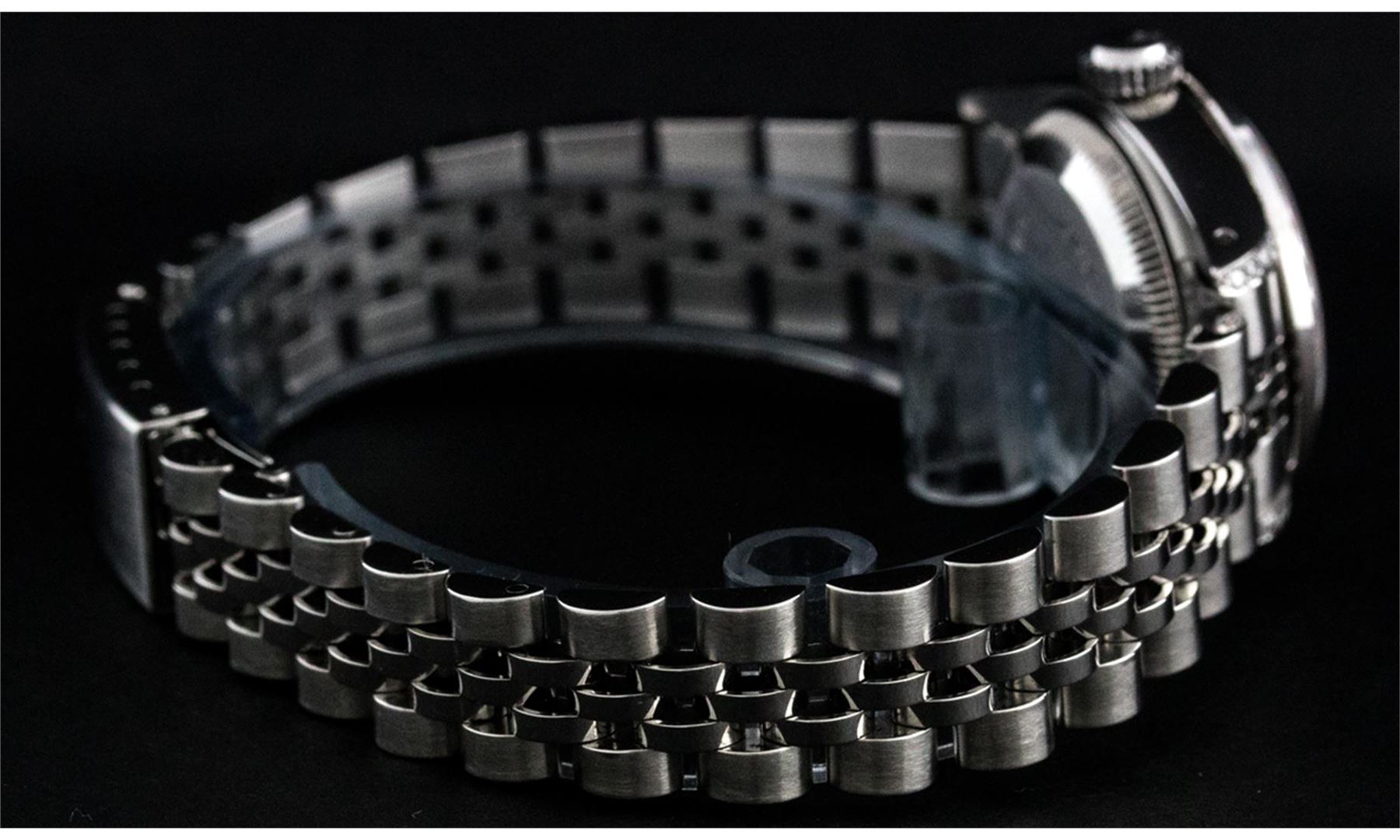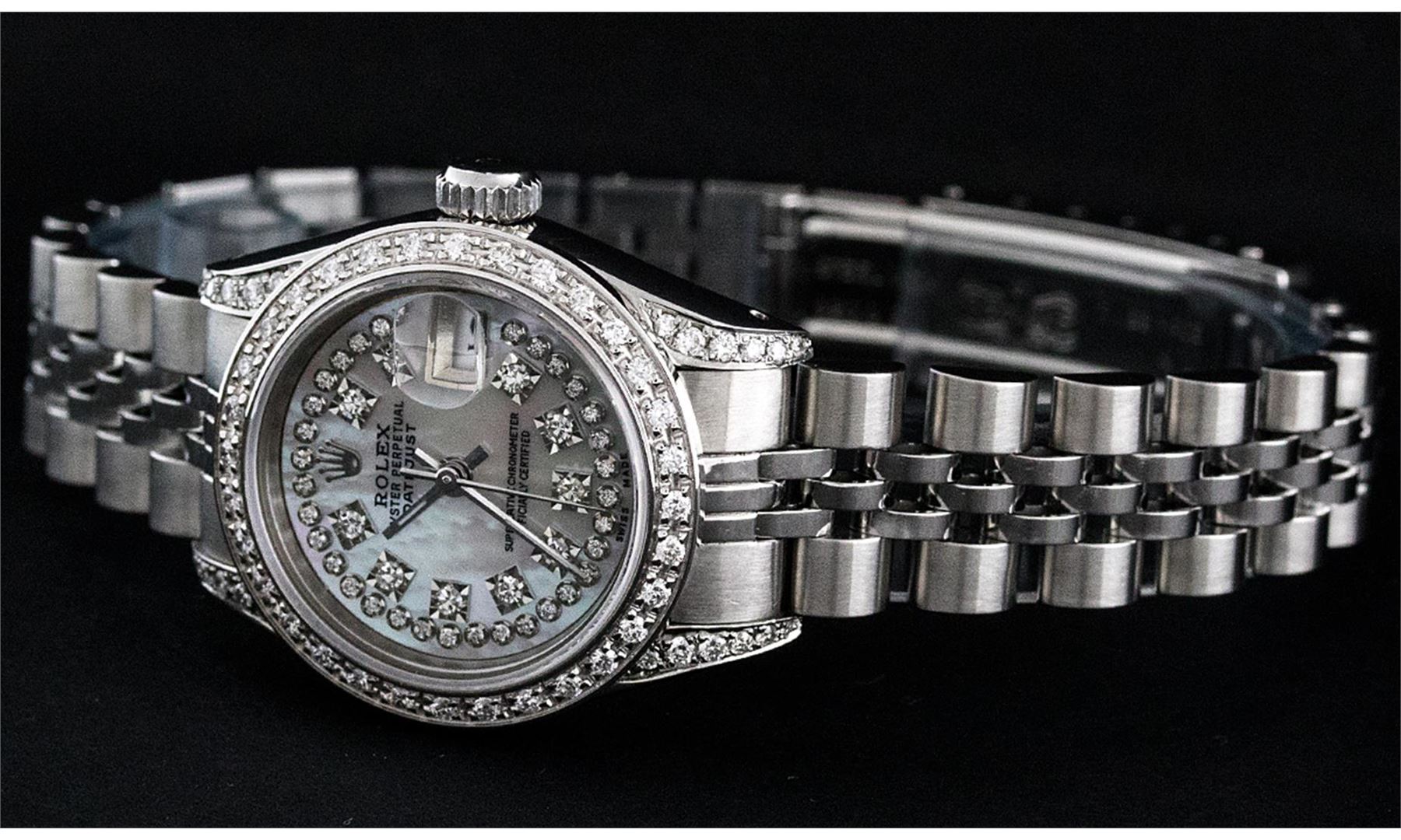One Ladies Rolex Datejust Polished Bright with Satin Finish, Serviced & Electronically Tested, Stainless Steel Case:26mm, Stainless Steel Crown, Diamond Lugs: 16 Diamonds On Lugs, Clarity: SI-VS, Color: G to H. Custom Bezel: 18K White Gold Beadset Bezel, Diamond Count: 32 Diamonds, Total Weight 1.00 Carat, Clarity: SI-VS, Color: G to H. Custom Crystal: Synthetic Sapphire Cyclops Lens. Movement: Automatic Winding Movement Caliber 2030. Custom Dial: Refinished Mother Of Pearl With String Diamond Dial, 43 Diamonds in Dial G To H In Color, Clarity: VVS. Date Window: 3 O'Clock Position Date Display, Non Quickset, Model: 6917 Condition: G-6 Extra Fine. Bracelet: Stainless Steel Jubilee. Bright Polish & Satin Finish. 5.5 Inch Length, Adjustable. Standard Clasp, With Rolex Logo. Total Diamond Weight: 1.25 CTW