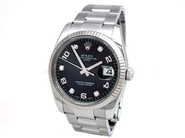 Rolex Stainless Steel Oyster Perpetual Date Watch **|**|** 34mm Gents Rolex Stainless Steel Oyster Perpetual Date Watch. Black Arabic Diamond Dial. 18K White Gold Fluted Bezel. Stainless Steel Oyster Band. Style 115234. ; MSRP: $9700