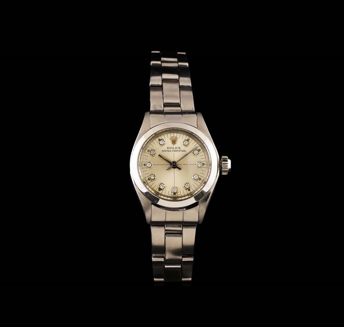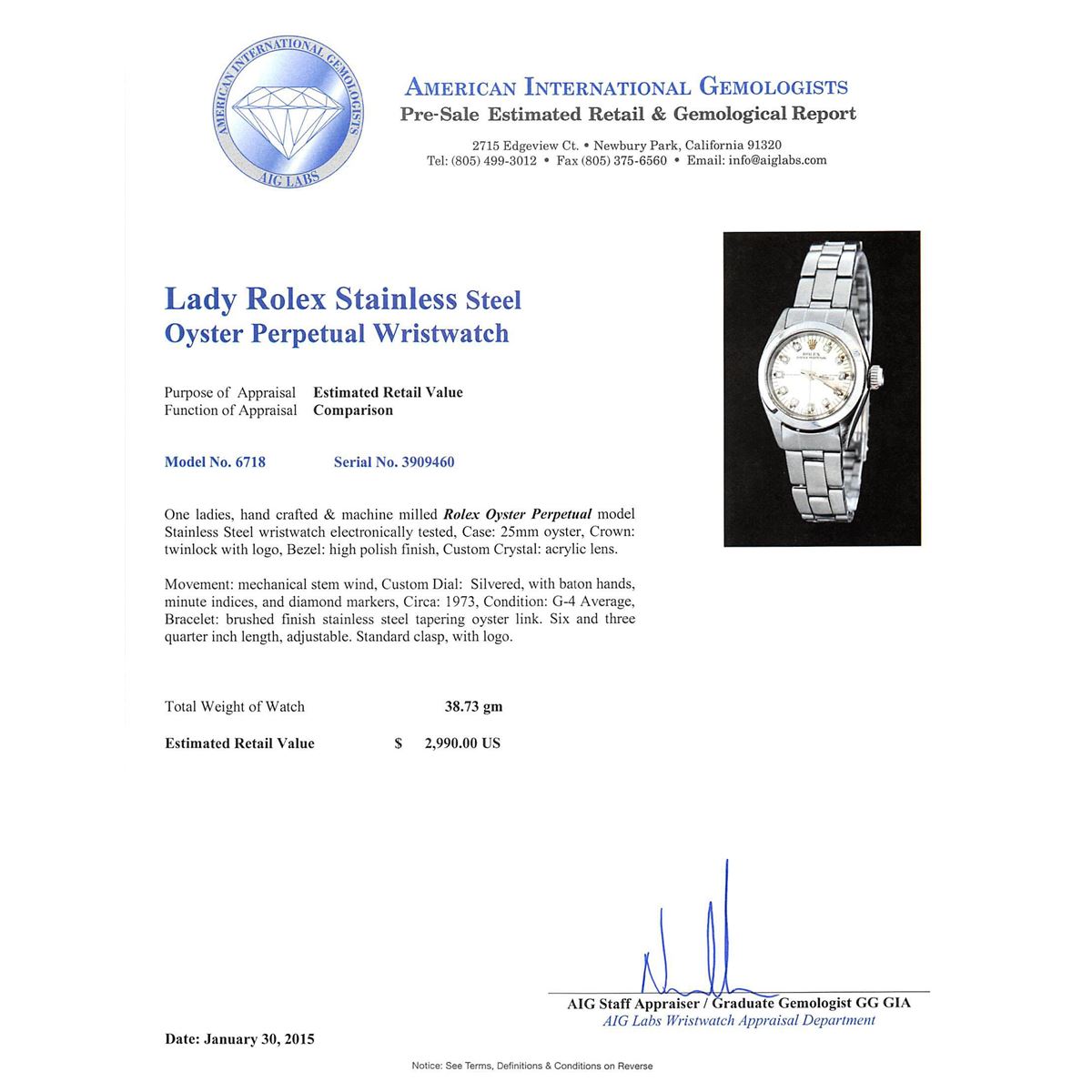 One ladies, hand crafted & machine milled Rolex Oyster Perpetual model Stainless Steel wristwatch electronically tested, Case: 25mm oyster, Crown: twinlock with logo, Bezel: high polish finish, Custom Crystal: acrylic lens. Movement: mechanical stem wind, Custom Dial: Silvered, with baton hands, minute indices, and diamond markers, Circa: 1973, Condition: G-4 Average, Bracelet: brushed finish stainless steel tapering oyster link. Six and three quarter inch length, adjustable. Standard clasp, with logo. Total Weight of Watch 38.73 grams. AIG Appraised at $2,990.00.